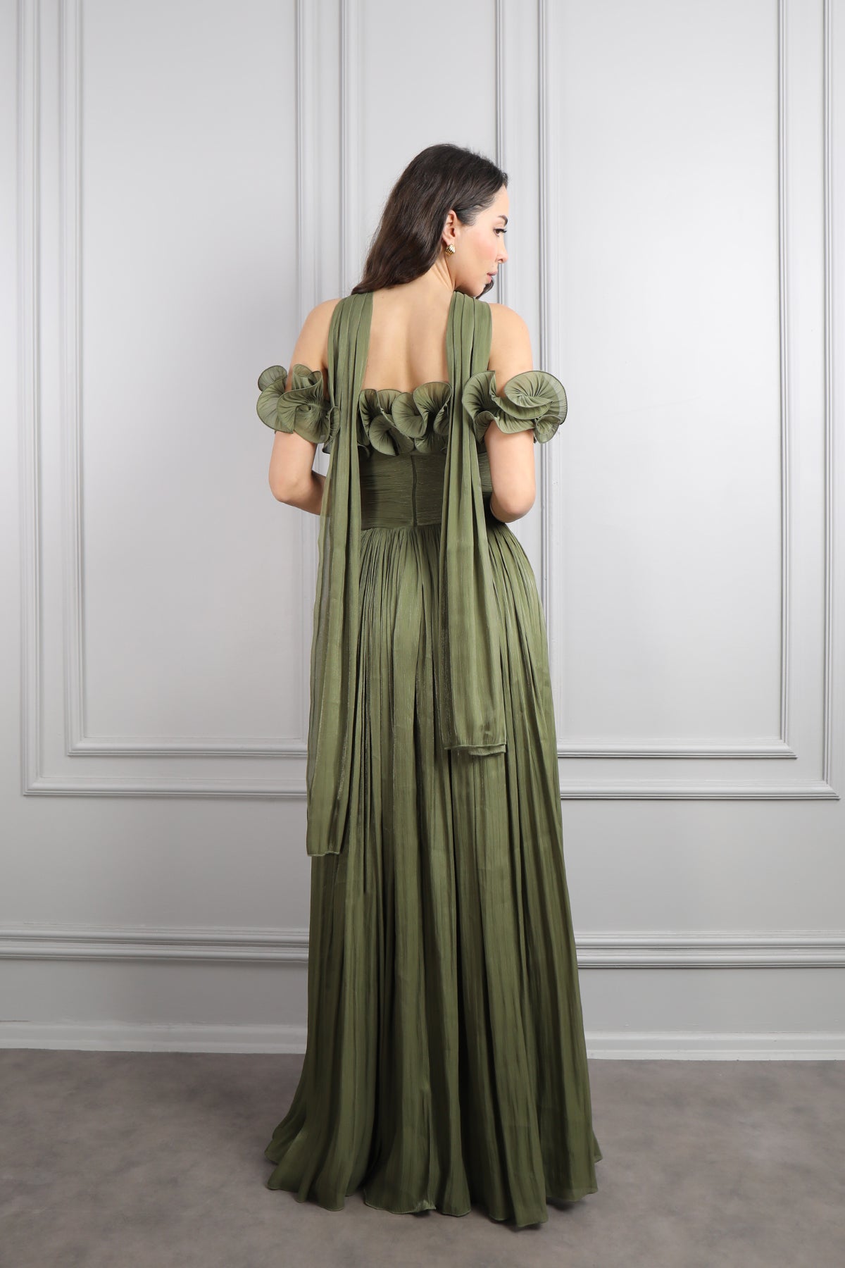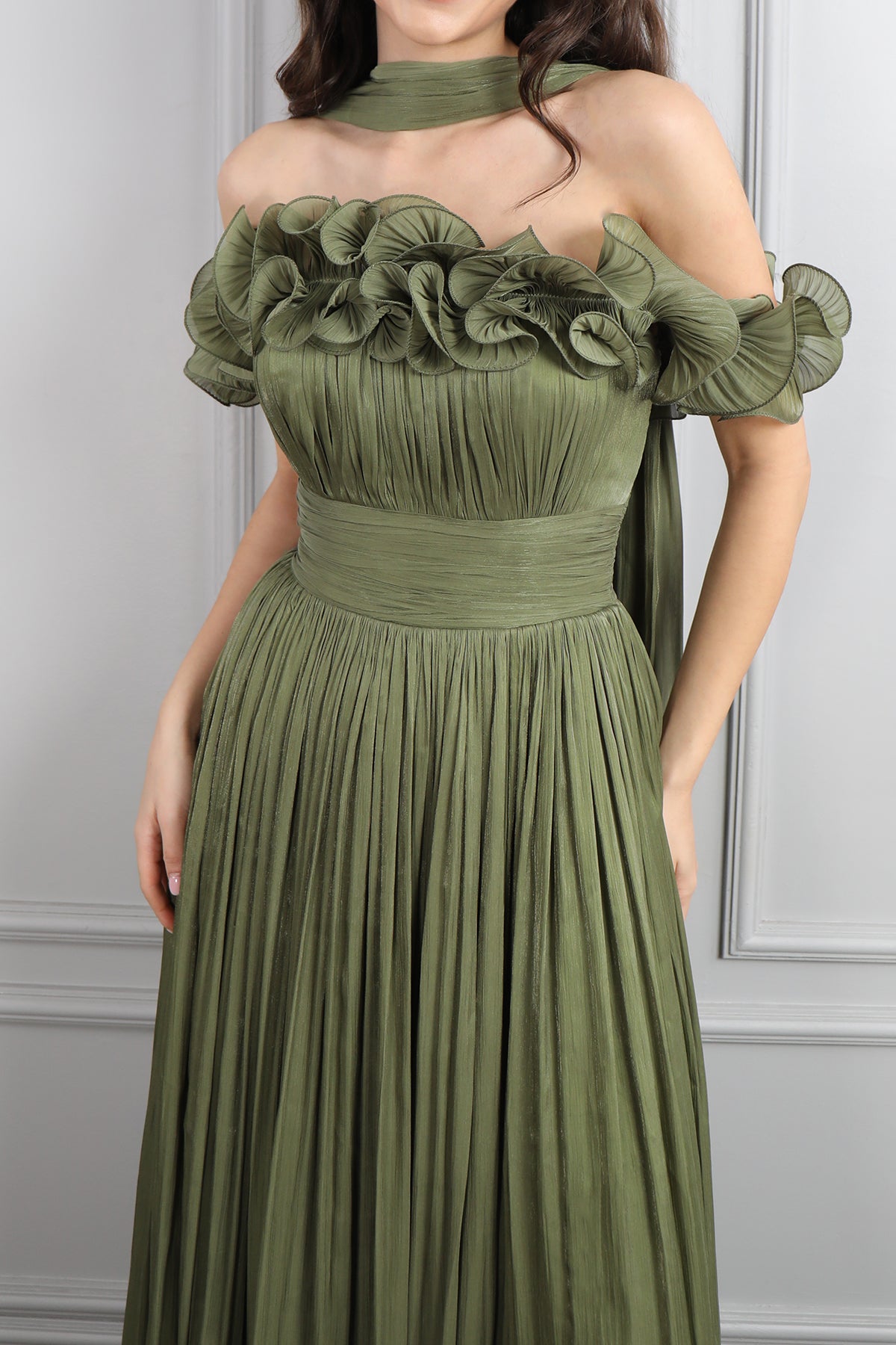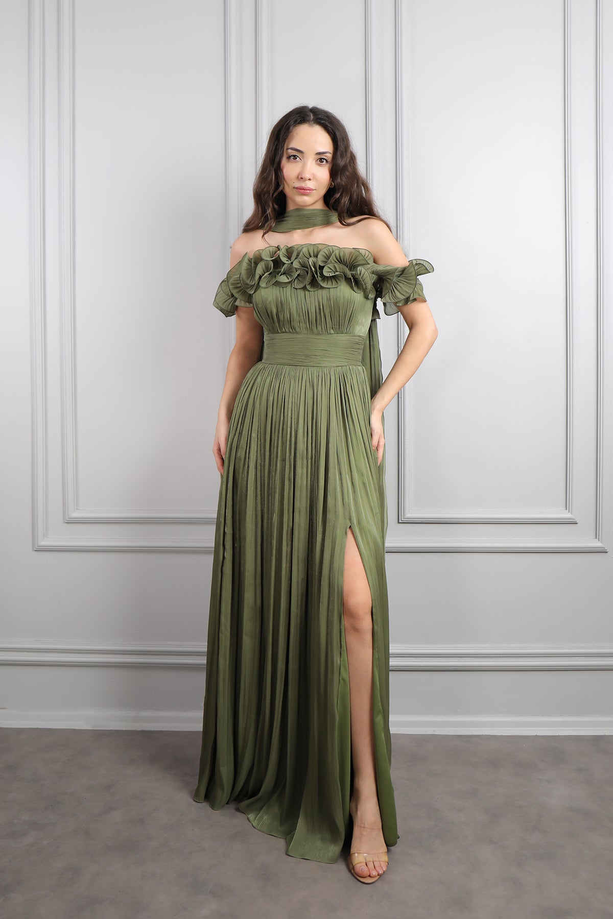 Kayık Yaka Volanlı Fular Detaylı Şifon Abiye Haki