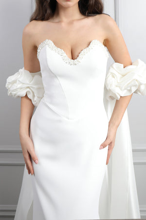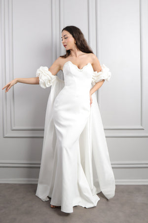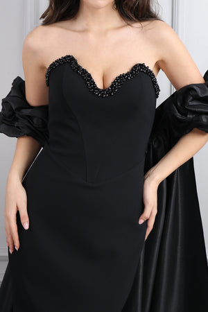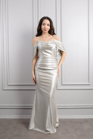Zarif ve modern çizgileriyle öne çıkan kayık yaka volanlı fular detaylı şifon abiye, doğallığın asaletiyle şıklığı bir araya getiriyor. Kayık yaka tasarımı, omuz hattını zarifçe ön plana çıkarırken, volan detayları elbiseye romantik ve feminen bir hareket kazandırıyor. Fular aksesuarı ise tasarıma sofistike bir dokunuş katıyor. Haki rengin doğal tonları, sade ama etkileyici bir şıklık arayan kadınlar için ideal bir tercih oluşturur. Bu abiye, özel davetlerde, nişanlarda ya da mezuniyetlerde zarafetini ön plana çıkarmak isteyenler için mükemmel bir seçenek.