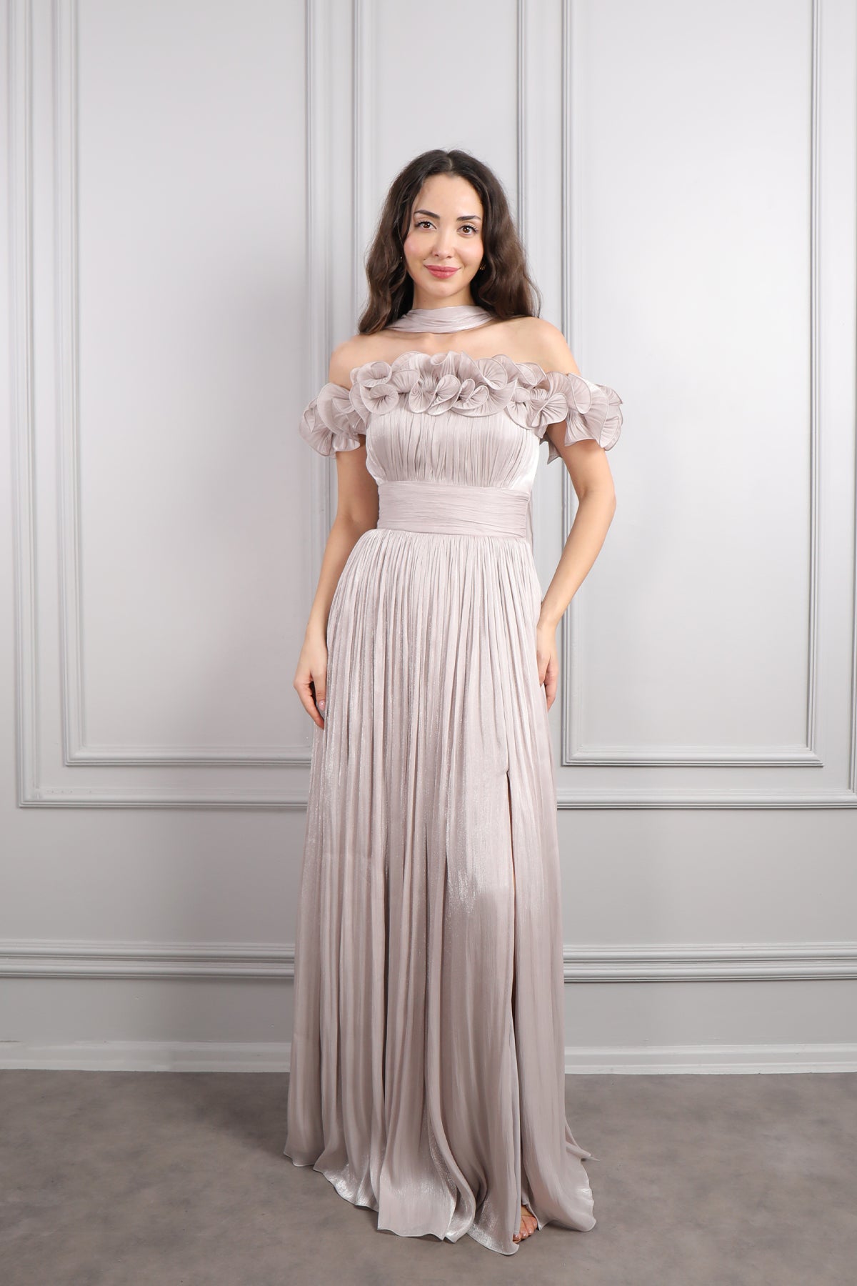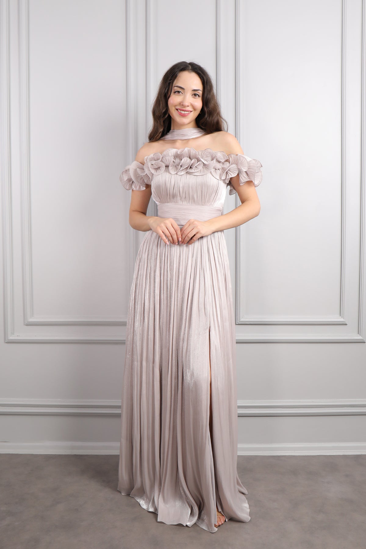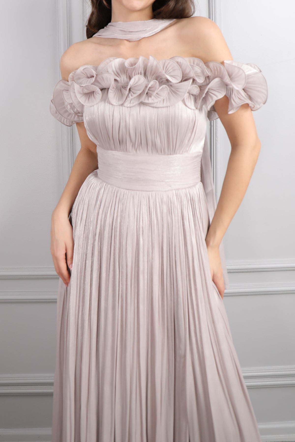 Kayık Yaka Volanlı Fular Detaylı Şifon Abiye Vizon Özellikleri