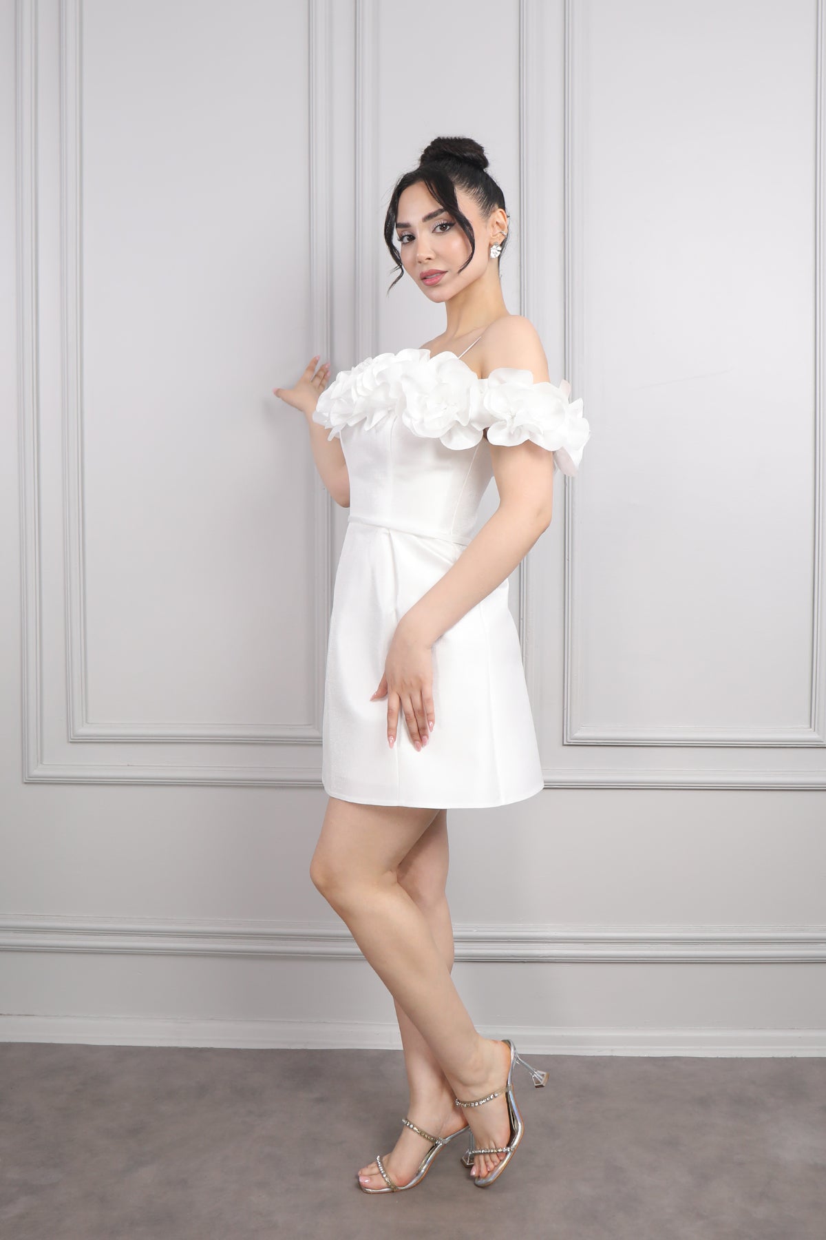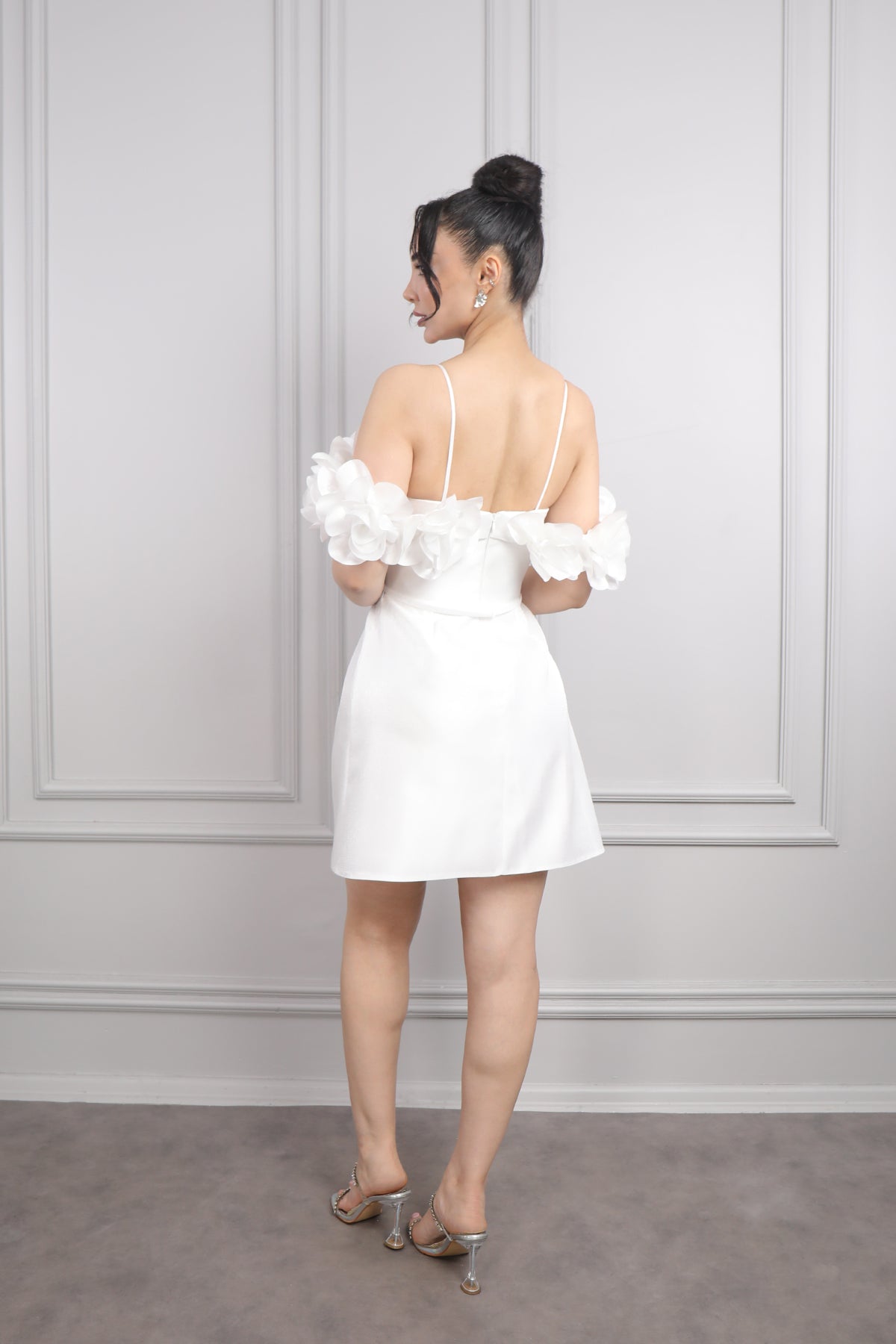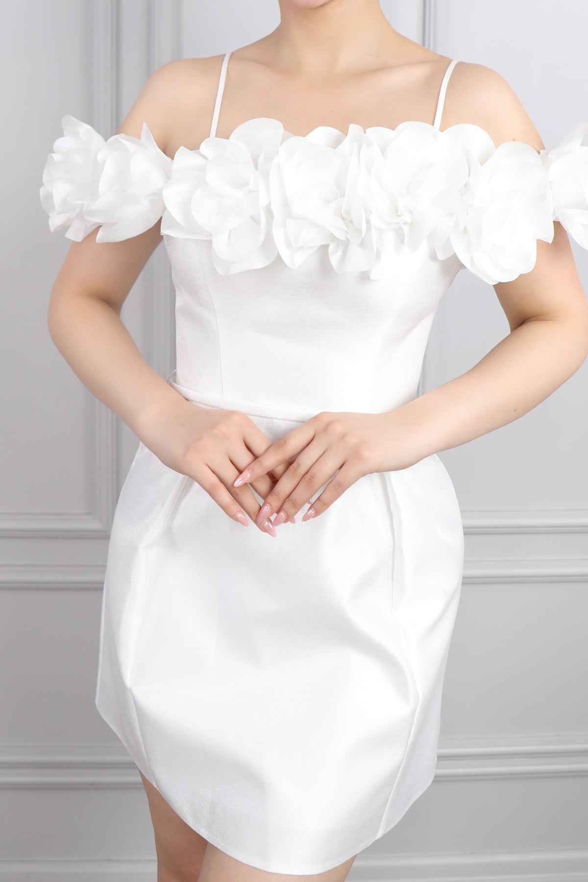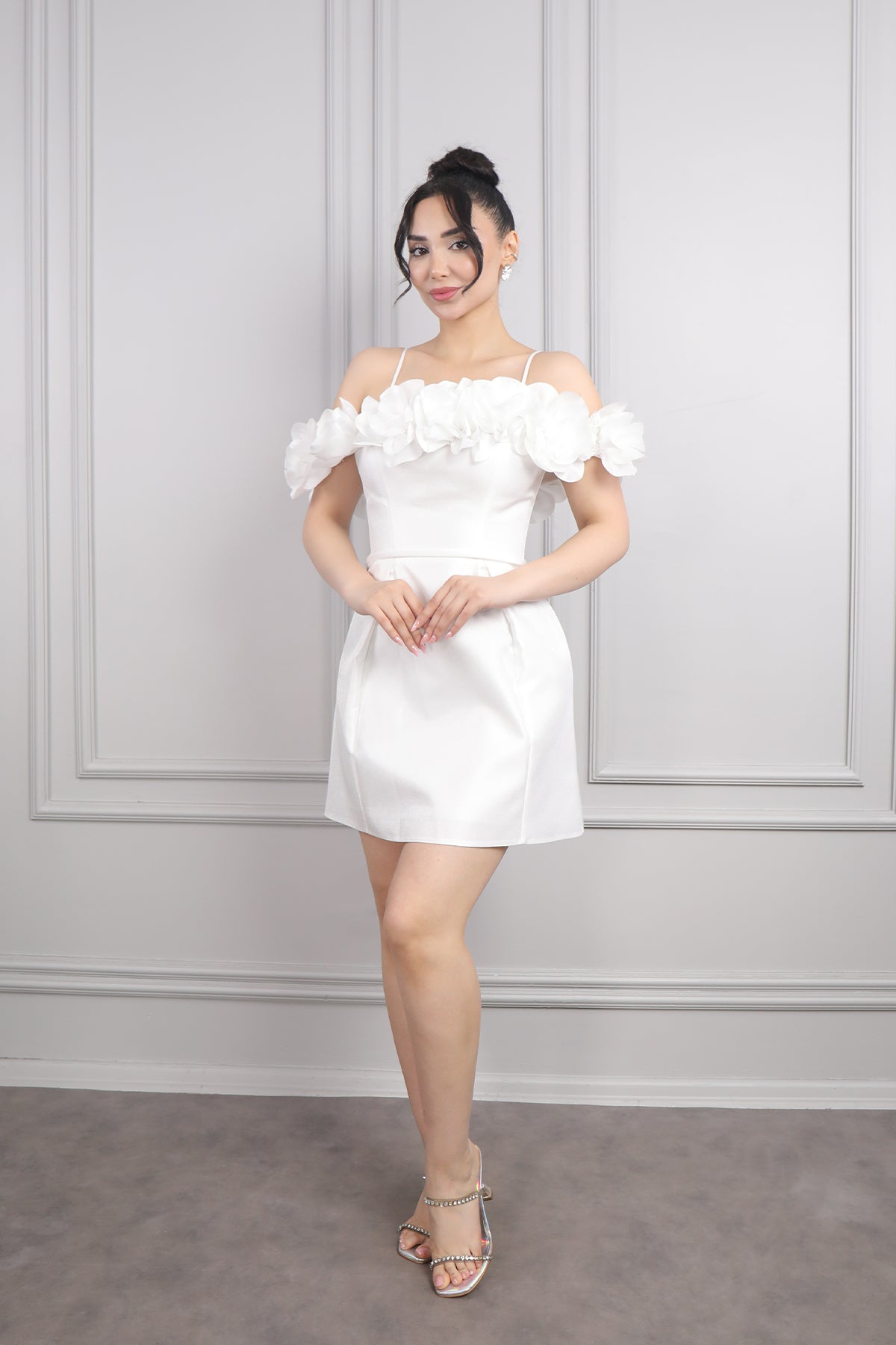 İnce Askılı Yakası Çiçek Detaylı Kısa Abiye Kemik