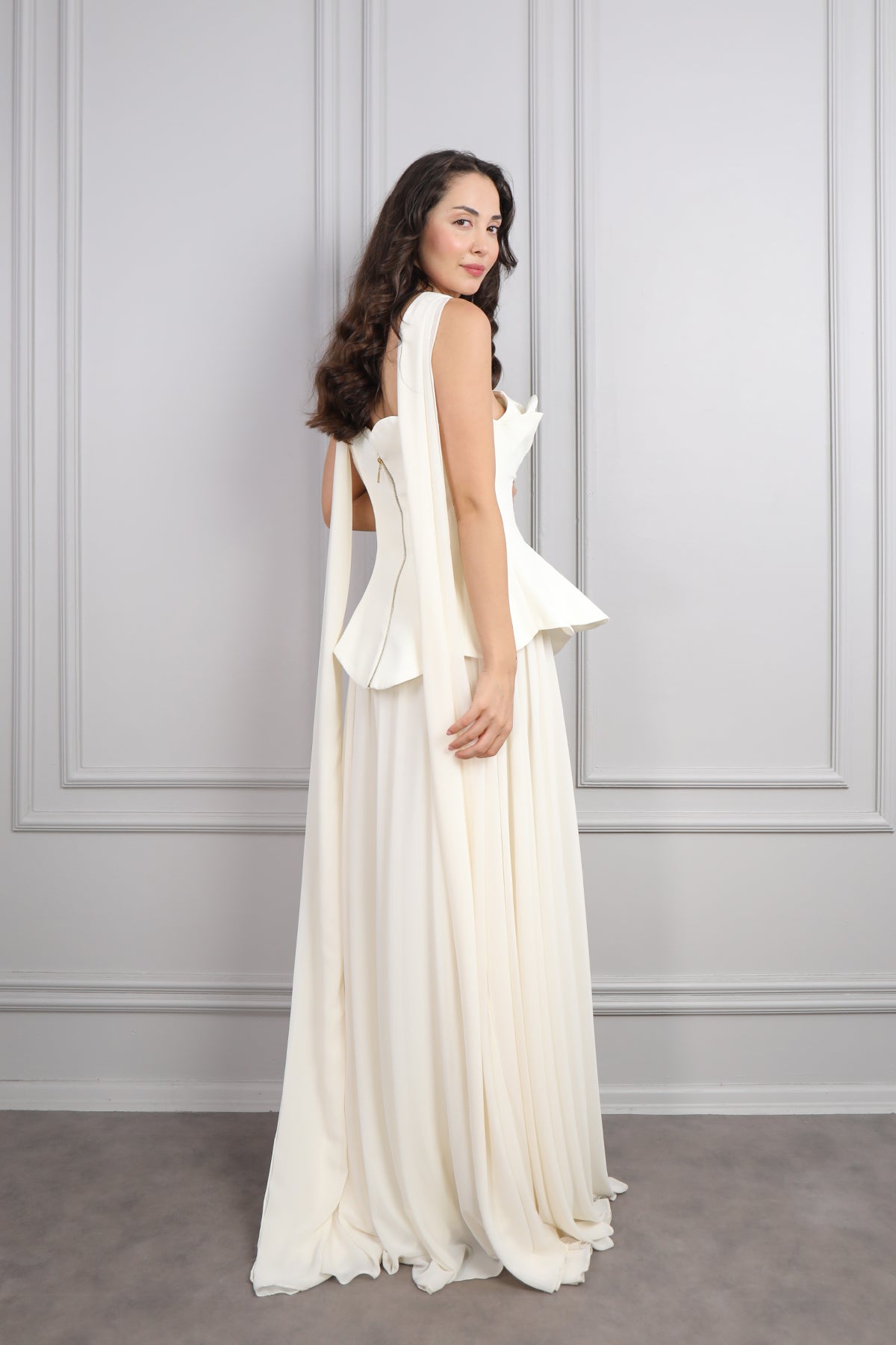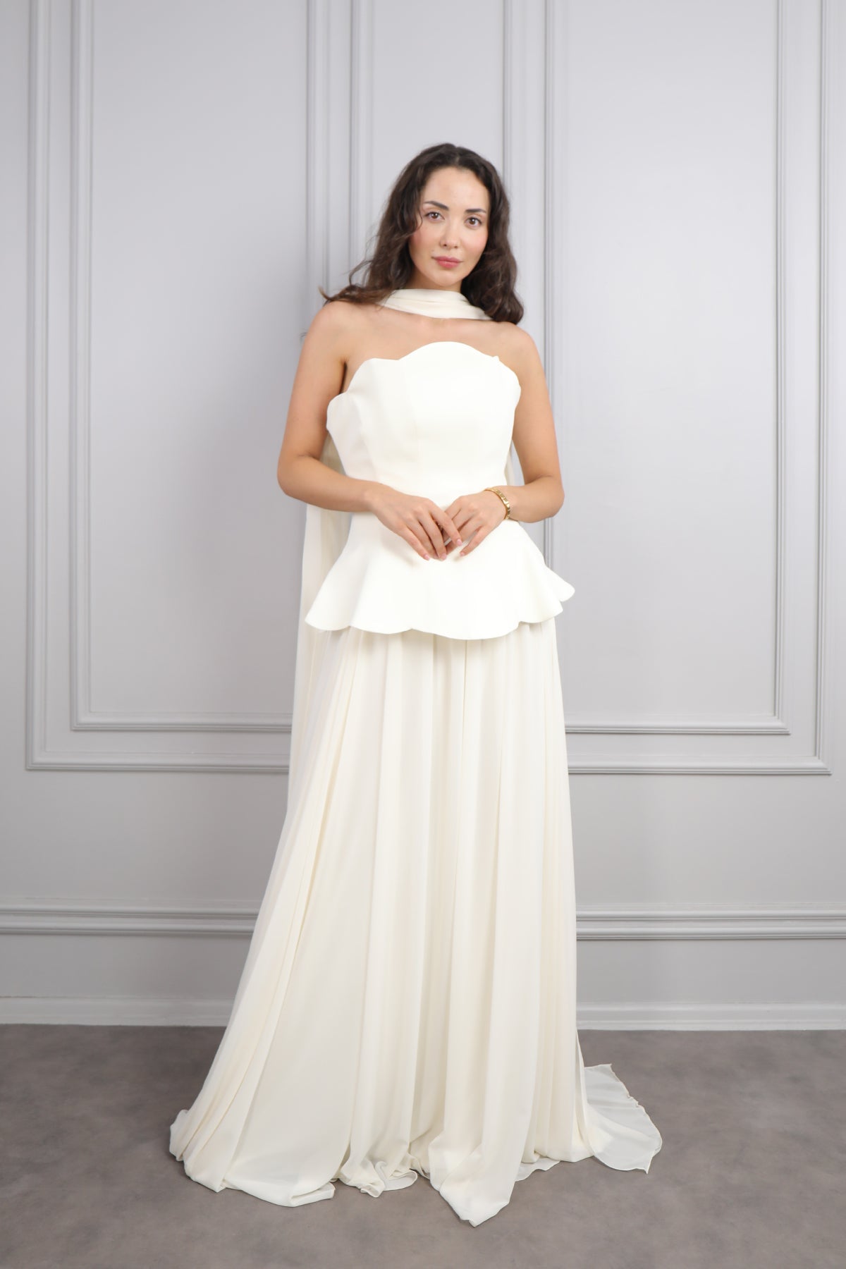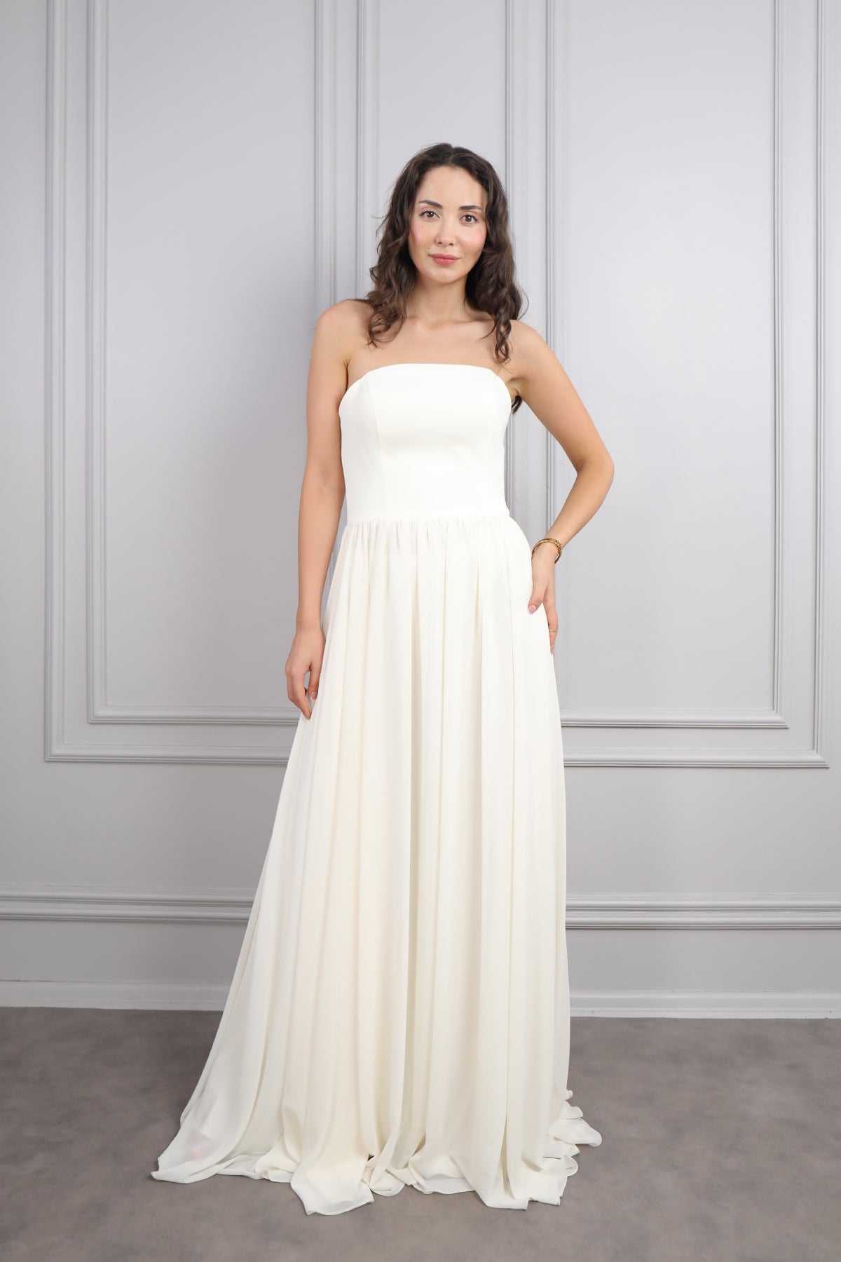 Straplez Korse Detaylı Şifon Abiye Kemik