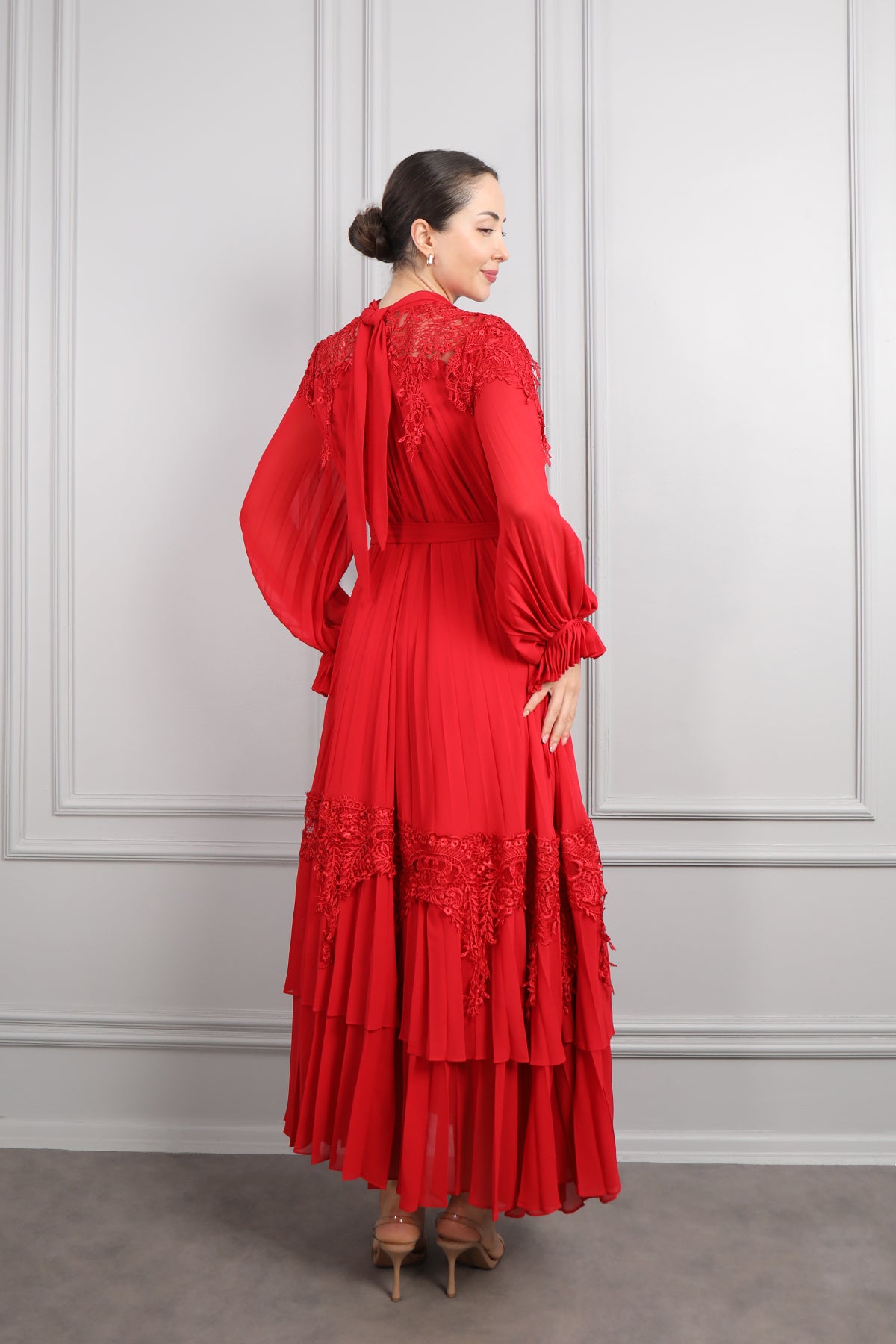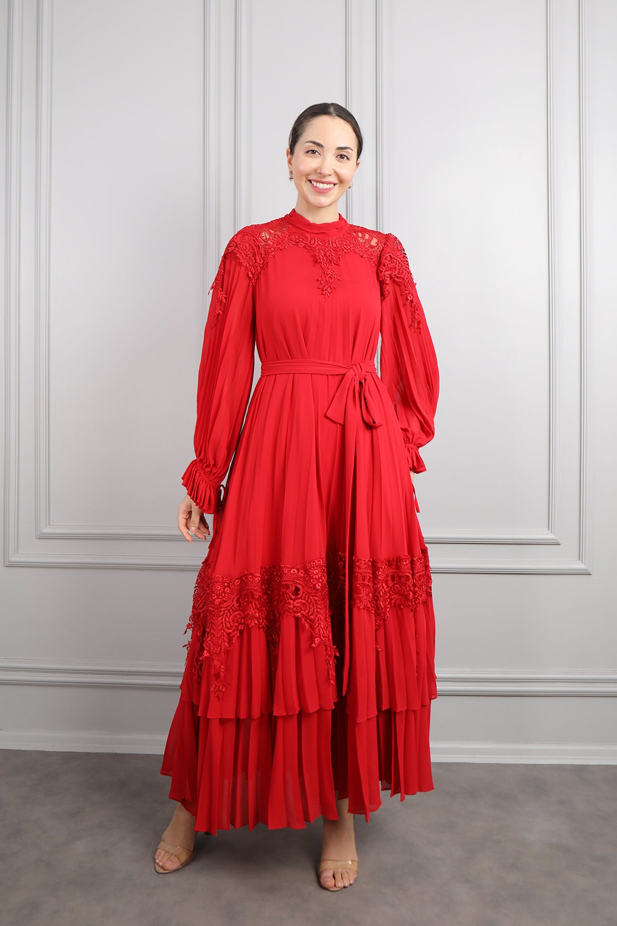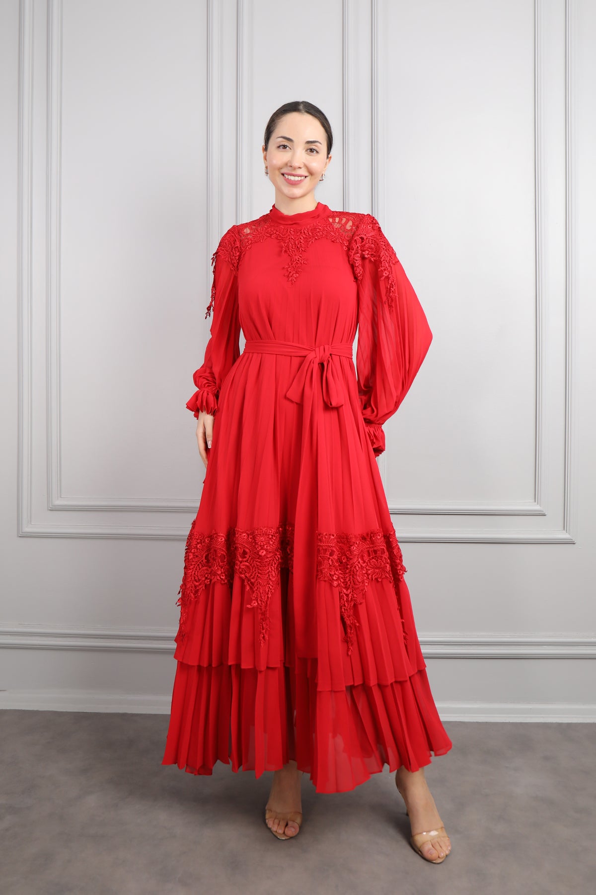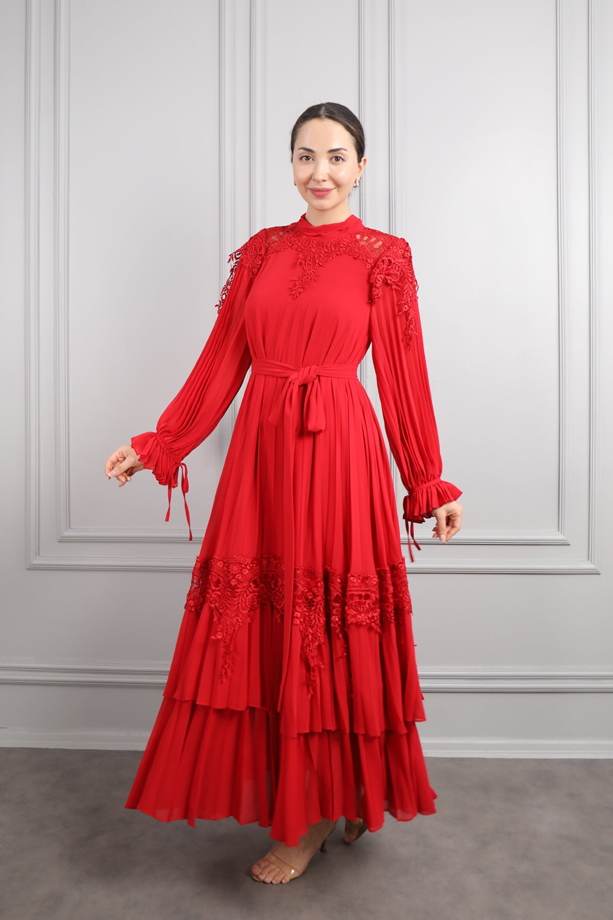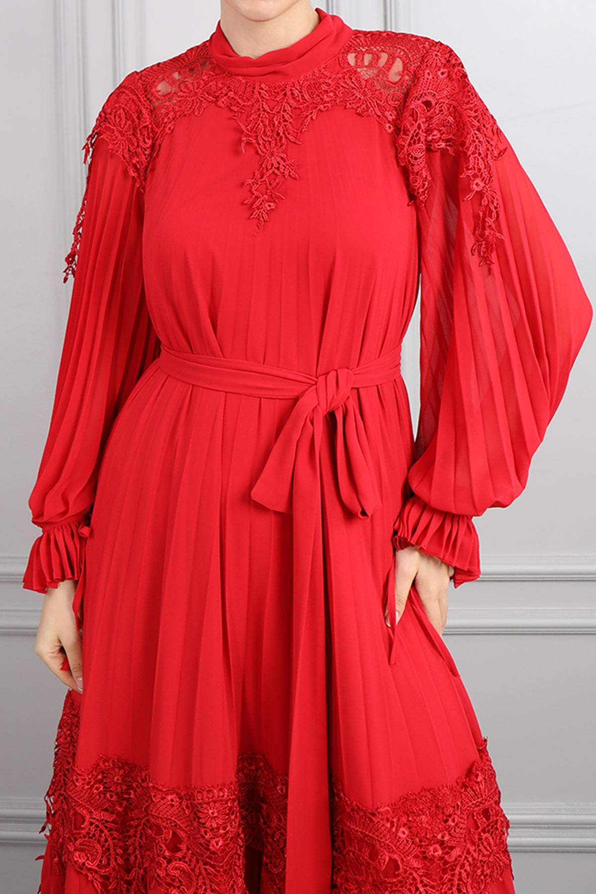 Hakim Yaka Dantel Detaylı Beli Kuşaklı Şifon Elbise Kırmızı