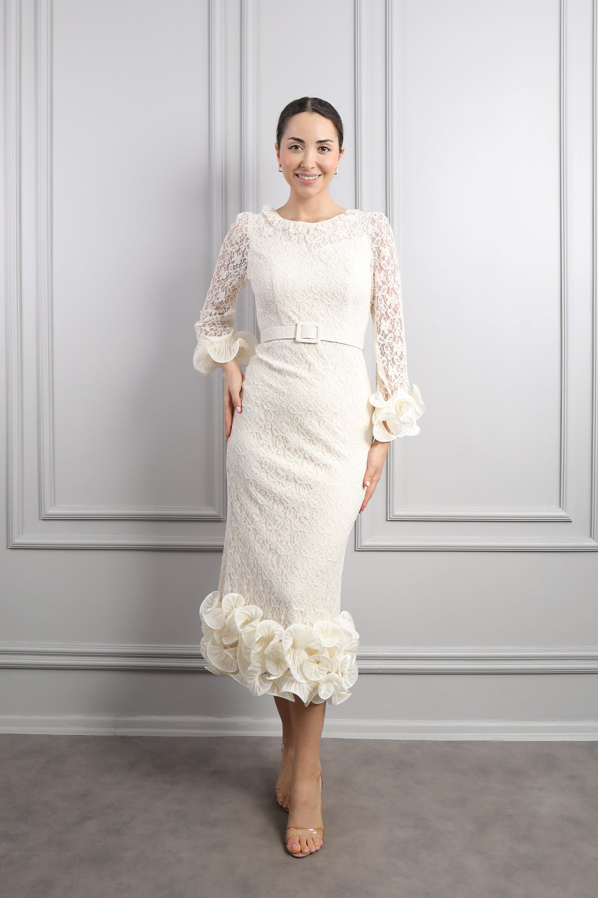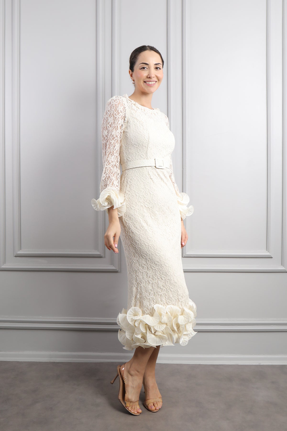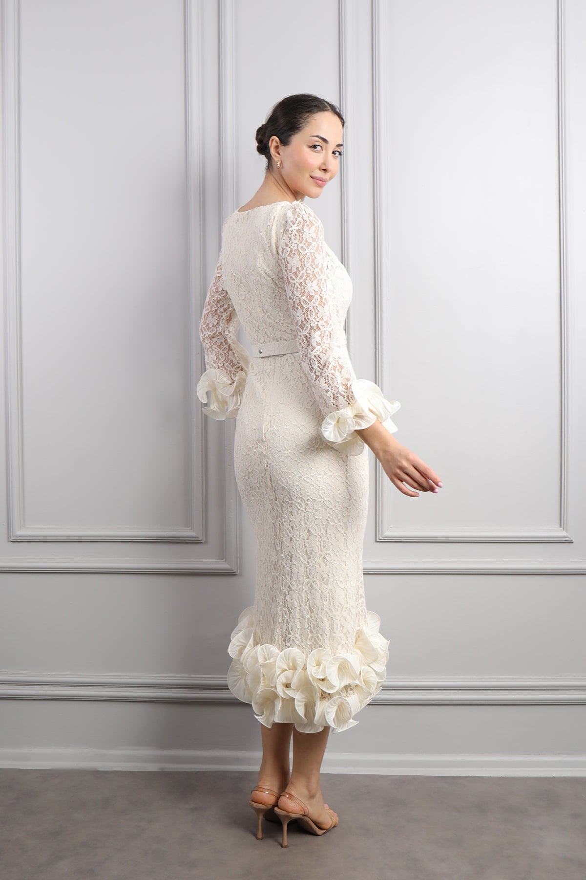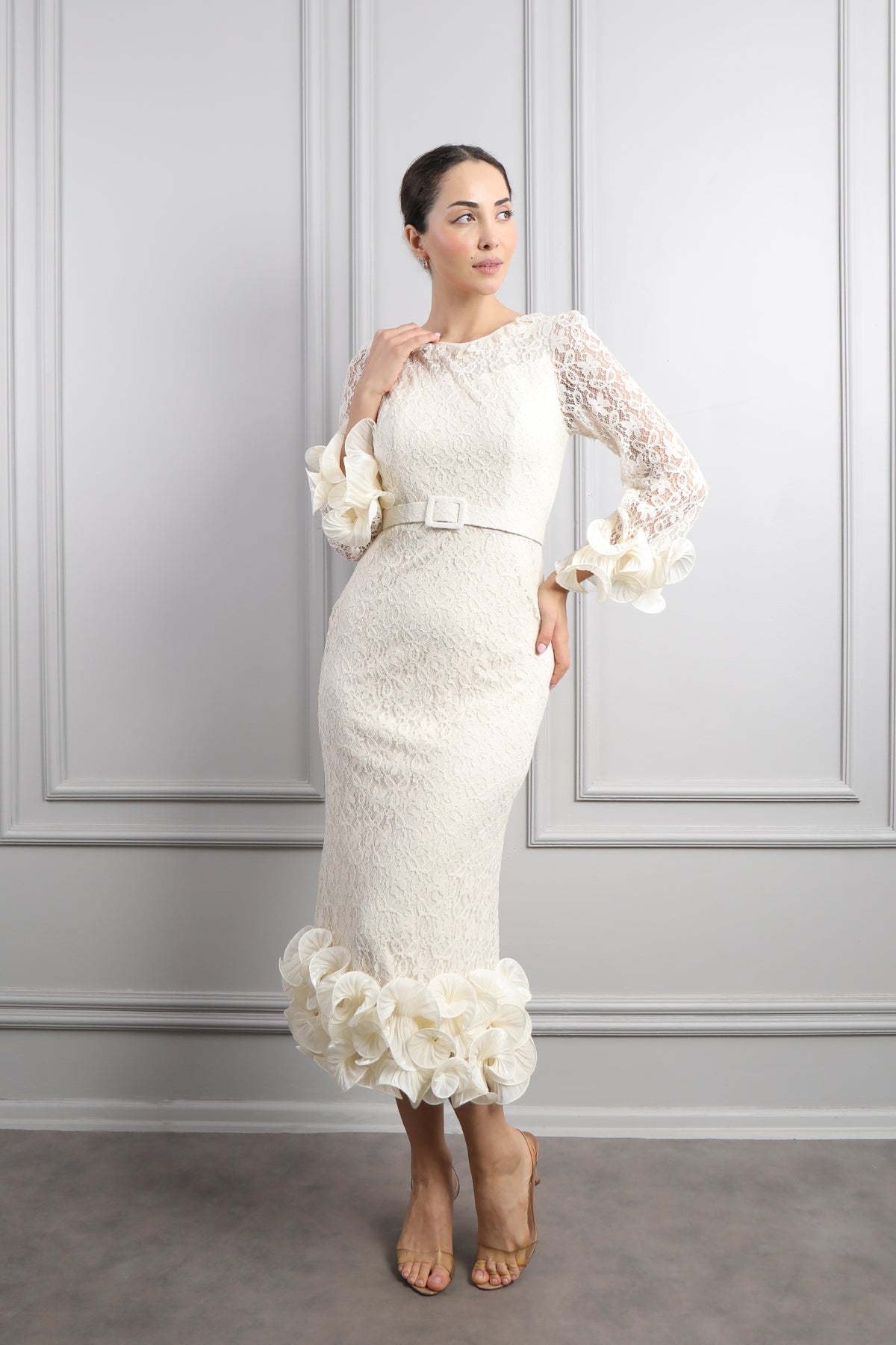 Kolları Ve Eteği Volan Detaylı Dantelli Midi Boy Elbise Bej Özellikleri