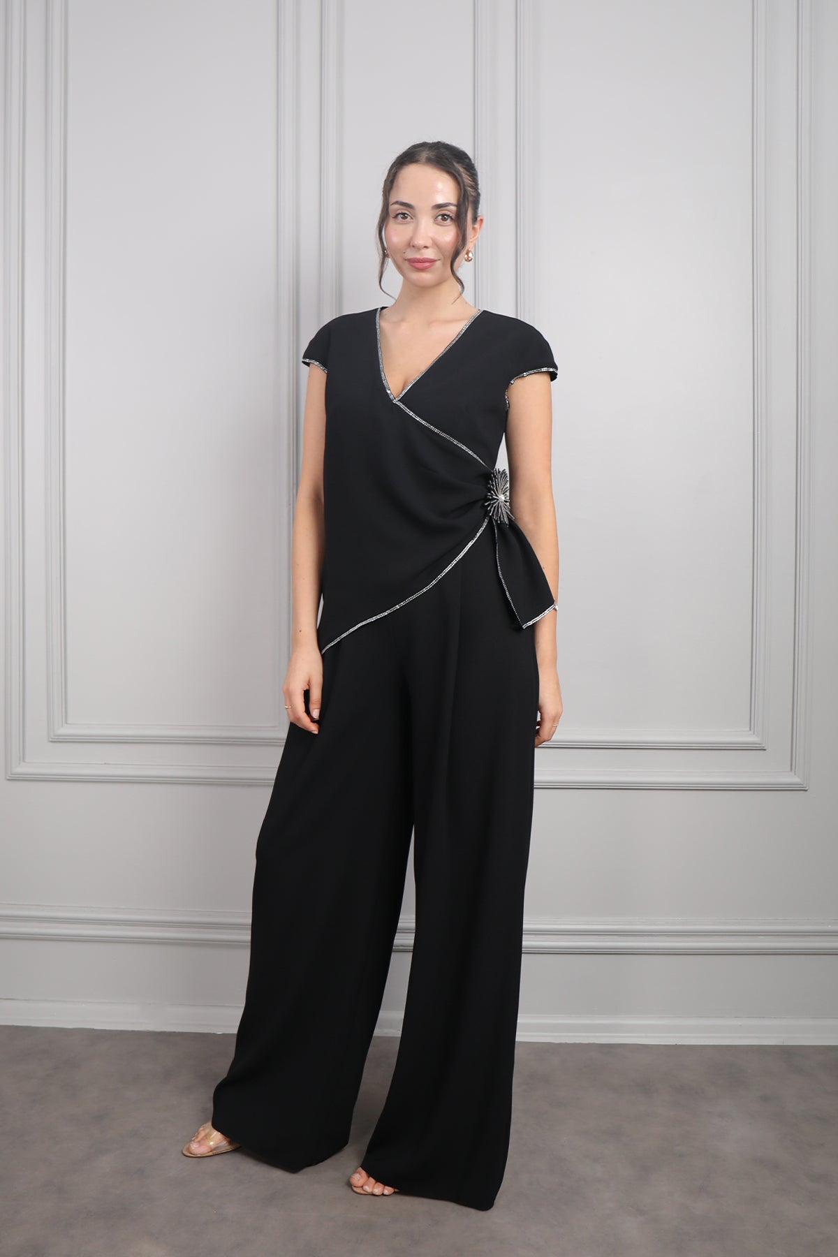 Kruvaze yakası taş şerit eklenerek süslenirken bel kısmındaki çiçek detayıyla oldukça şık görünüme sahiptir. Bol paça pantolonuyla tasarlanan modern görünüme sahip tulumumuzu özel günlerinizde tercih etmeniz sizler için ideal bir seçim olacaktır.