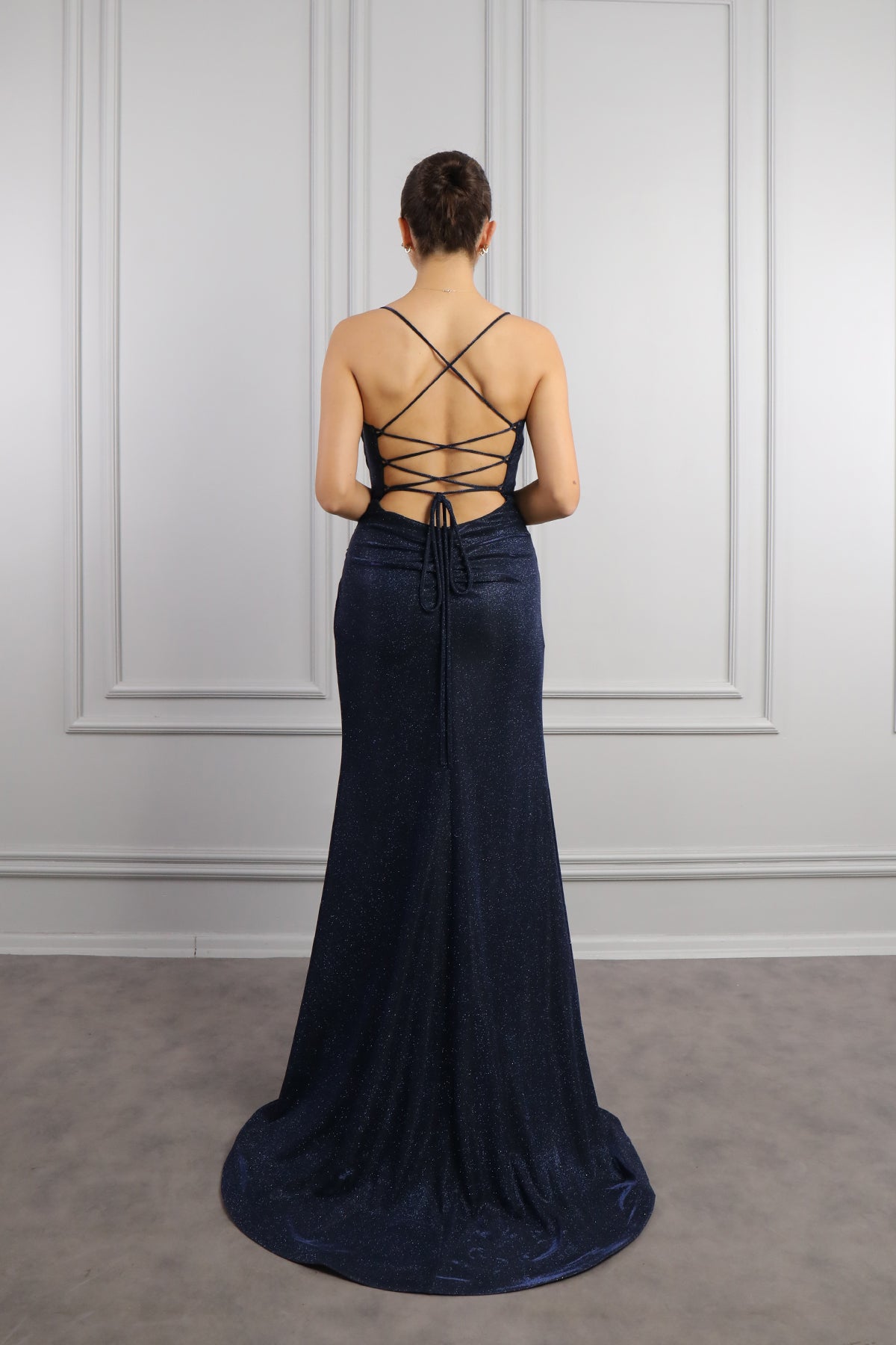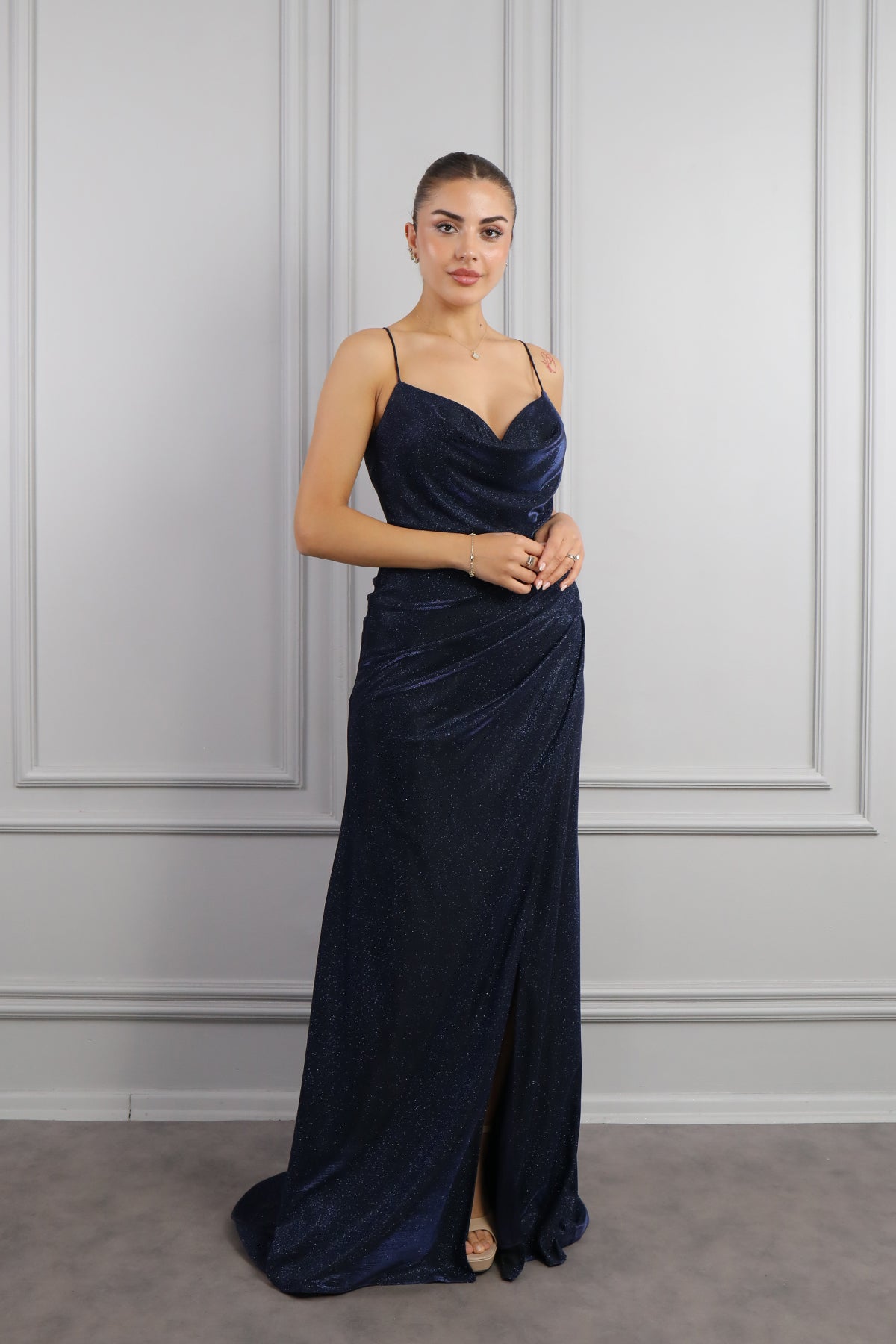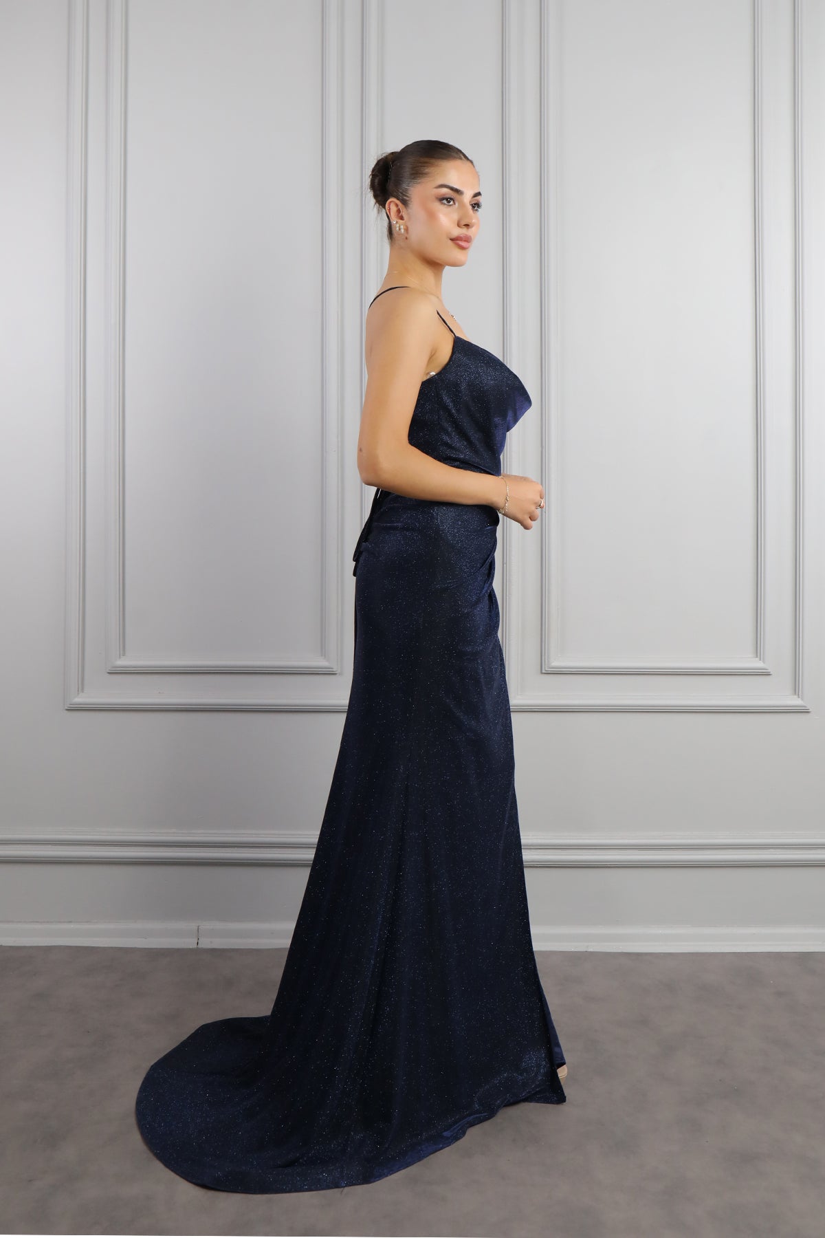 İnce Askılı Degaje Yaka Parlak Kumaş Abiye Lacivert