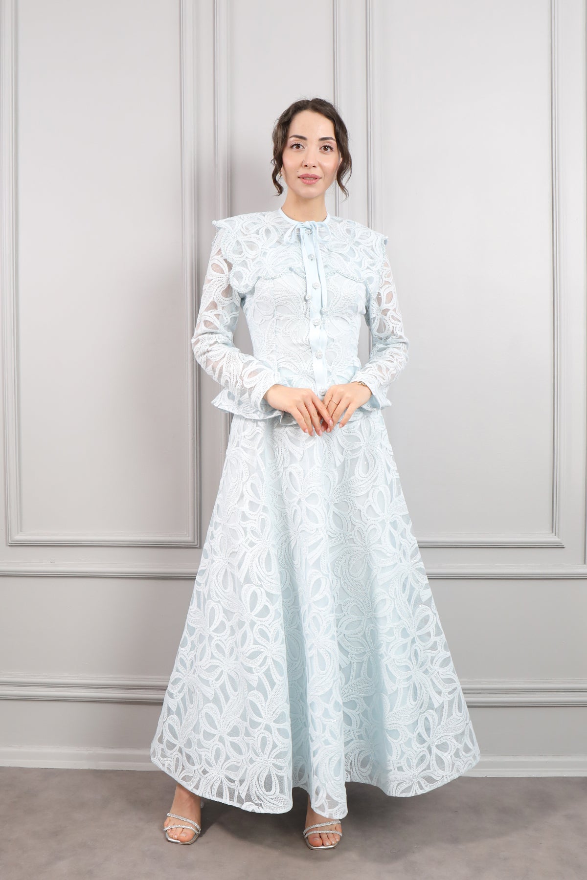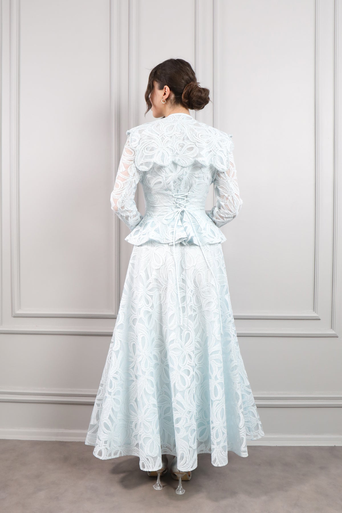 Bebe yakası bağlama detaylı takımımızın tamamı dantel kumaş kullanılarak tasarlanırken boncuk detaylı düğmeleriyle süslenerek dikkat çekmektedir. Sırt kısmı bağlama detayıyla korsaj görünümü verilen üstümüzün takımı olan eteği tam boy olarak inmektedir. Farklı parçalarla da kombinleyerek kullanabileceğiniz etek takımımızı seçmeniz sizler için ideal bir tercih olacaktır.