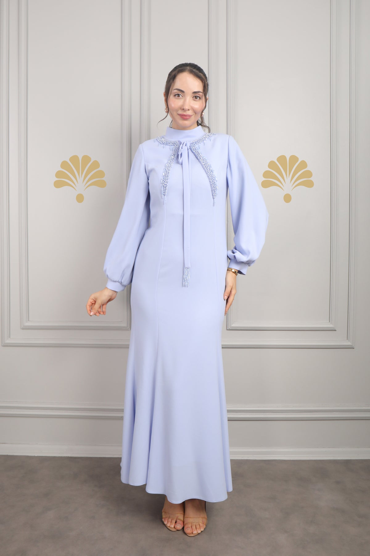 Hakim Yaka Bağcıklı Uzun Kollu İnci Detaylı Tesettür Abiye Mavi