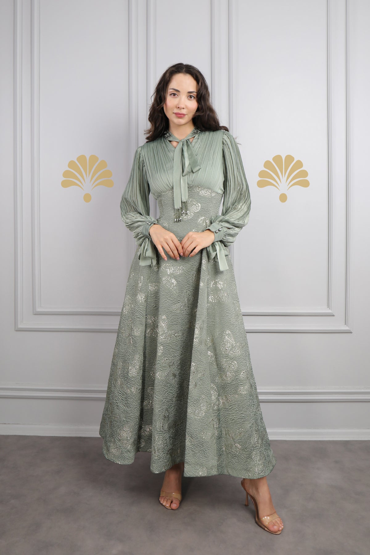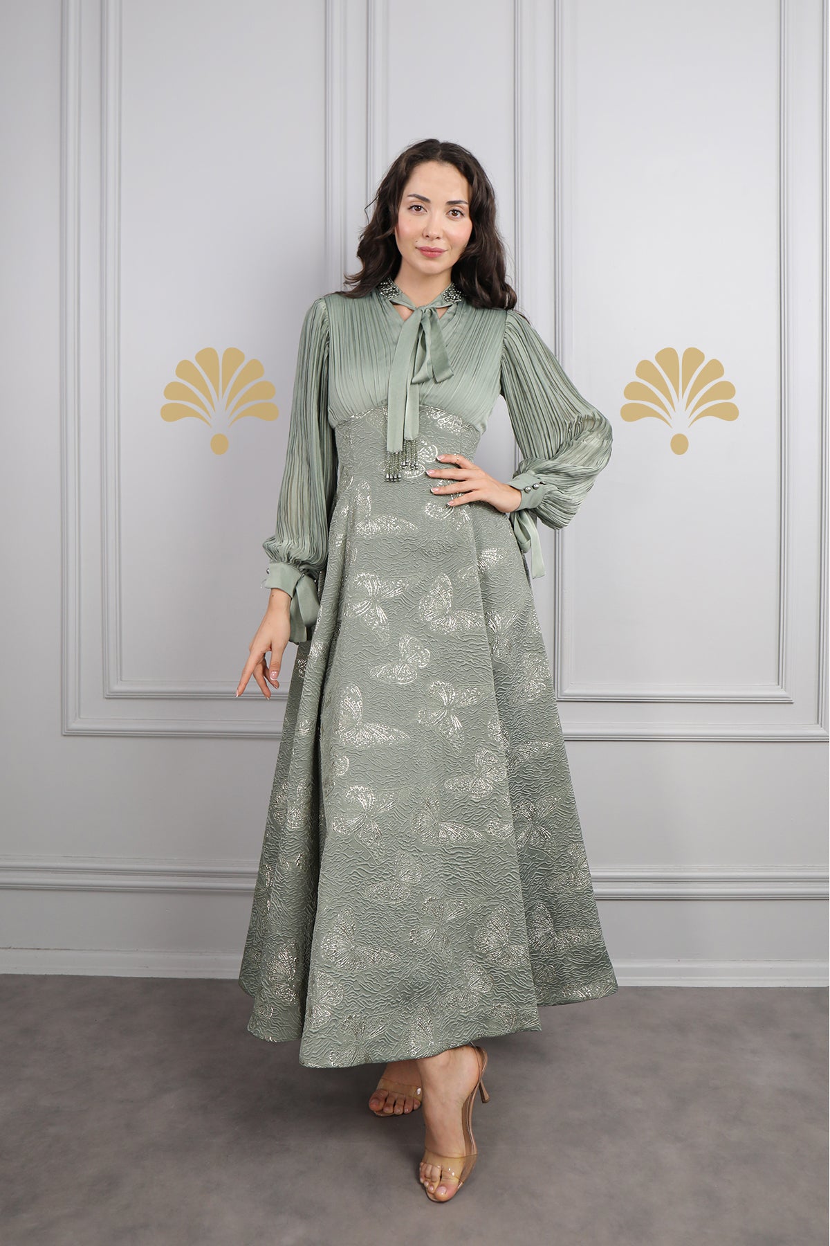 Yakası Bağlamalı Balon Kol İnci İşlemeli Eteği Desenli Midi Boy Elbise Mint Yeşili