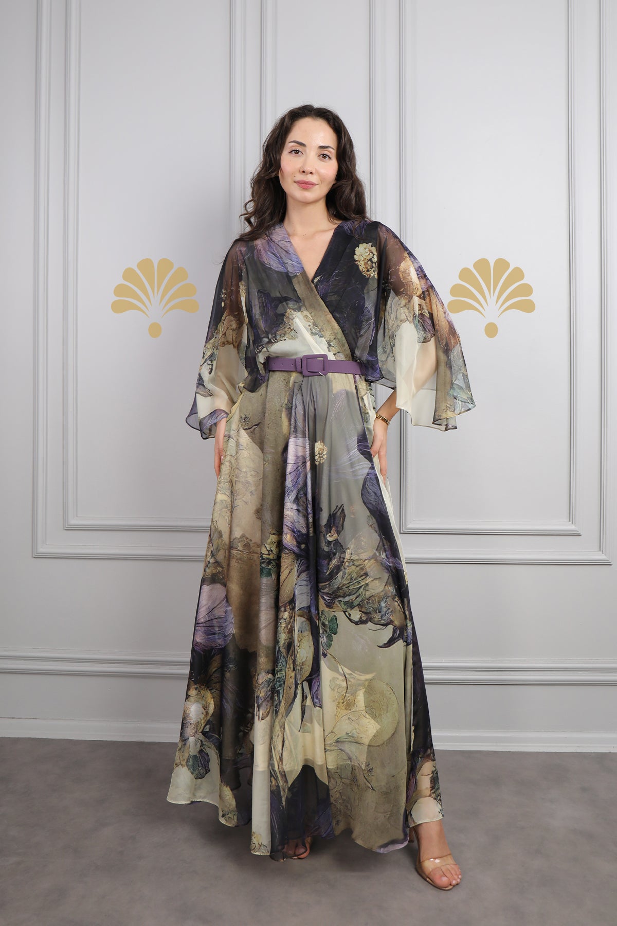 Modern ve zarif çizgileriyle dikkat çeken bu V yaka, yarasa kol, beli kemerli desenli büyük beden şifon elbise, stil sahibi kadınların gardırobunda fark yaratacak özel bir parça. Uçuş uçuş dokusu sayesinde hafiflik sunarken, yarasa kol detayı hareket özgürlüğü ve sofistike bir duruş kazandırıyor. Gövde kısmında yer alan V yaka, boyun bölgesini zarifçe vurgularken; ayarlanabilir kemer detayı ile bel hattını belirginleştirerek orantılı ve feminen bir siluet oluşturuyor. Pastel tonların ve çiçeksi desenlerin bir araya geldiği bu özgün tasarım, doğadan ilham alan sanatsal havasıyla benzersiz bir görünüm sunuyor. Davetlerden gündelik şıklığa kadar her ortamda rahatlıkla tercih edebilirsiniz.