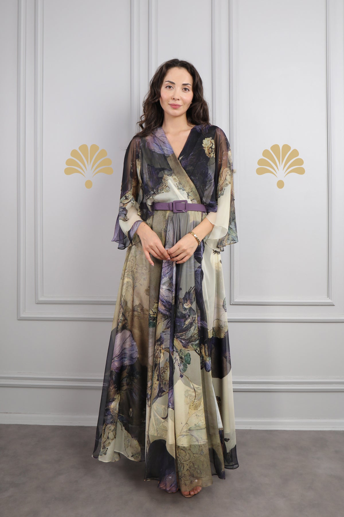 V Yaka Yarasa Kol Beli Kemerli Desenli Büyük Beden Şifon Elbise Mor Özellikleri
