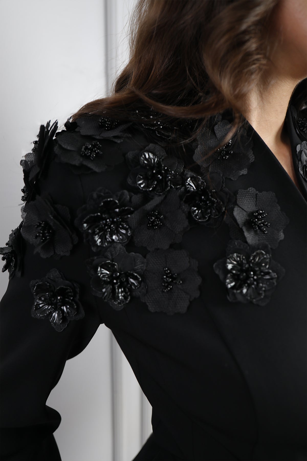 Omuzu Çiçek Detaylı Beli Kuşaklı Etek Takım Siyah Özellikleri