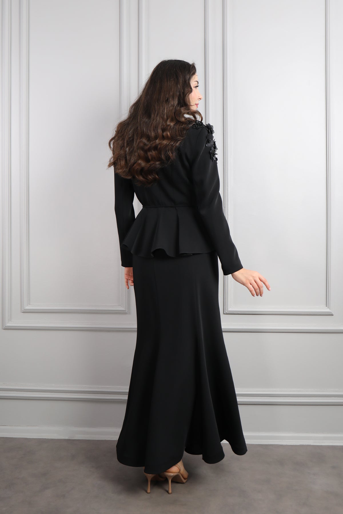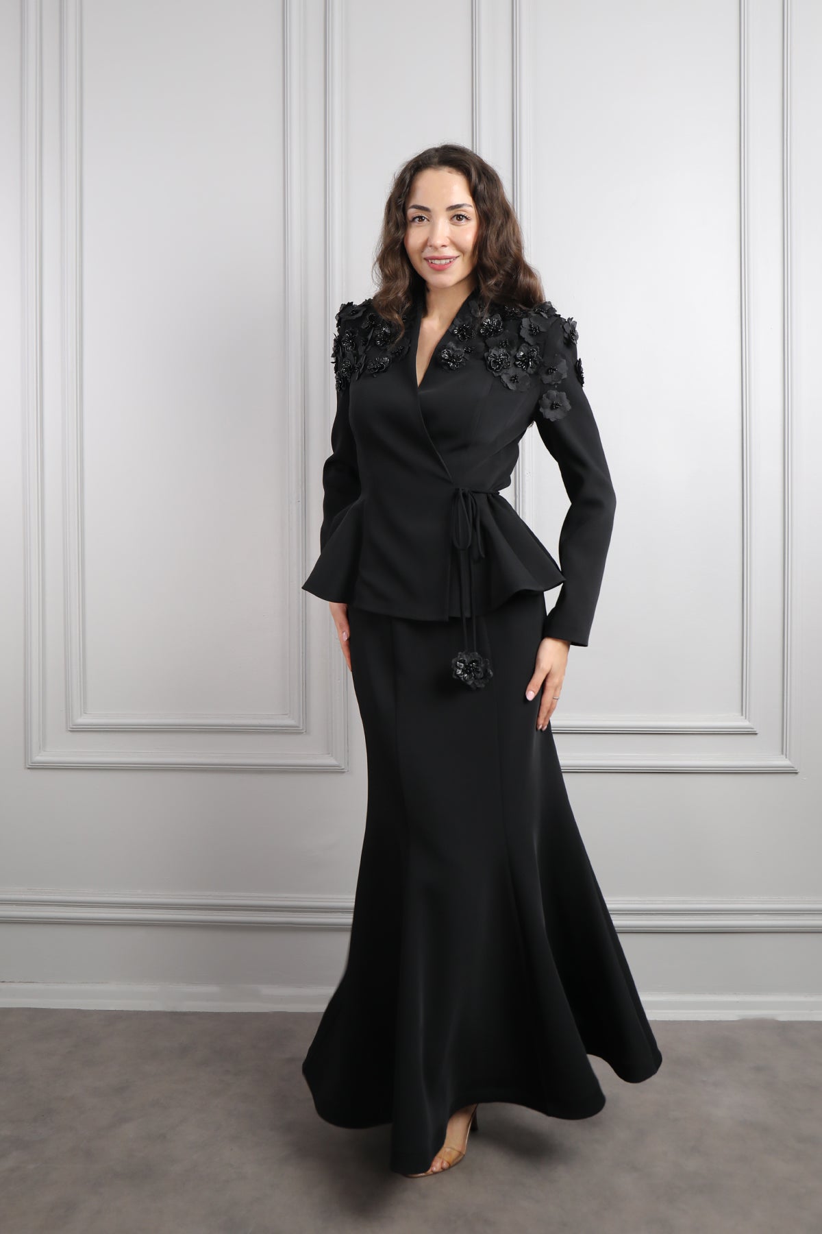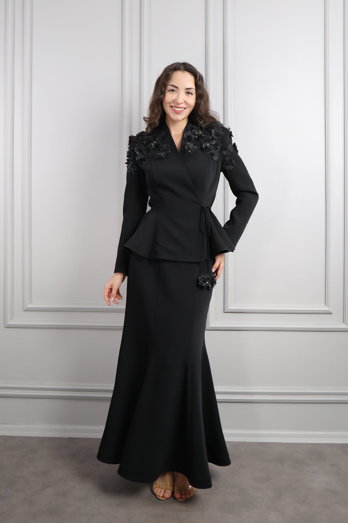 Omuzu Çiçek Detaylı Beli Kuşaklı Etek Takım Siyah