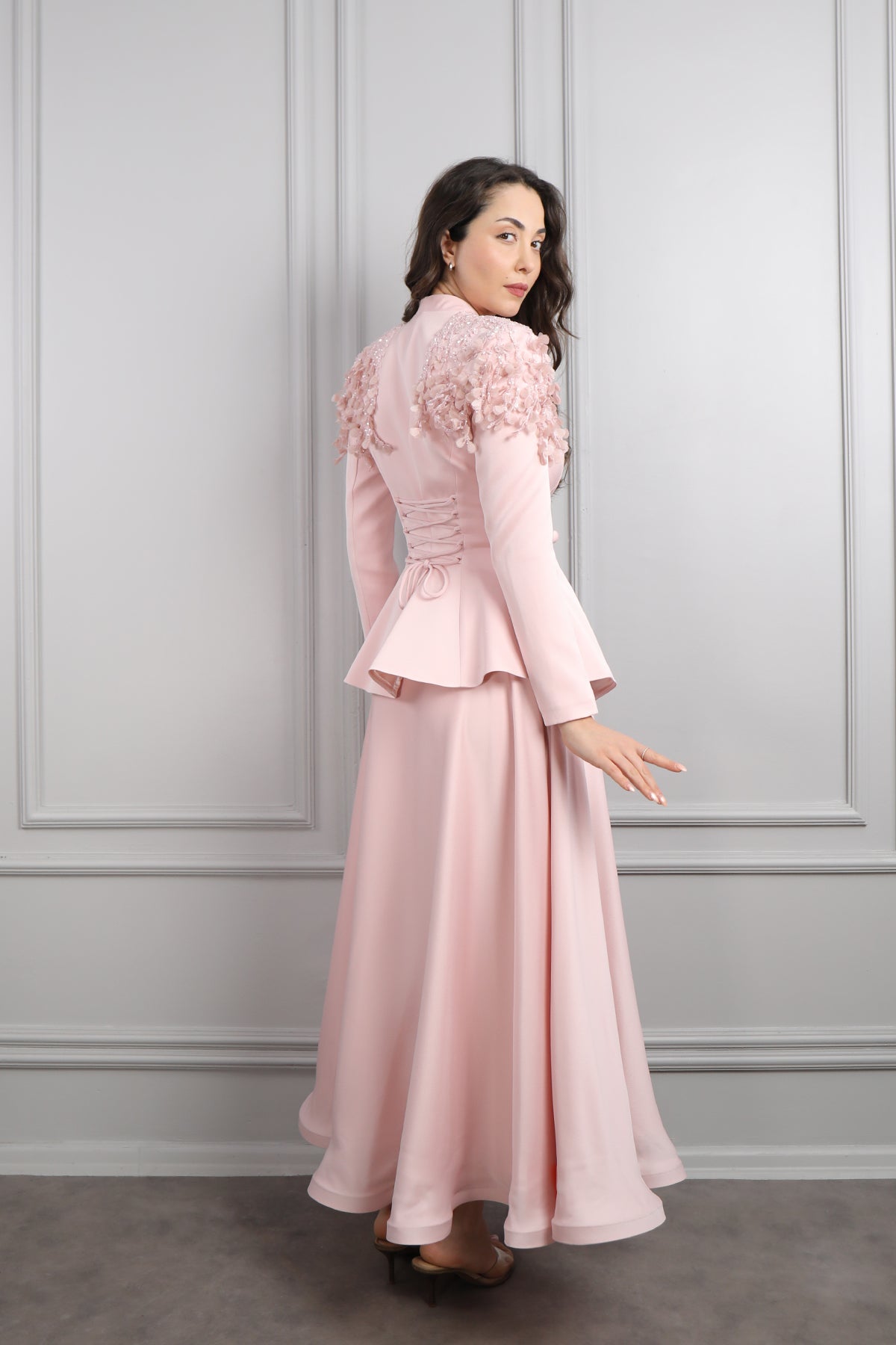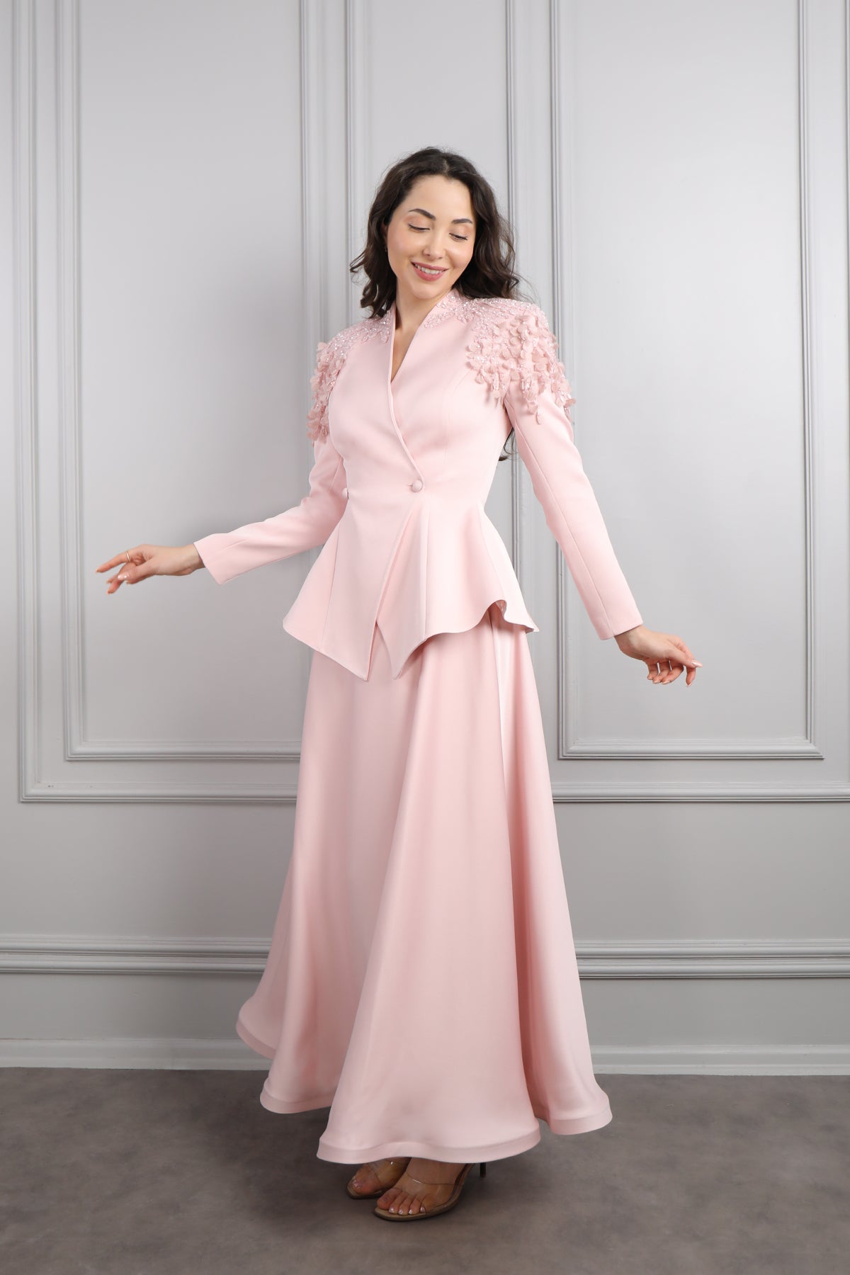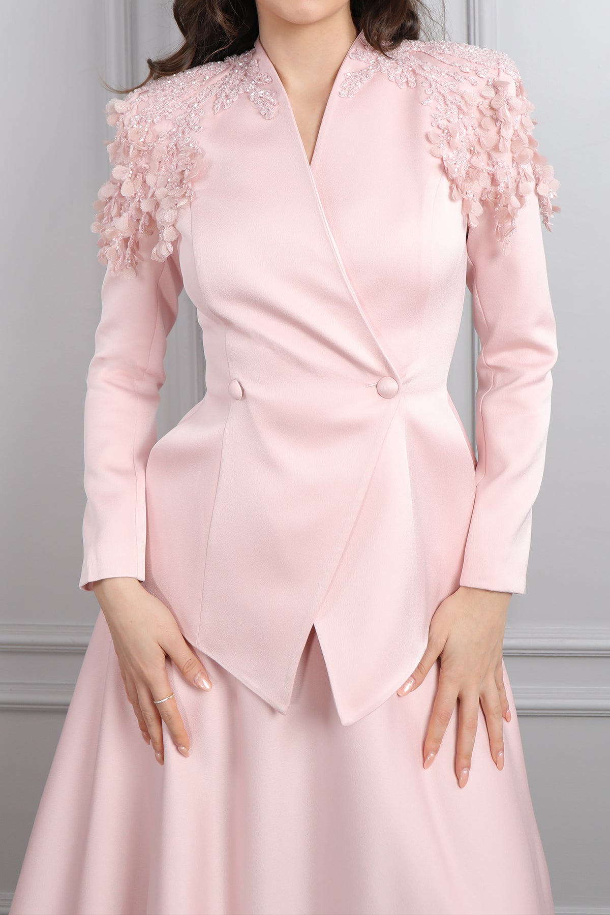 Omuzu Çiçek Detaylı Önü Düğmeli Saten Etek Takım Pudra