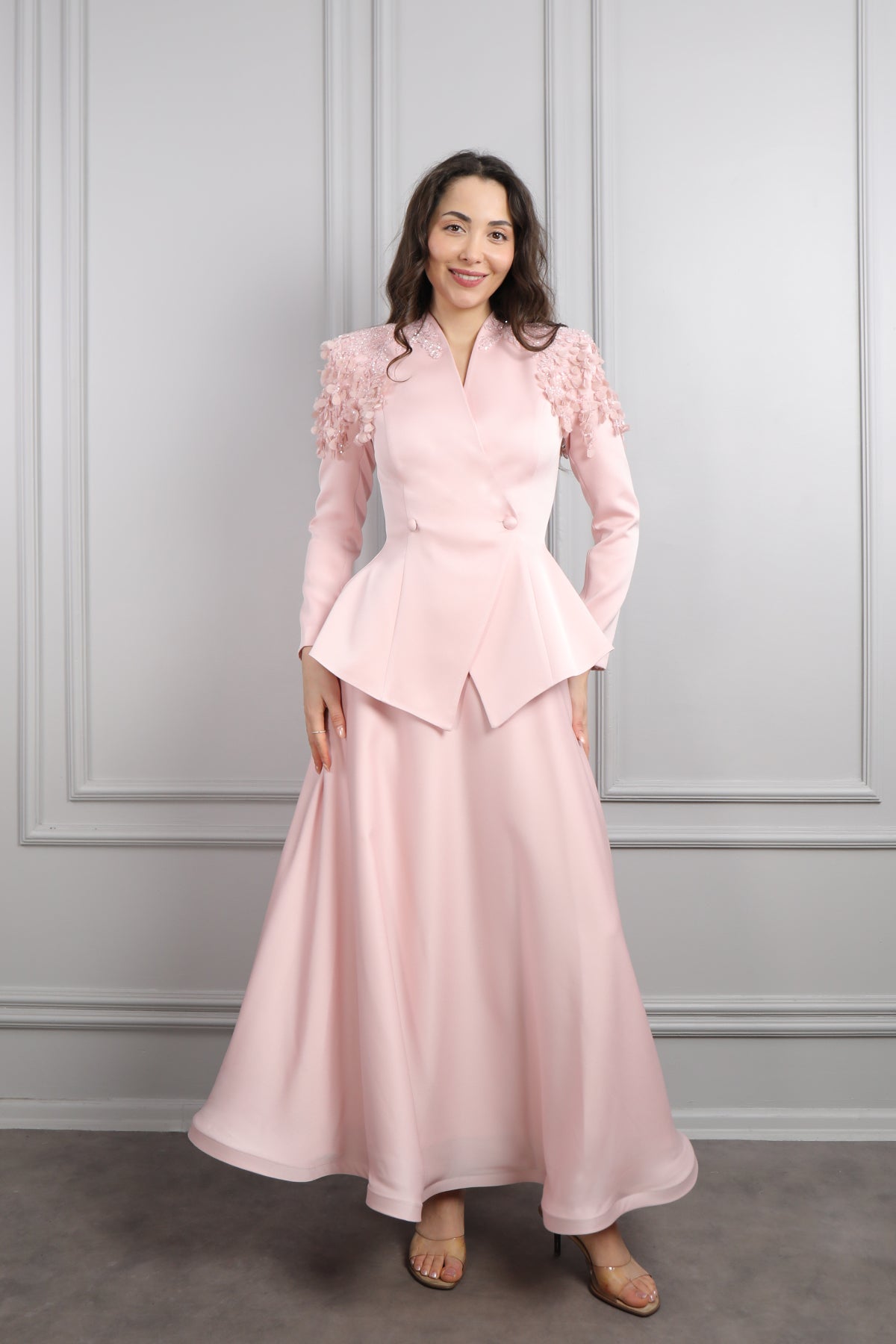 Omuzu Çiçek Detaylı Önü Düğmeli Saten Etek Takım Pudra Özellikleri