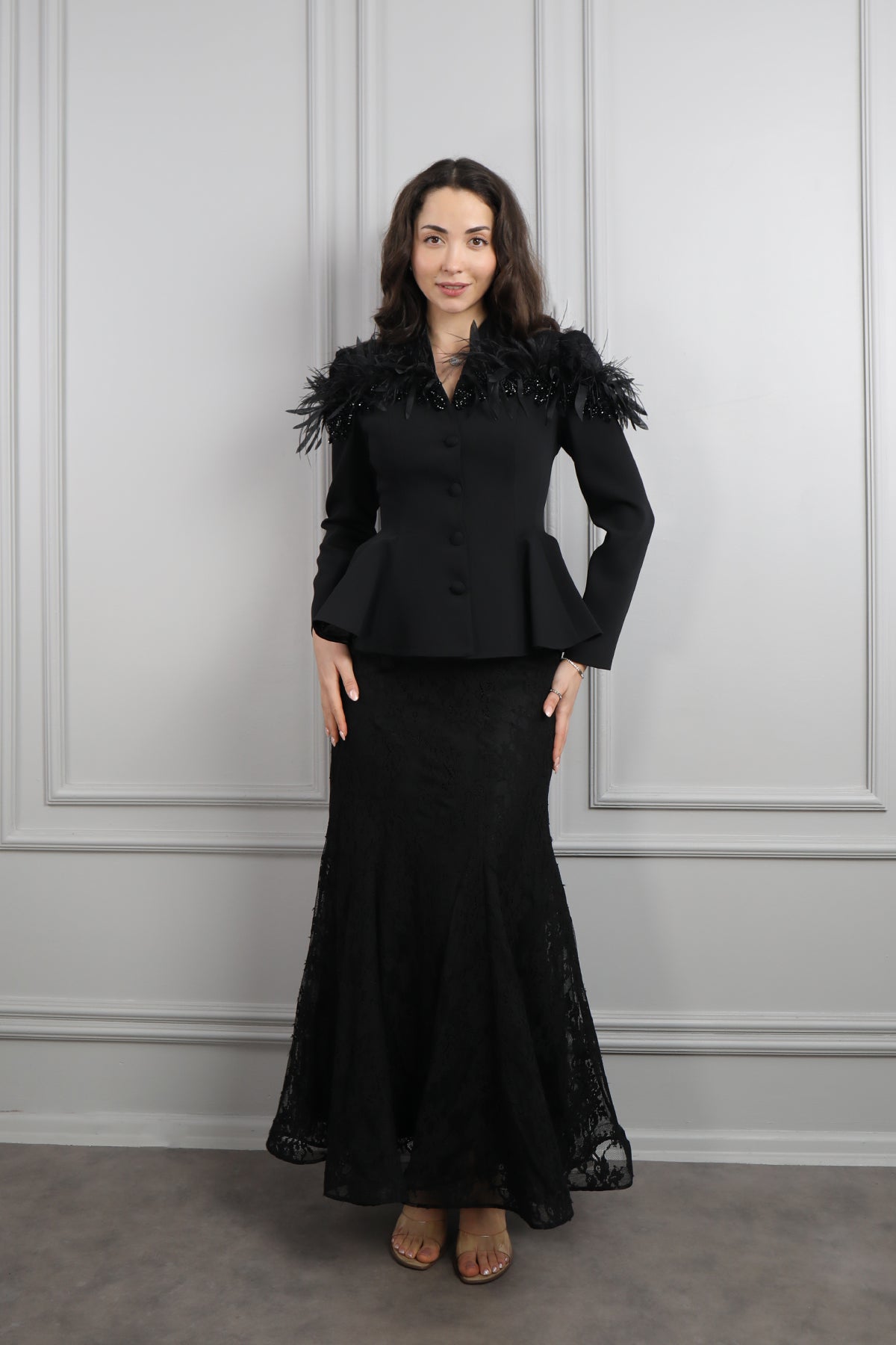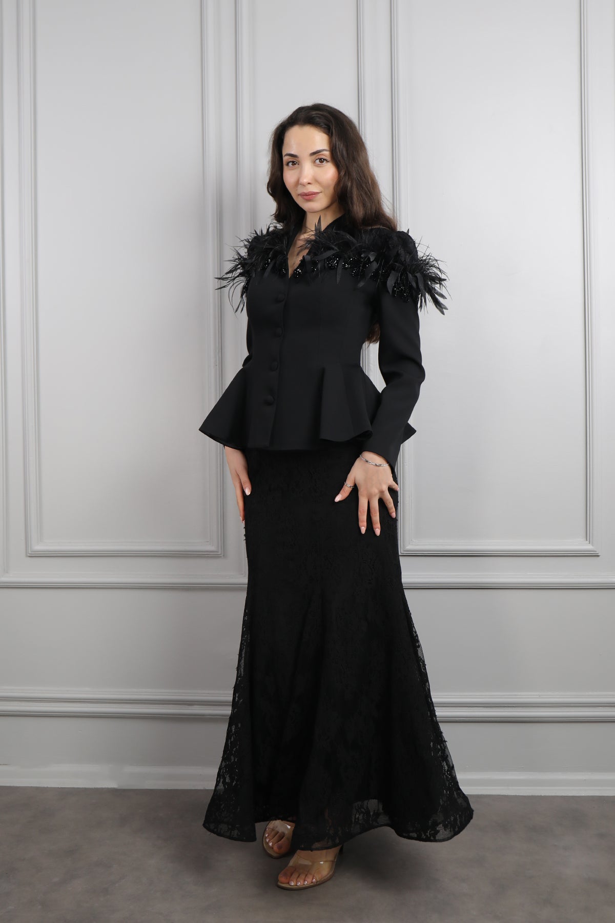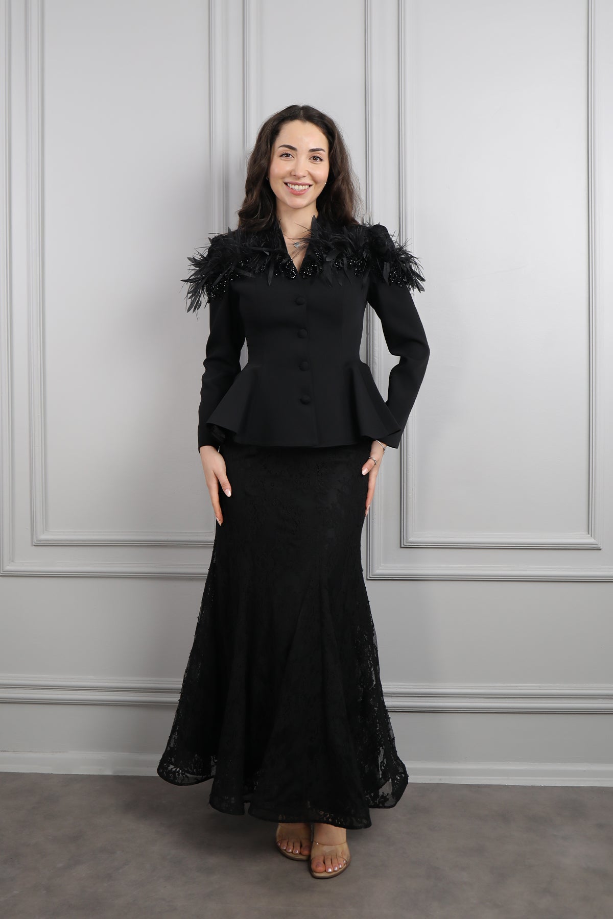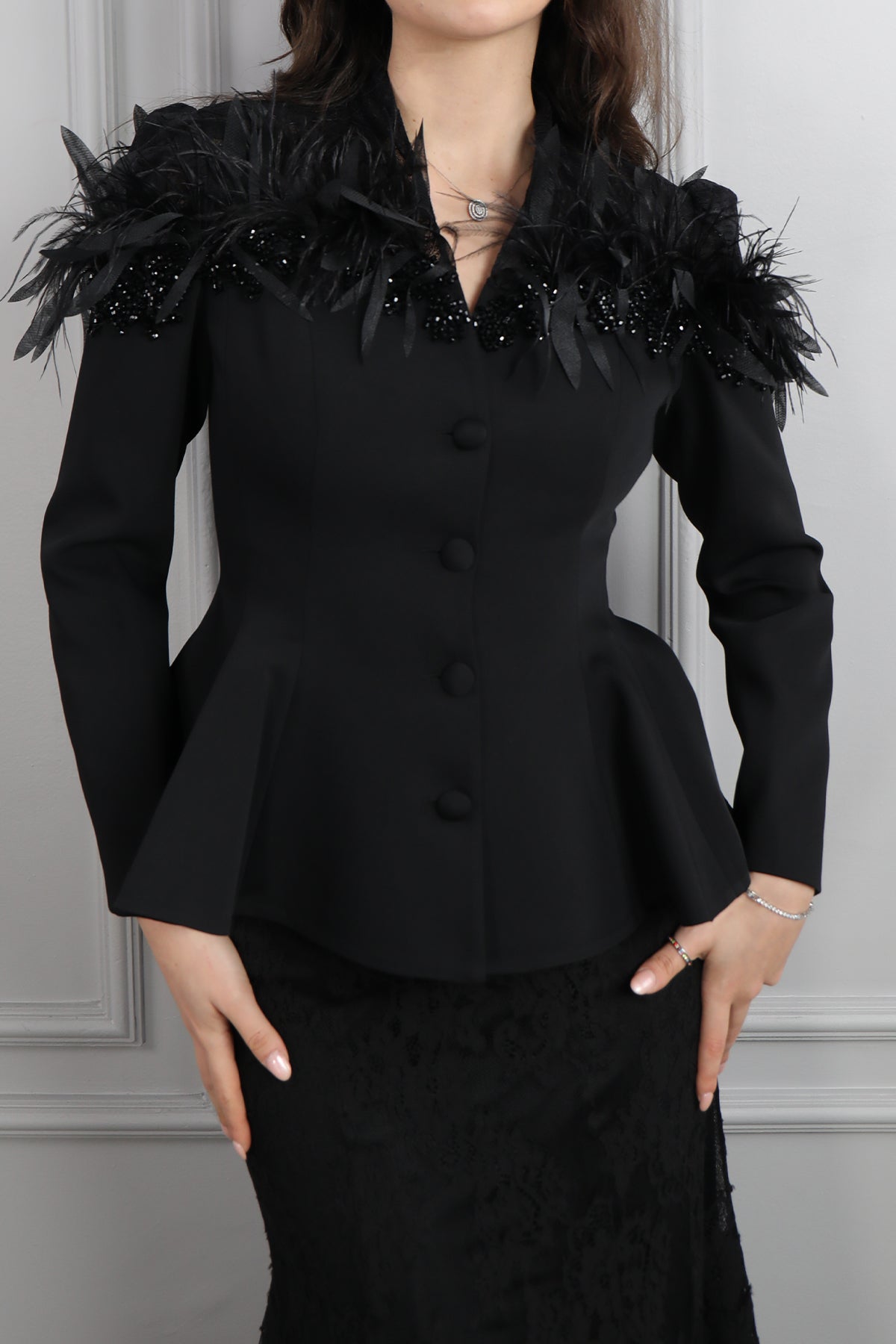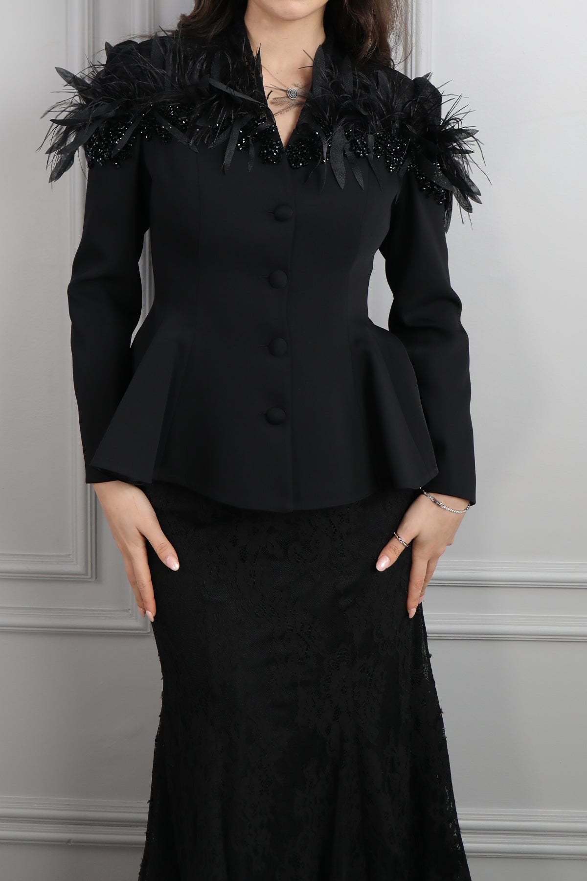 Omuzu Dantelli Tüy Detaylı Etek Takım Siyah Özellikleri