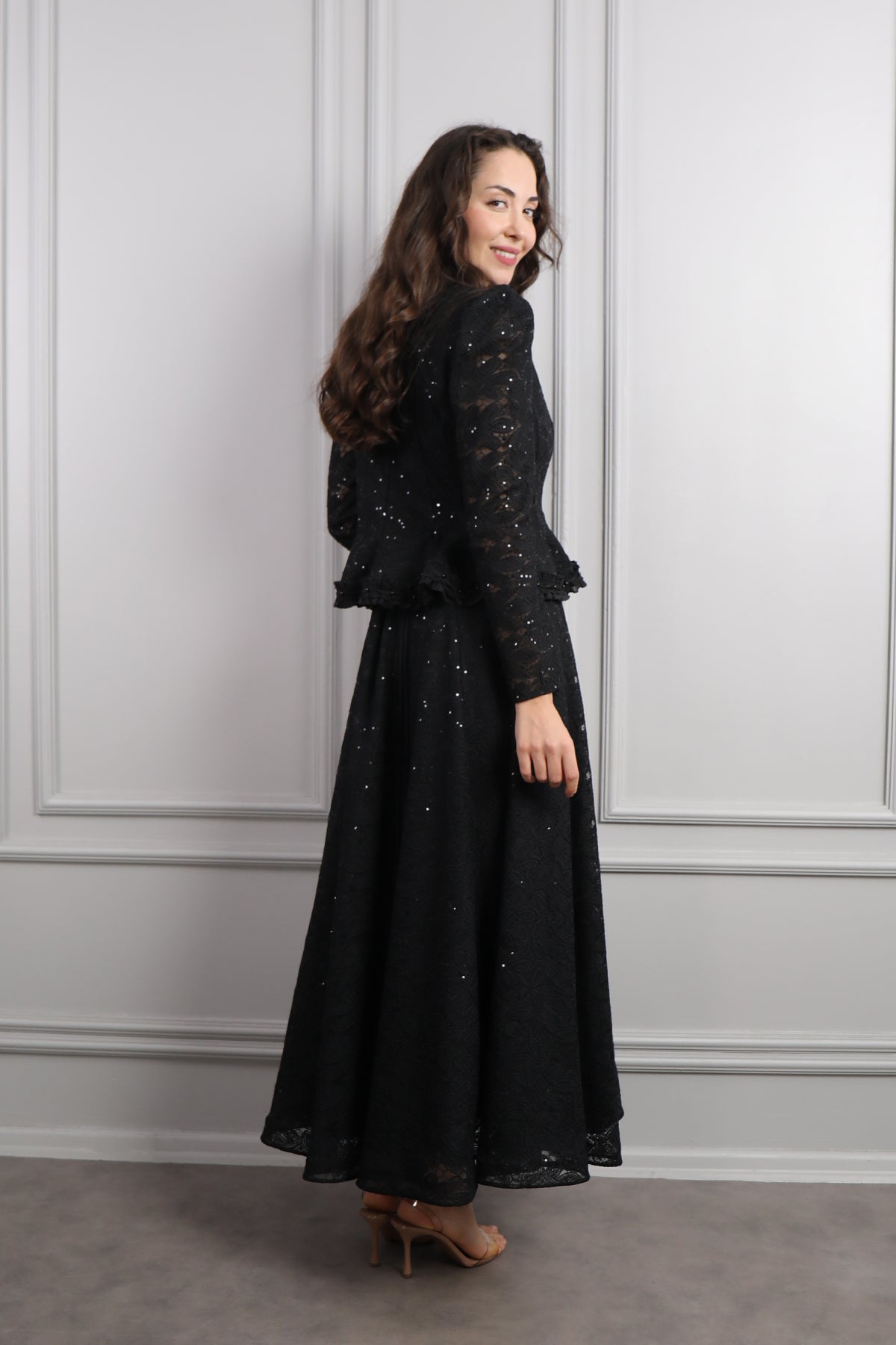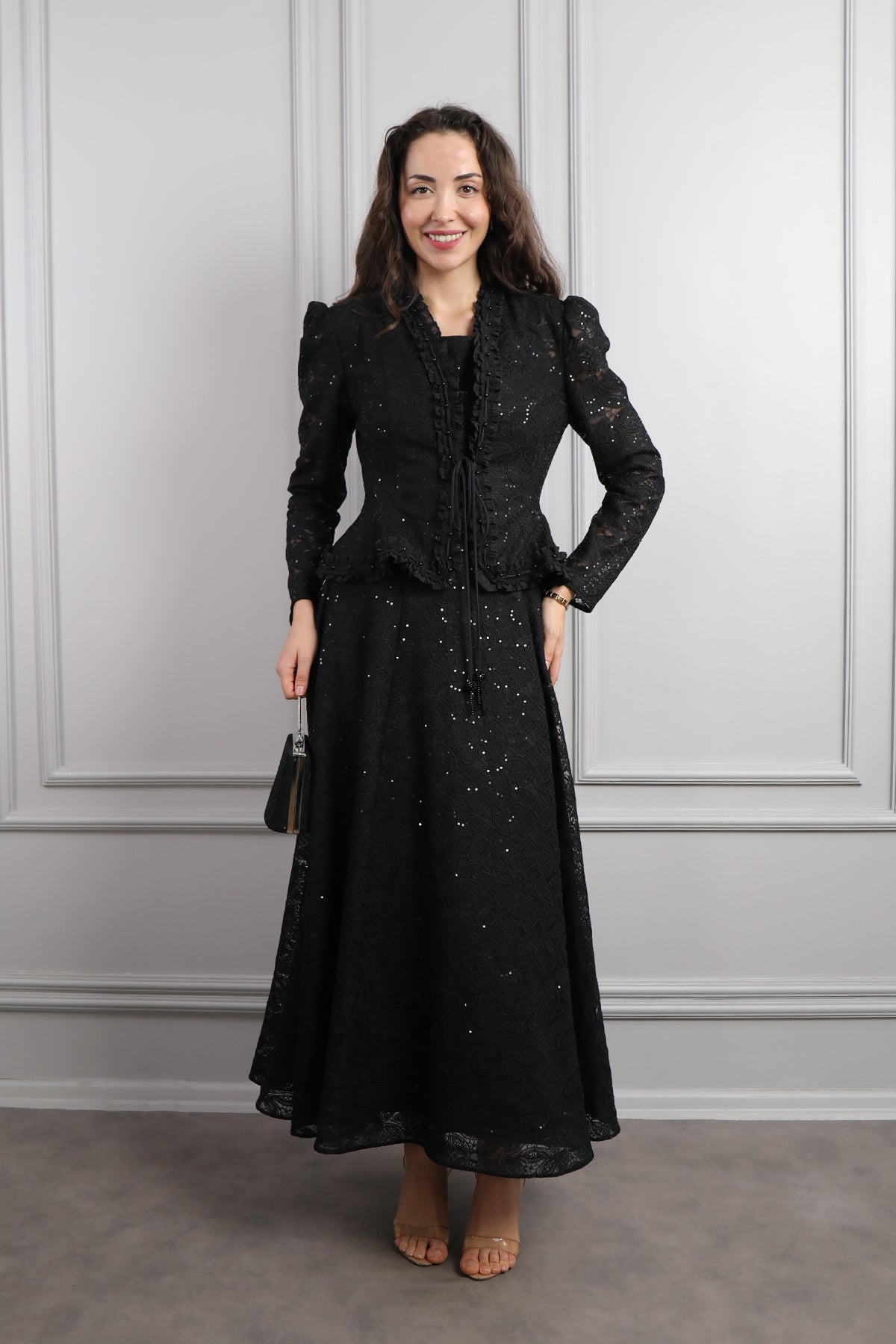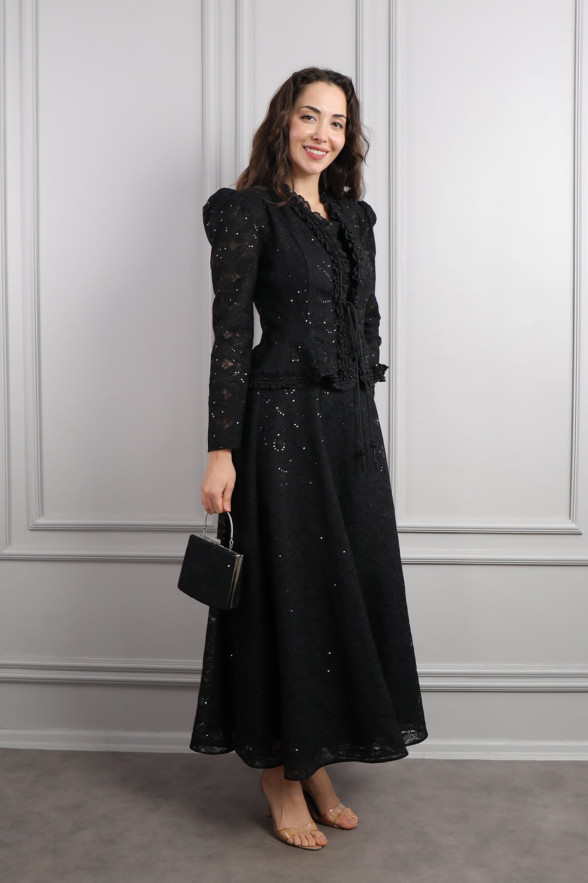 Kalın askılı kare yaka elbisemizin tamamı dantel kumaş kullanılarak tasarlanırken sırt kısmı iplerle korsaj görünümü verilerek oluşturulmuştur. Belinden aşağı hafif kabararak inen elbisemizin takımı olan boncuk detaylı ceketi dantel kumaştan oluşturularak bütünlük sağlanmıştır. Ön kısmı iplerle bağlanan ceket takımımızın çanta aksesuarıyla tamamlanarak şık görünüm kazandırılırken özel gün veya davetlerinizde tercih etmeniz için ideal seçim olacaktır.