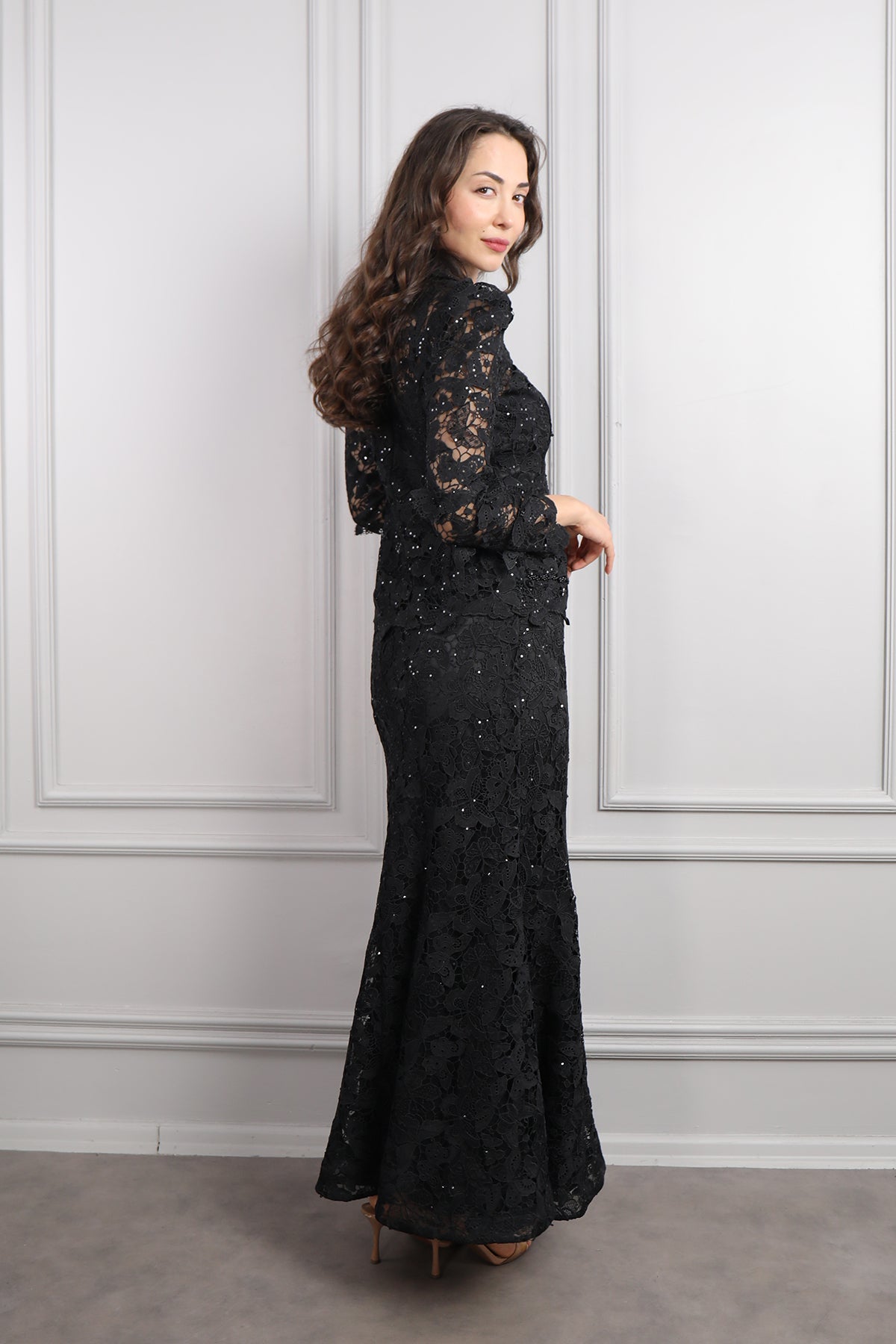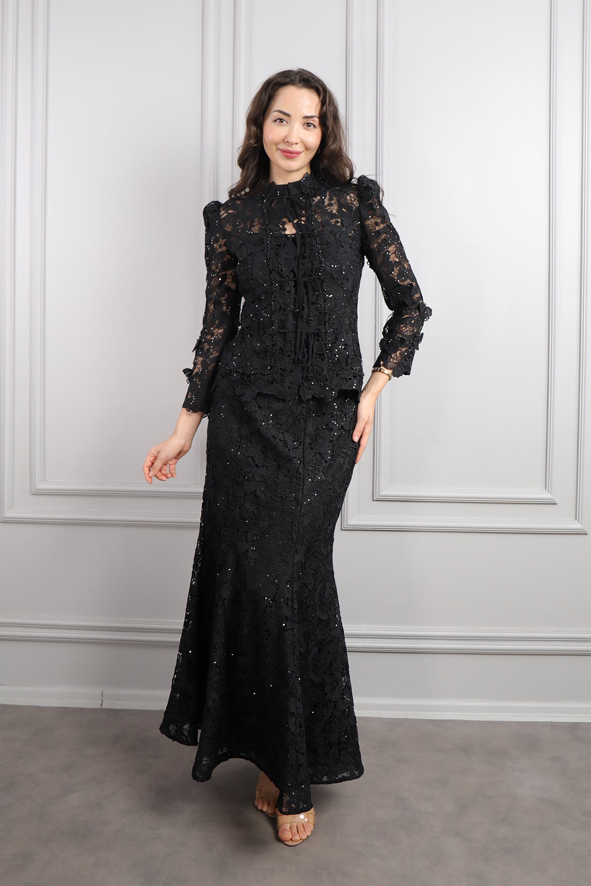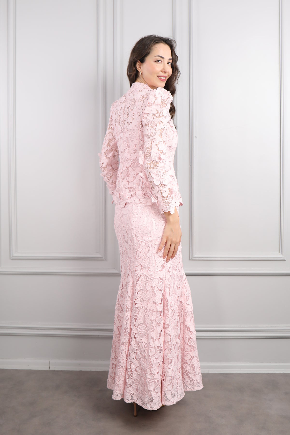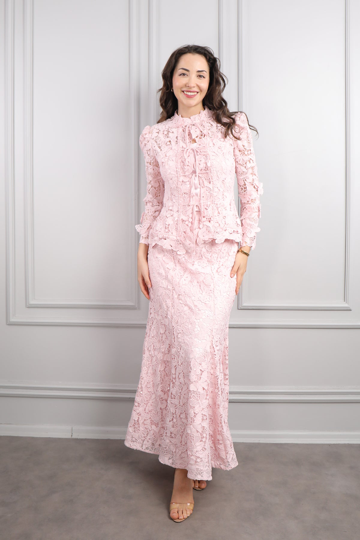 Feminen ve sofistike bir görünüm arayanların ilk tercihi olacak bu takım, zarif detaylarıyla dikkat çekiyor. İnci işlemeleri ve kelebek motifleri, takıma romantik bir dokunuş katarken; önü bağlamalı tasarımı modern bir şıklık sunuyor. Hem özel davetlerde hem de şık akşam yemeklerinde rahatlıkla tercih edilebilecek bir parça, uzun etek formu, zarif dantel dokusu ve kusursuz kalıbı sayesinde hem konforlu hem de estetik bir duruş sağlıyor. Özellikle düğün, nişan, söz ve davet gibi özel günlerde zarafetinizi ön plana çıkaracak bu takım, gardırobunuzun en özel parçalarından biri olmaya aday.