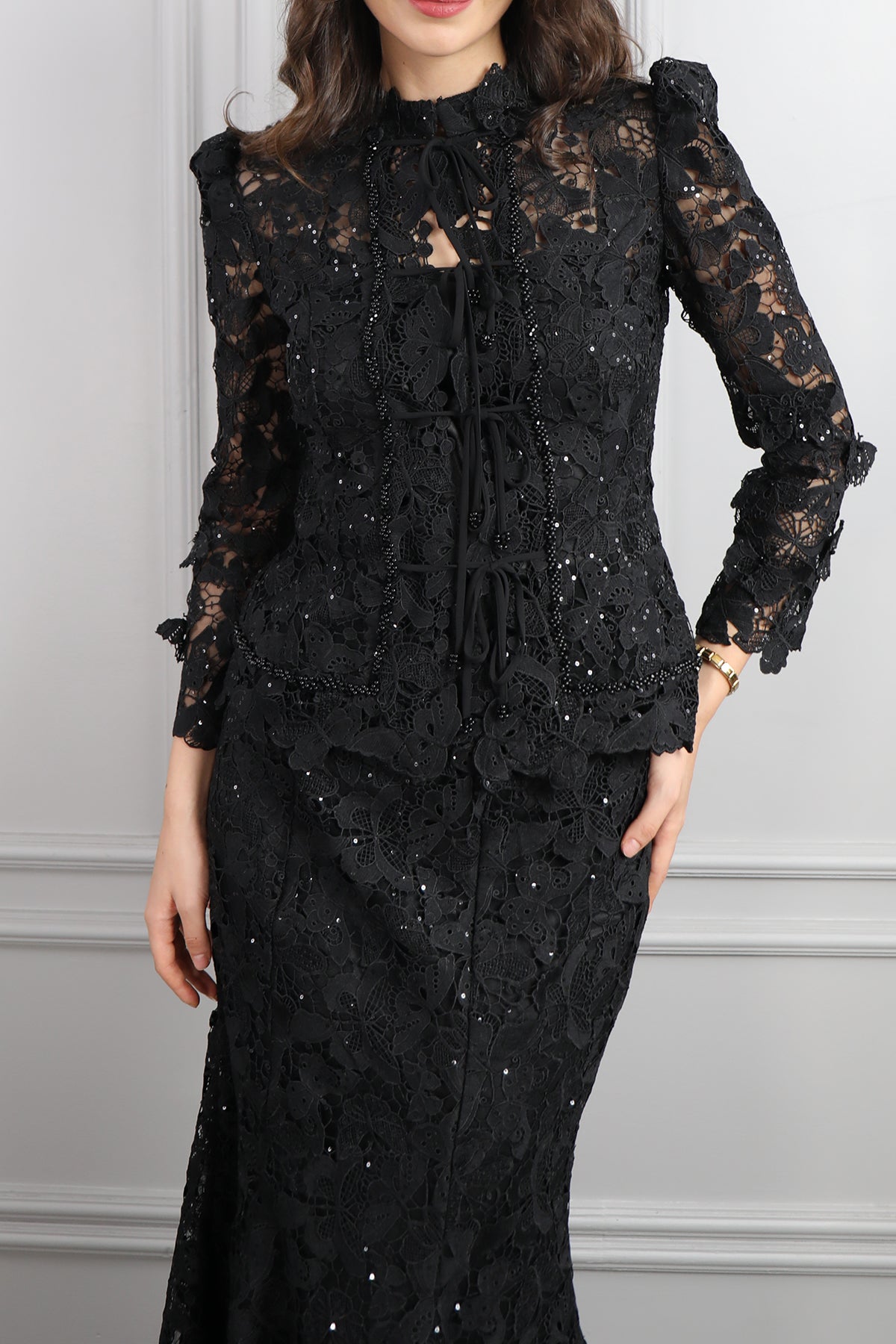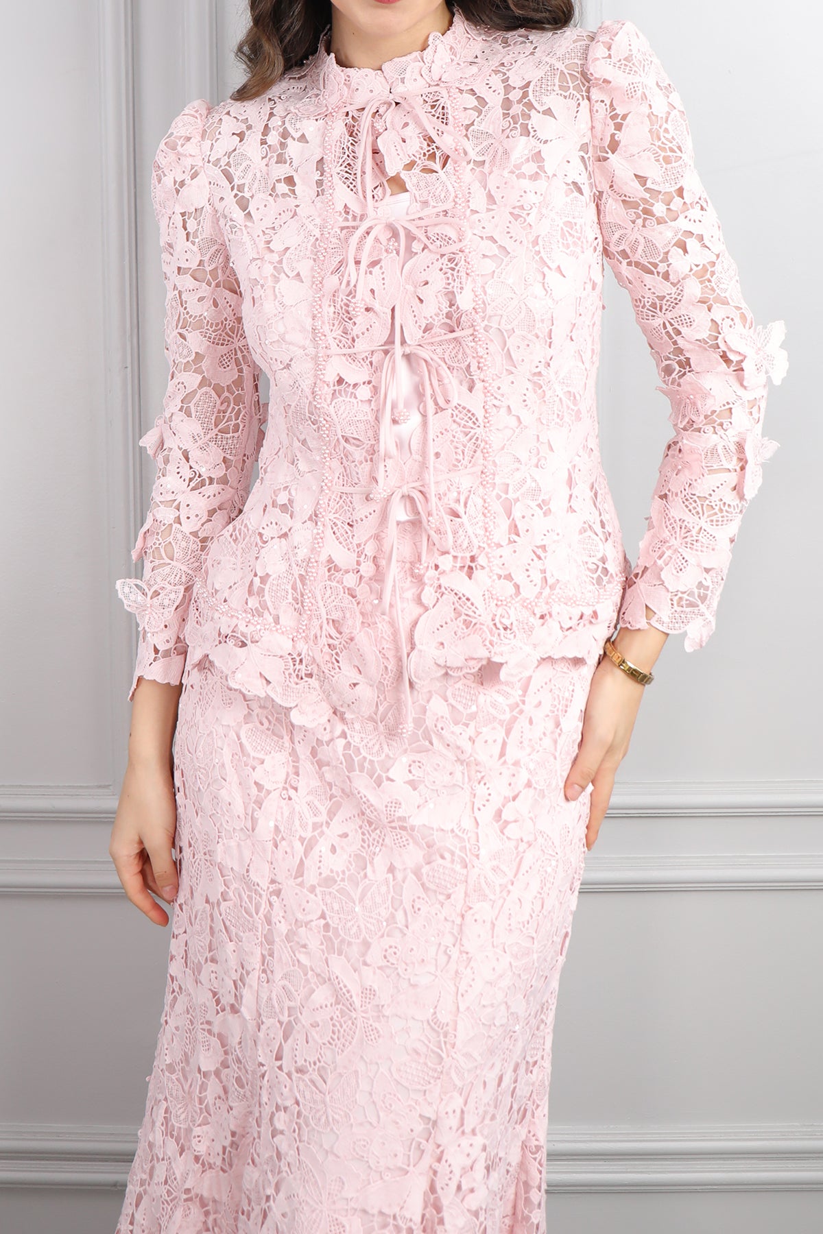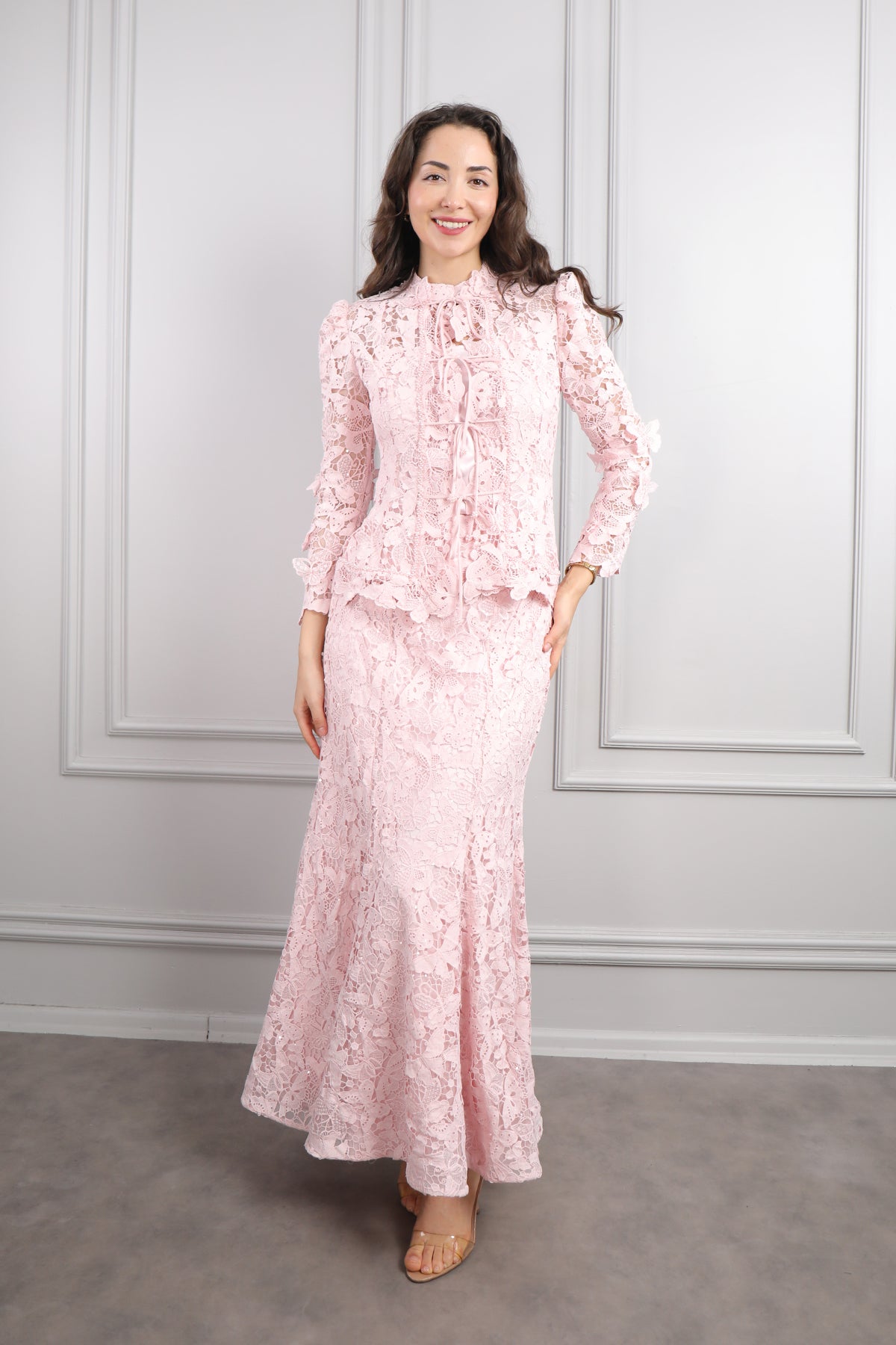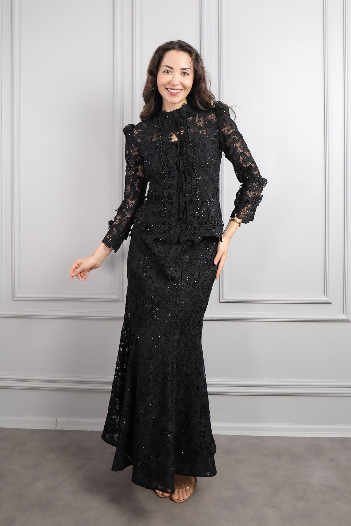 Feminen ve sofistike bir görünüm arayanların ilk tercihi olacak bu takım, zarif detaylarıyla dikkat çekiyor. İnci işlemeleri ve kelebek motifleri, takıma romantik bir dokunuş katarken; önü bağlamalı tasarımı modern bir şıklık sunuyor. Hem özel davetlerde hem de şık akşam yemeklerinde rahatlıkla tercih edilebilecek bir parça, uzun etek formu, zarif dantel dokusu ve kusursuz kalıbı sayesinde hem konforlu hem de estetik bir duruş sağlıyor. Özellikle düğün, nişan, söz ve davet gibi özel günlerde zarafetinizi ön plana çıkaracak bu takım, gardırobunuzun en özel parçalarından biri olmaya aday.