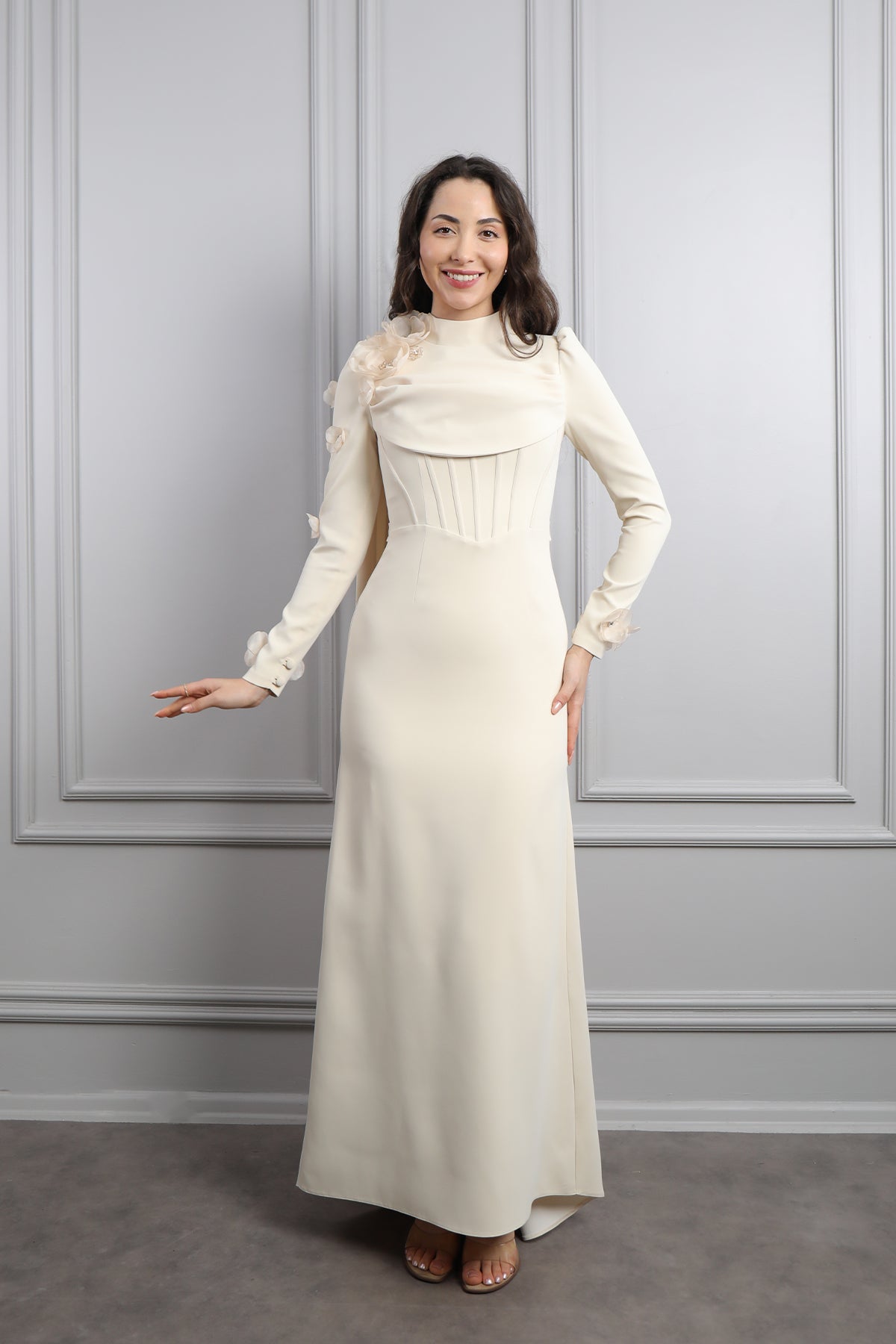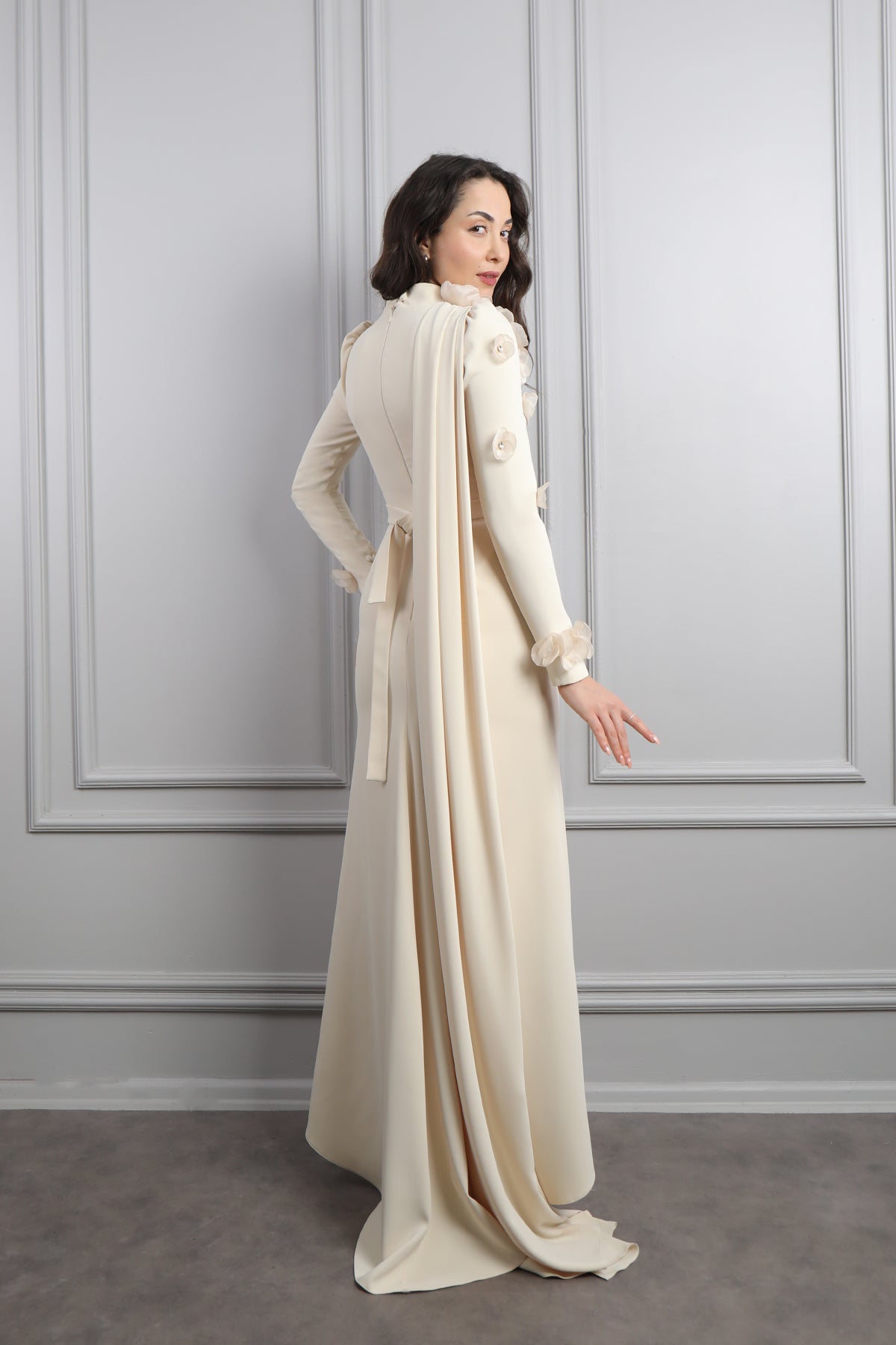 Önü Degaje Detaylı Çiçek İşlemeli Pelerinli Tesettür Abiye Bej Özellikleri