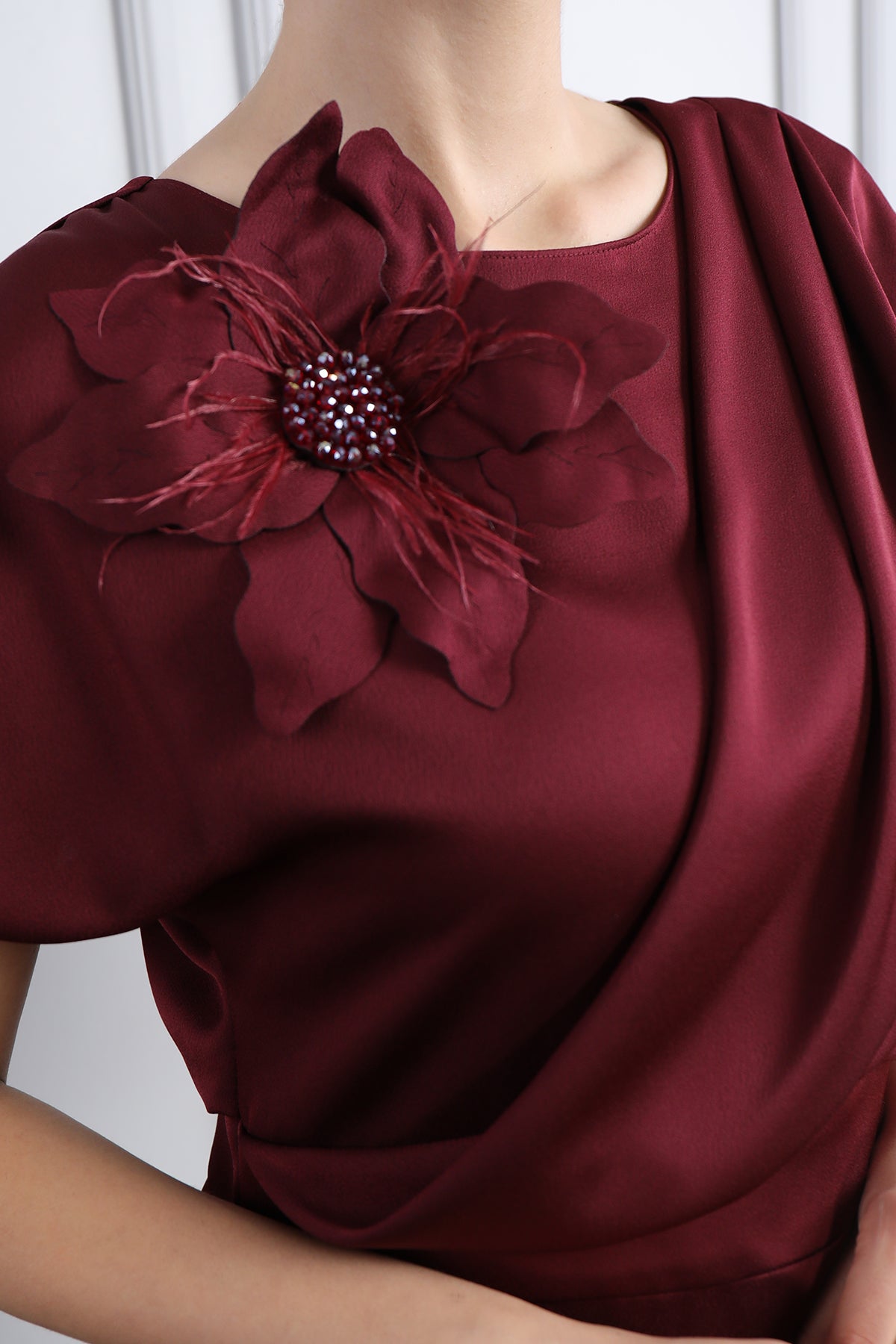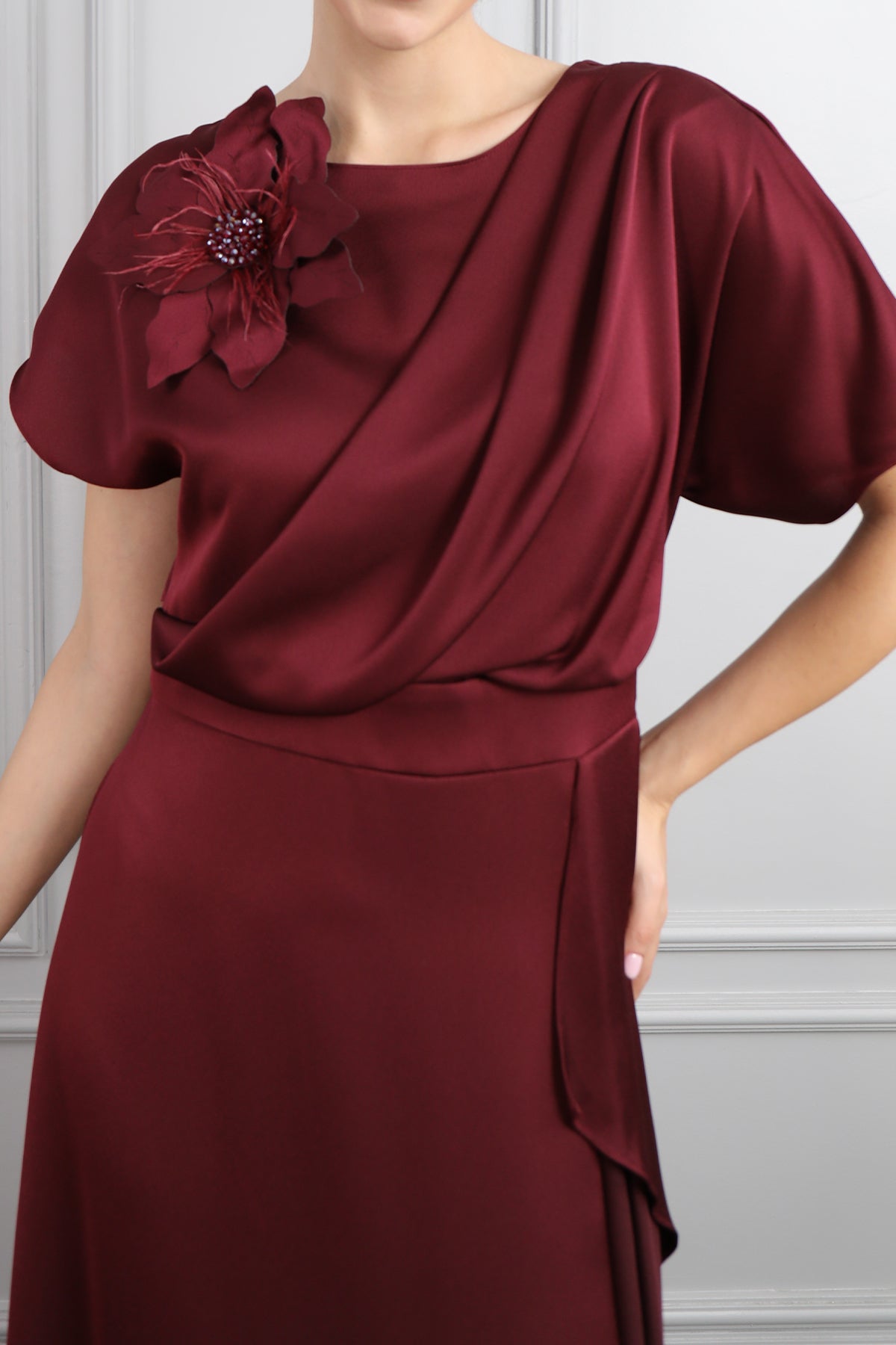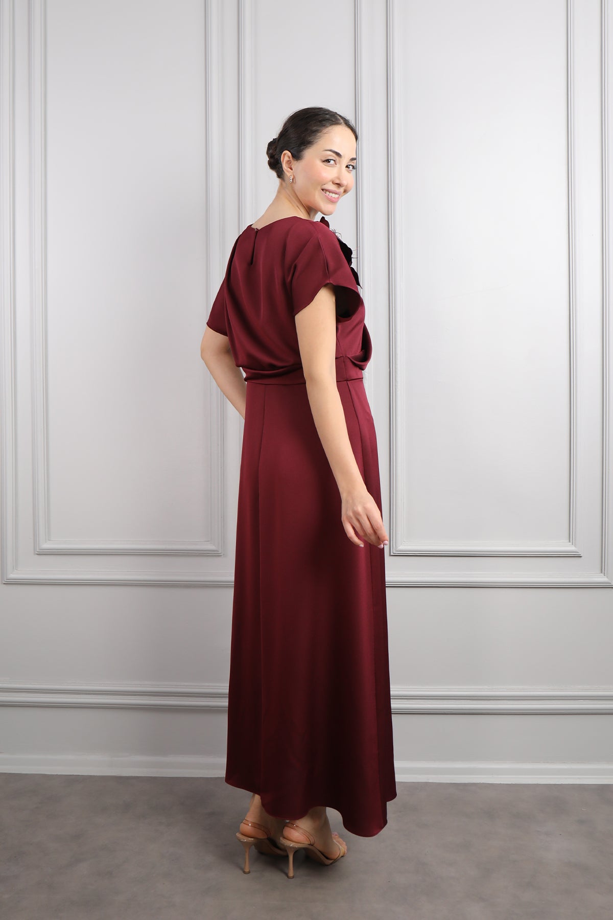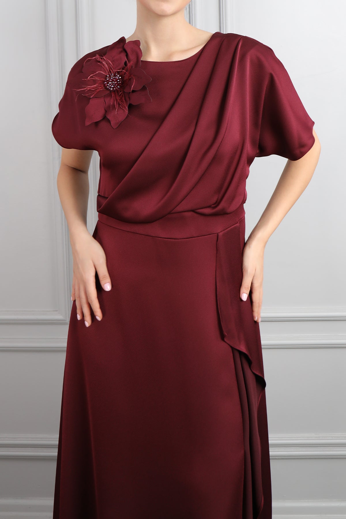 Önü Drapeli Çiçek Detaylı Büyük Beden Midi Boy Saten Elbise Vişne