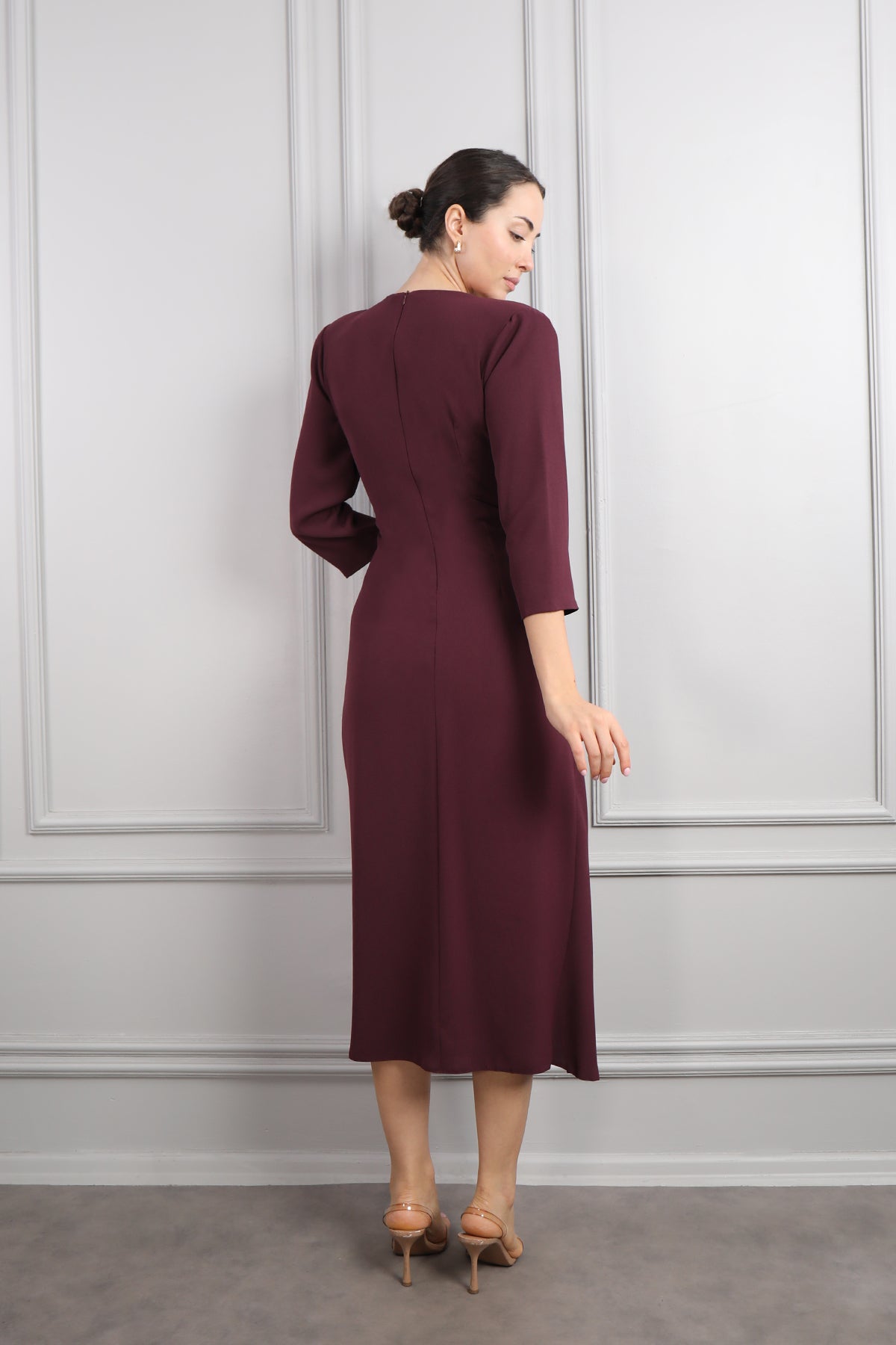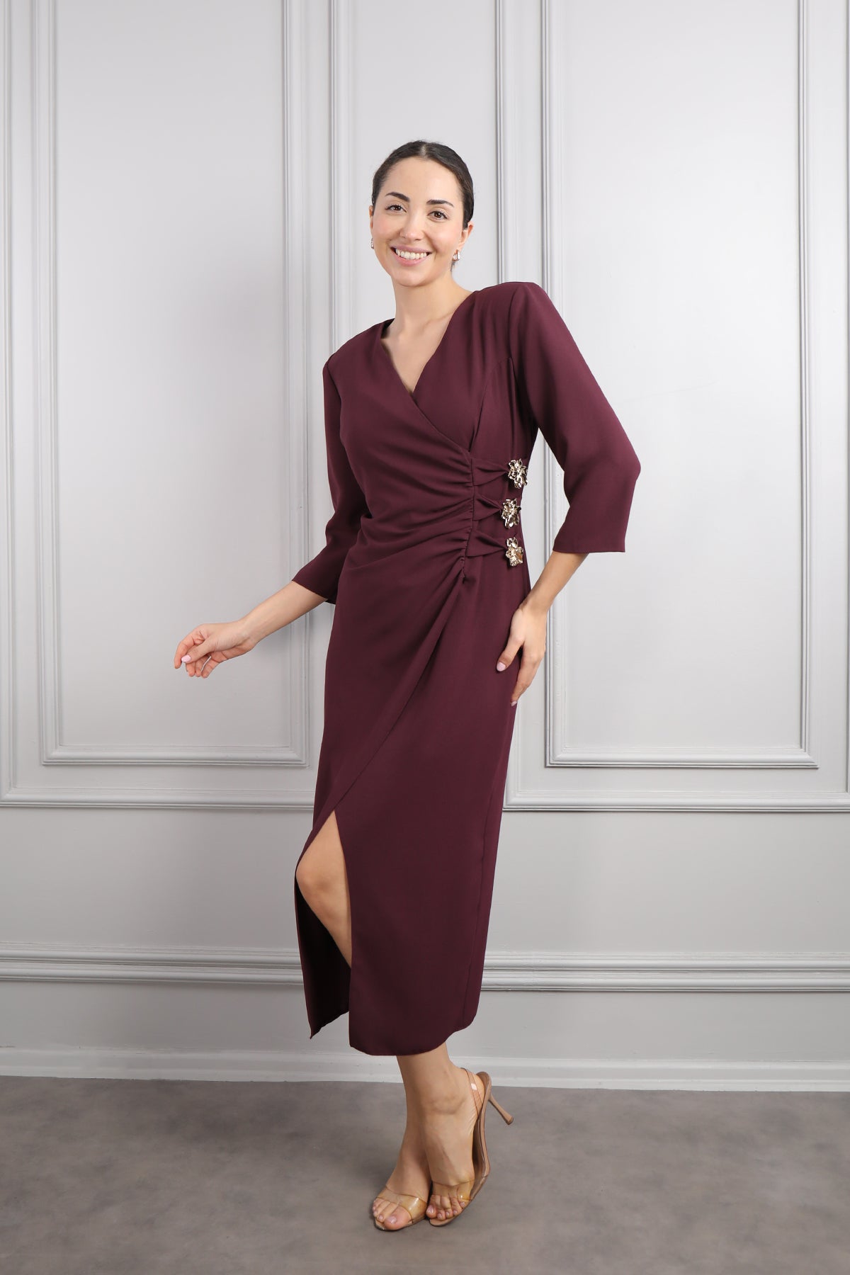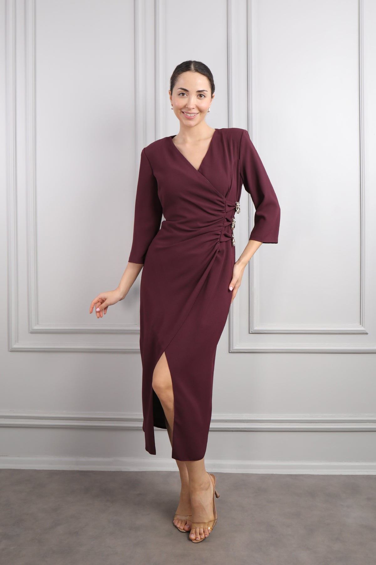 Önü Düğme Detaylı Drapeli Midi Boy Elbise Mürdüm