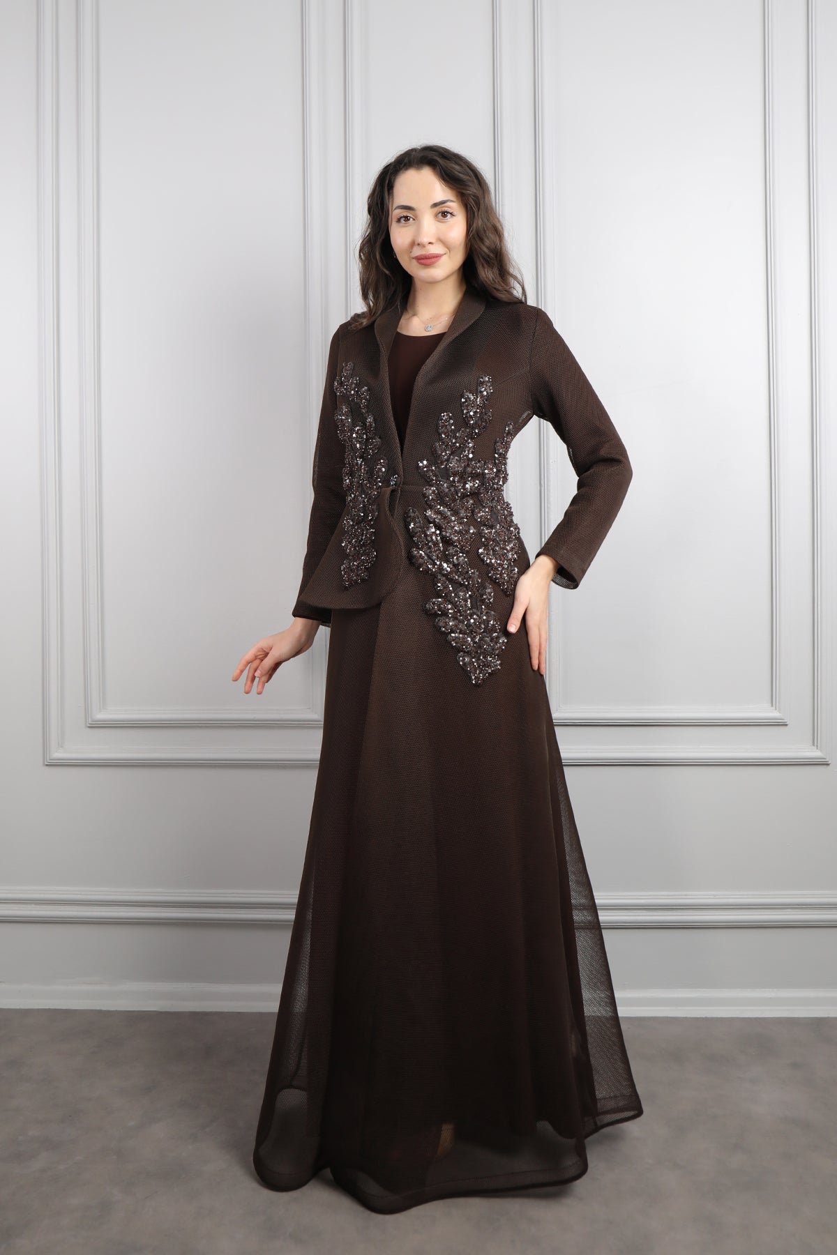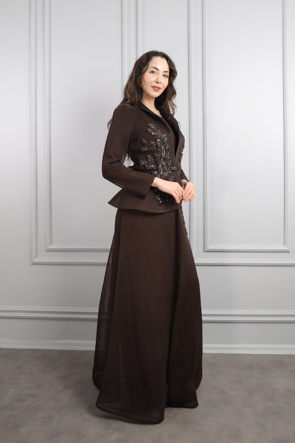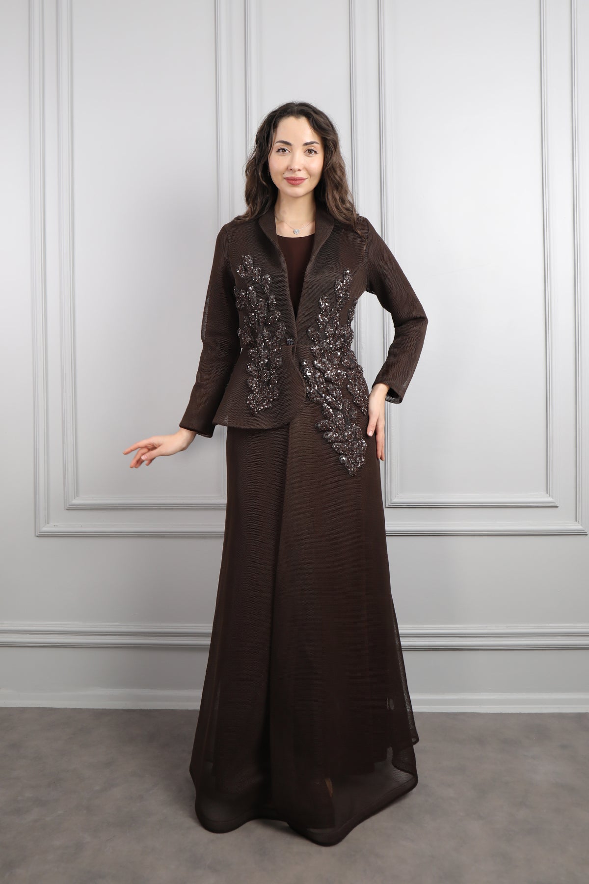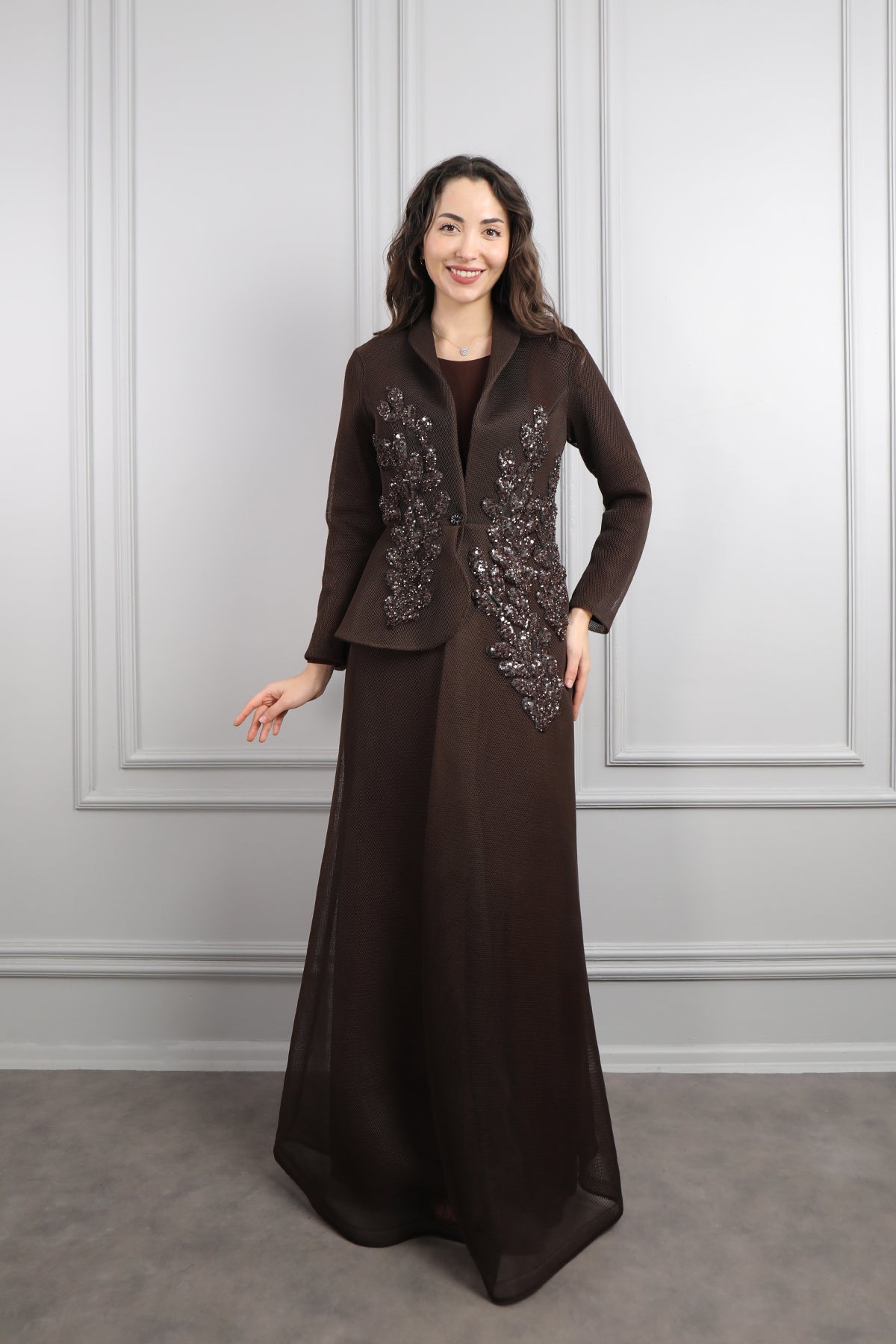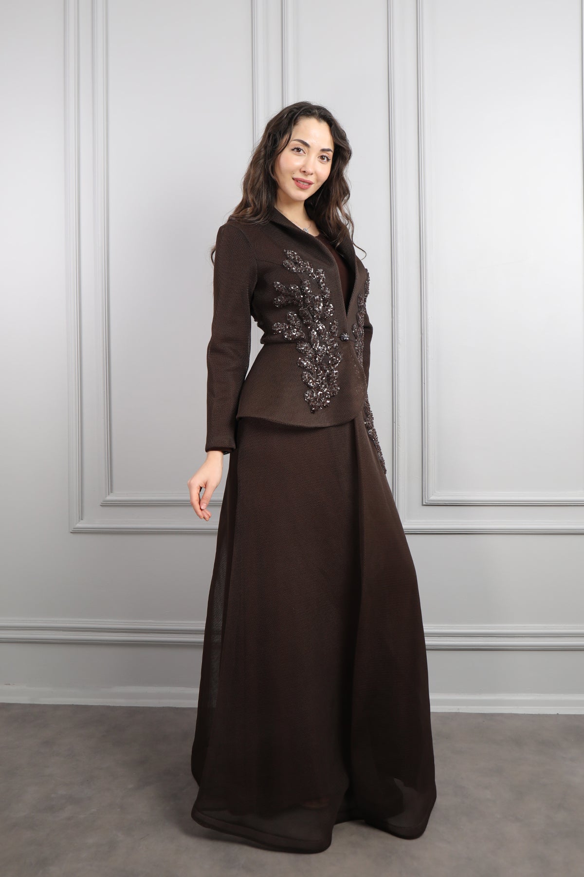 Önü Düğmeli Boncuk İşlemeli Ceket Takım Kahve