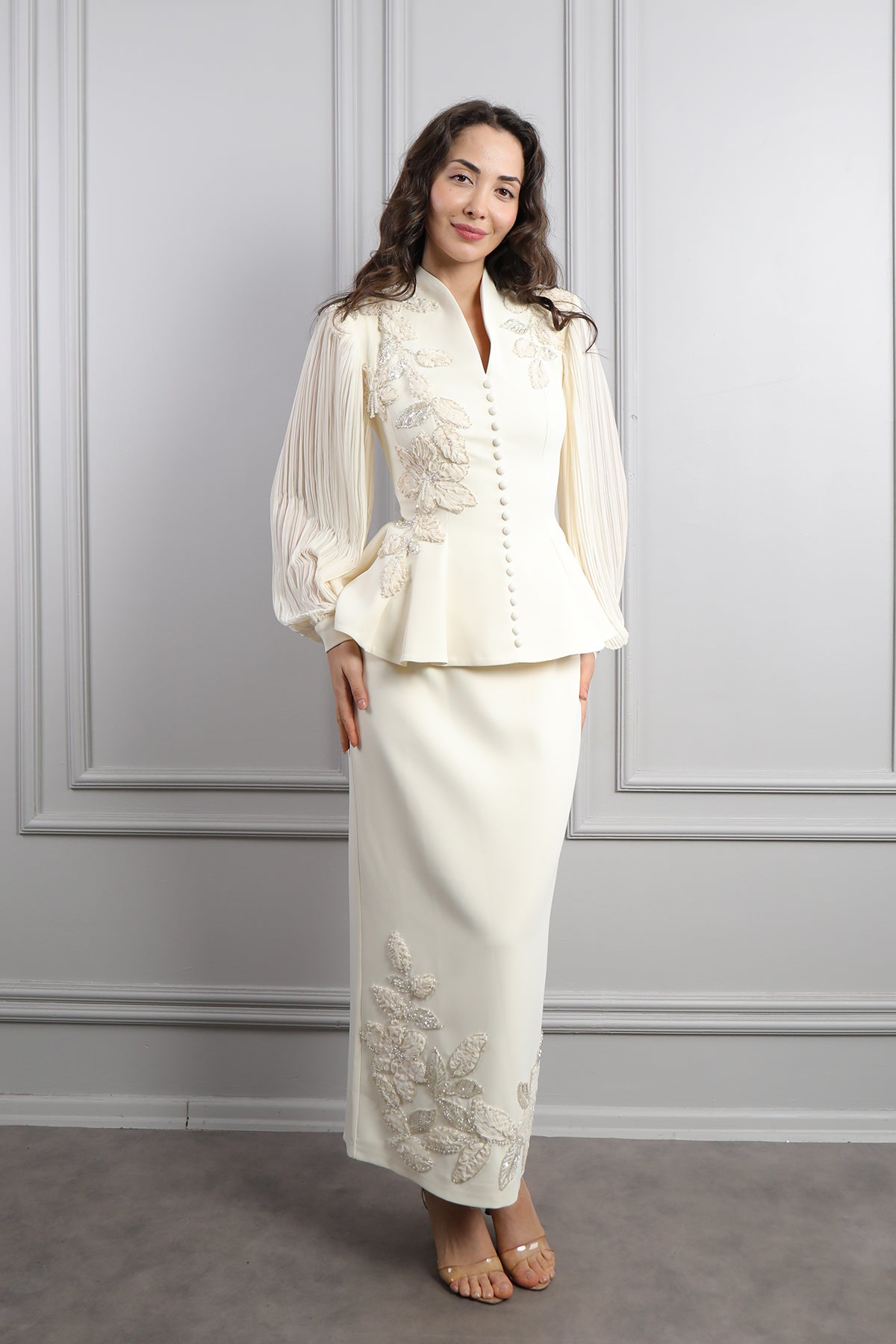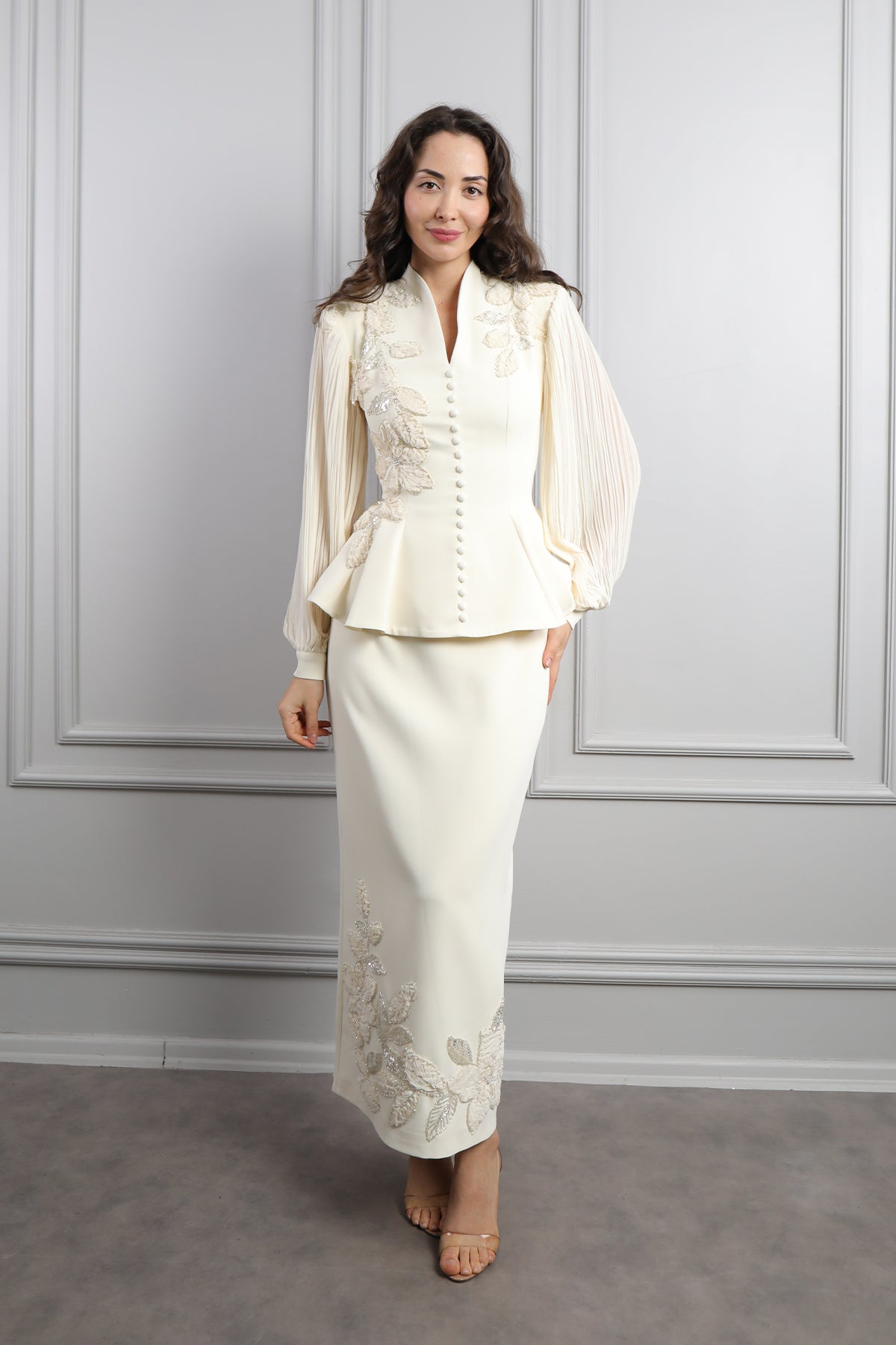 Önü Düğmeli Boncuk İşlemeli Etek Takım Ekru