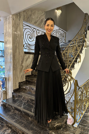 Önü Düğmeli Yandan Bağlamalı Çiçek Desenli Kadife Etek Takım Siyah Özellikleri