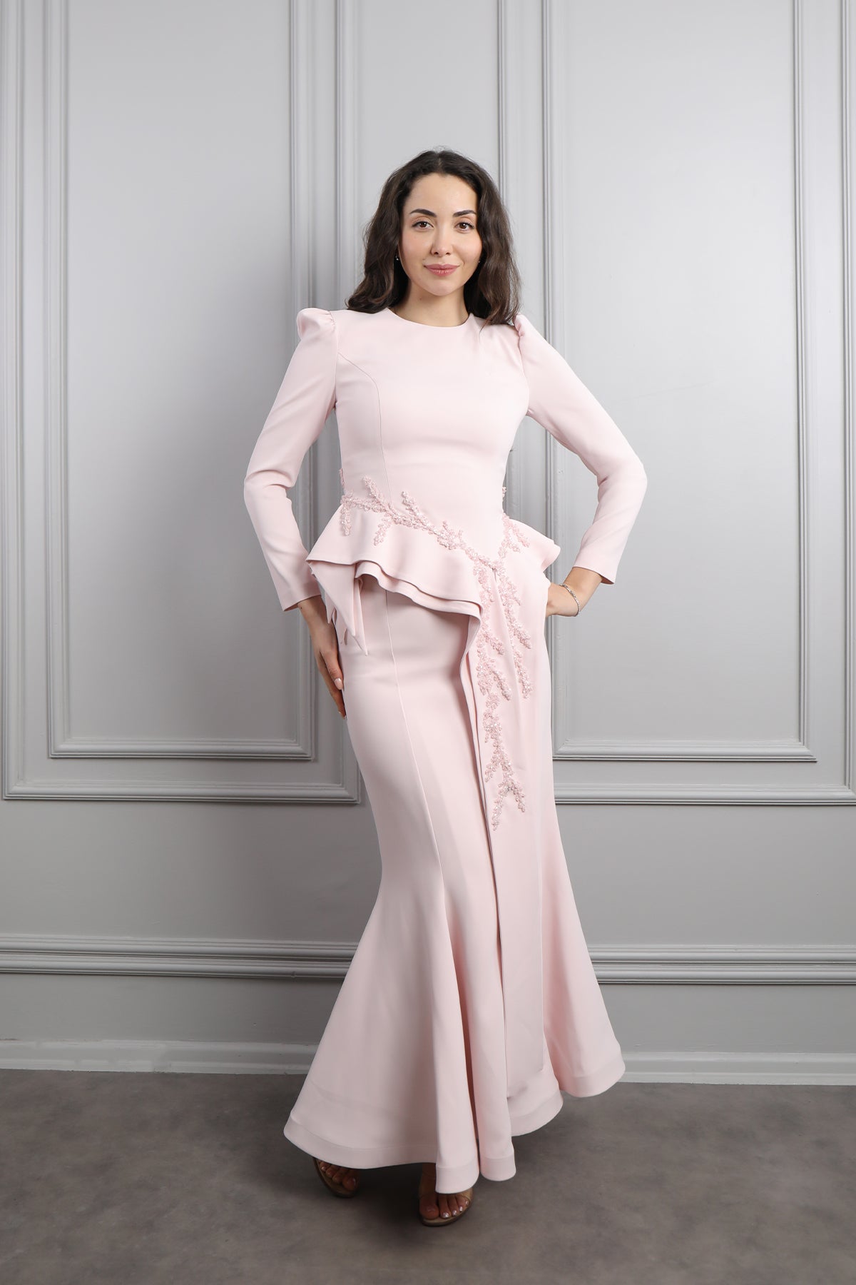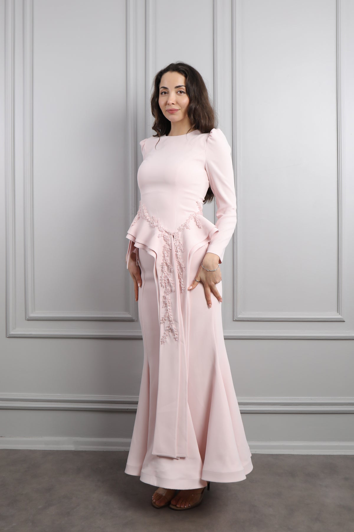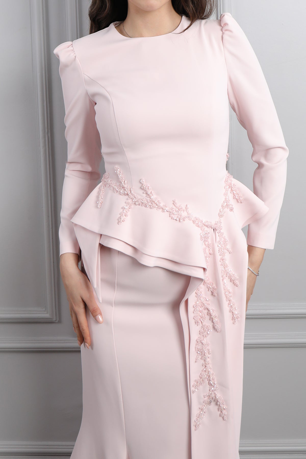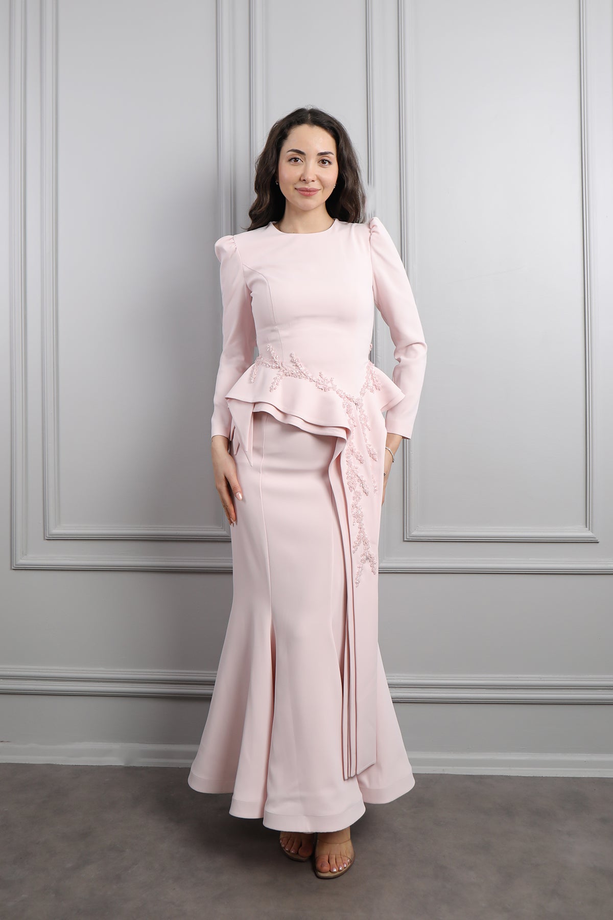 Oval Yaka Boncuk İşlemeli Pelerin Detaylı Etek Takım Pudra Özellikleri