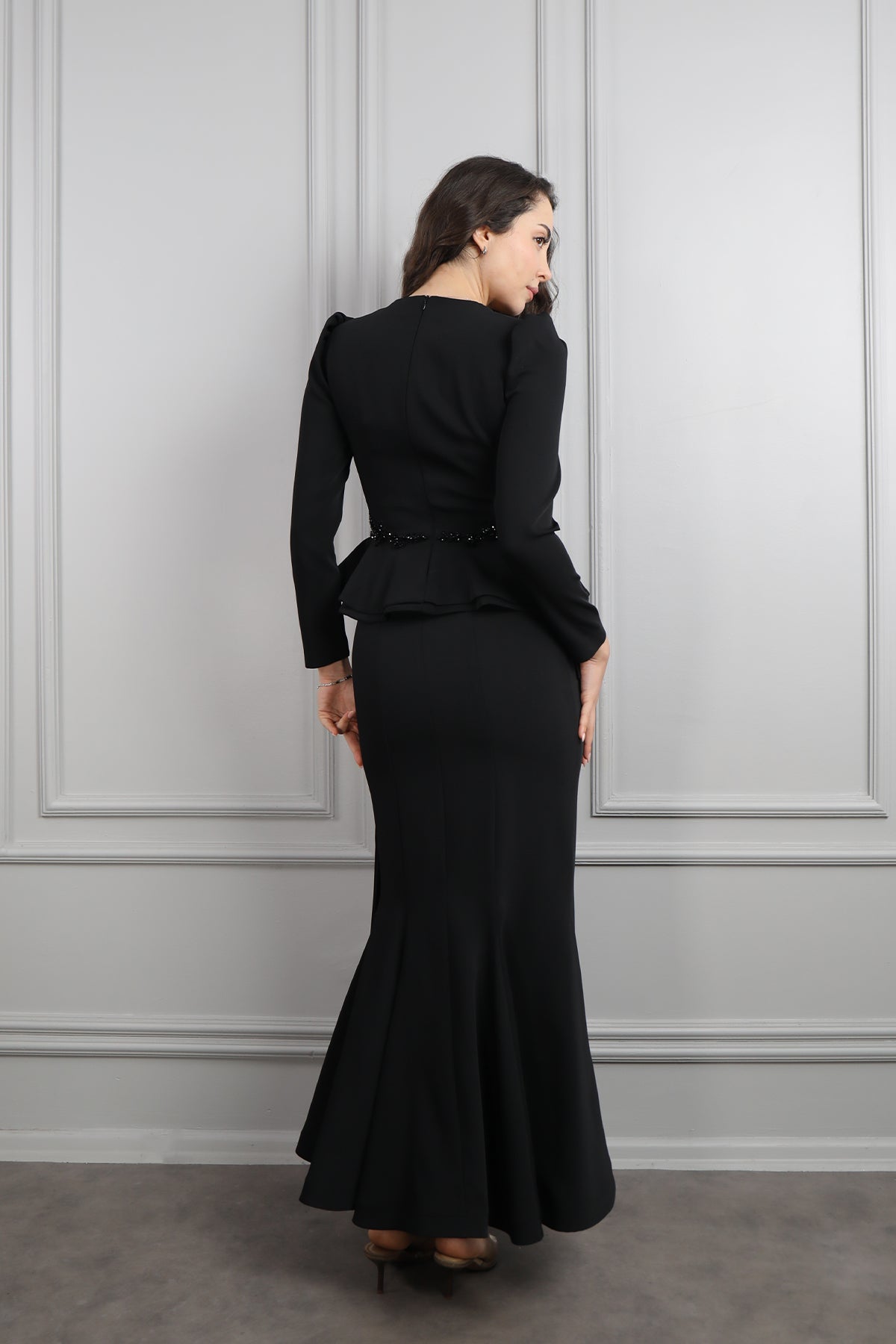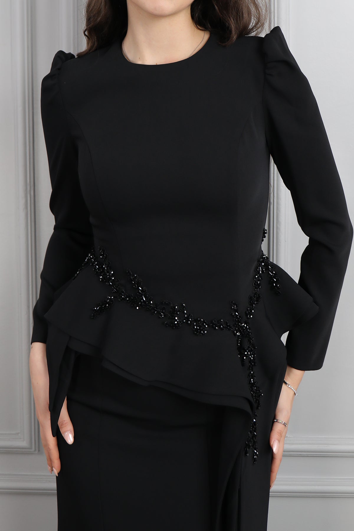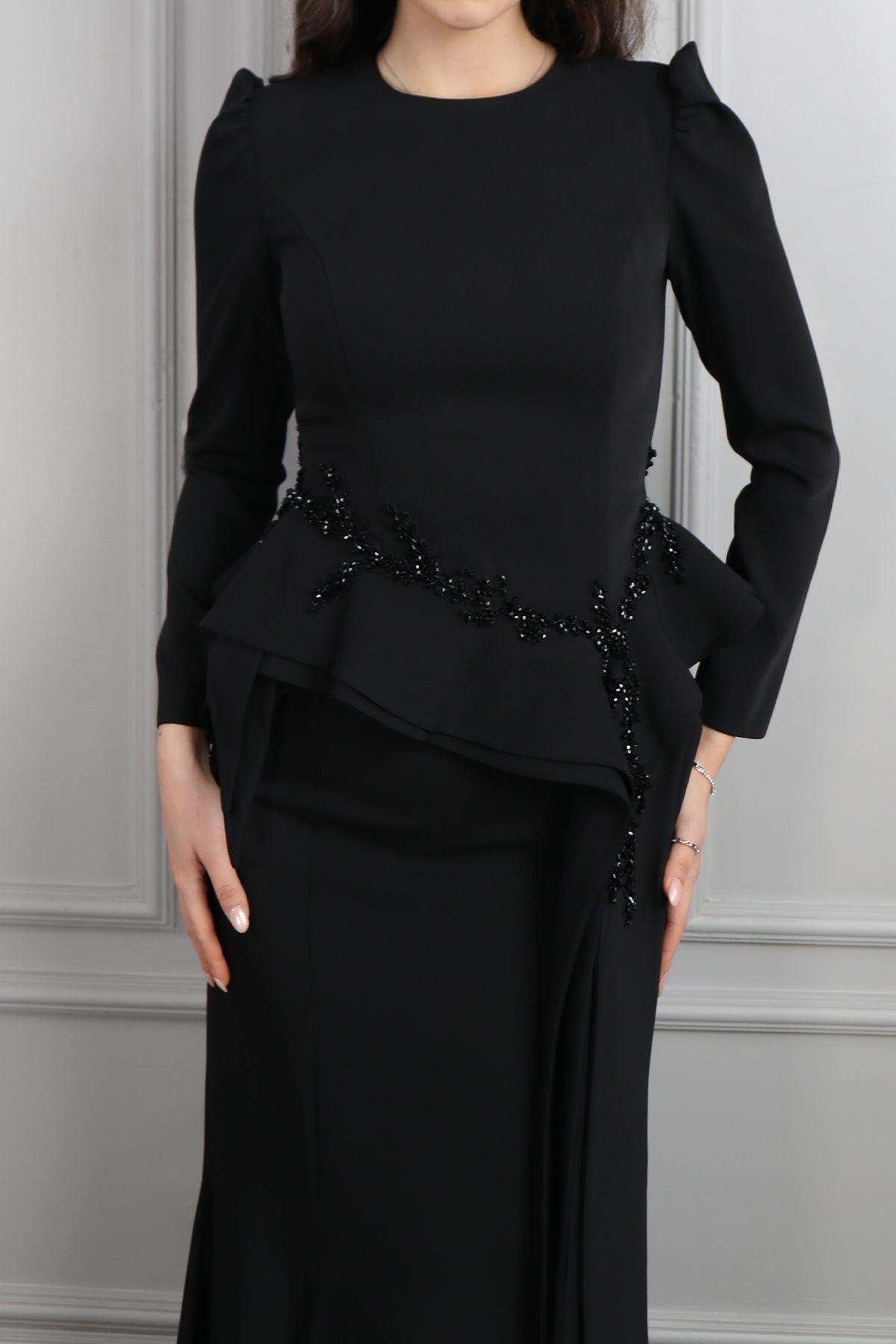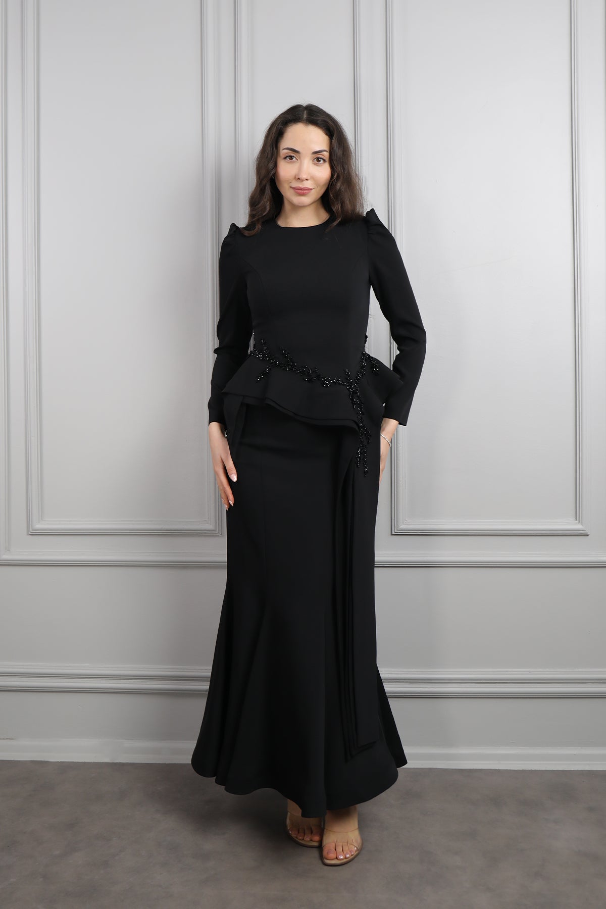 Oval Yaka Boncuk İşlemeli Pelerin Detaylı Etek Takım Siyah Özellikleri