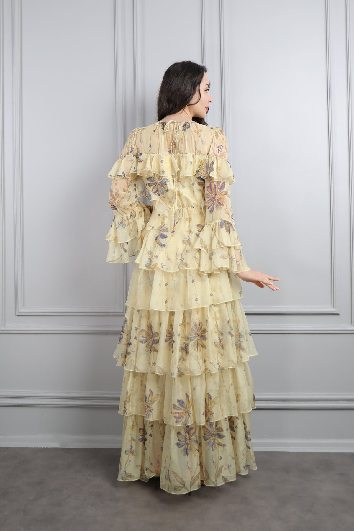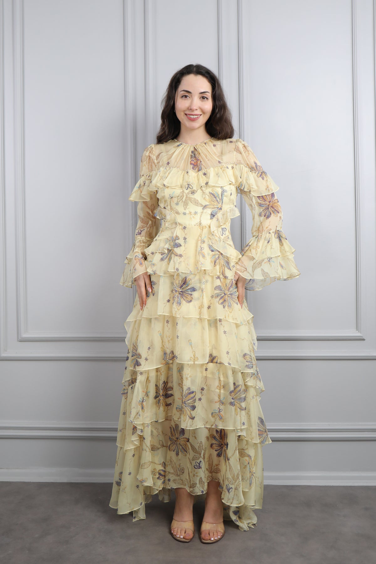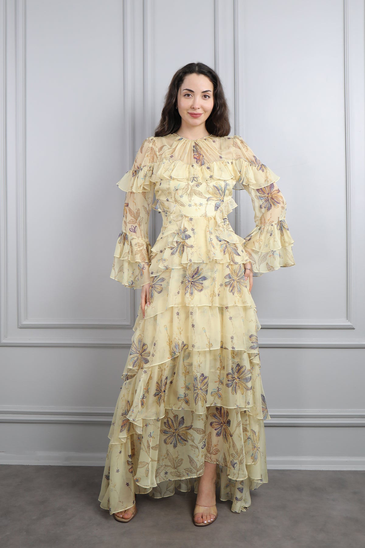 Oval Yaka Fırfırlı Desenli Büyük Beden Şifon Elbise Sarı