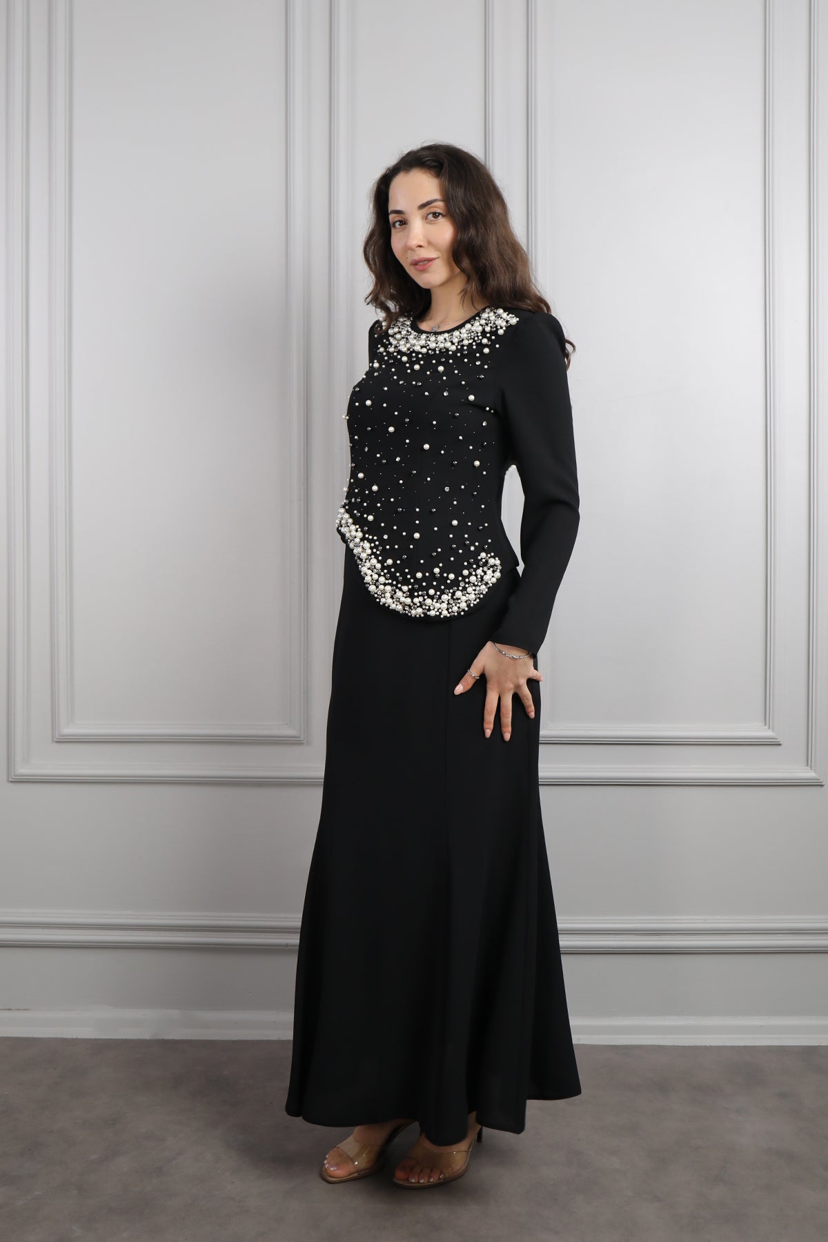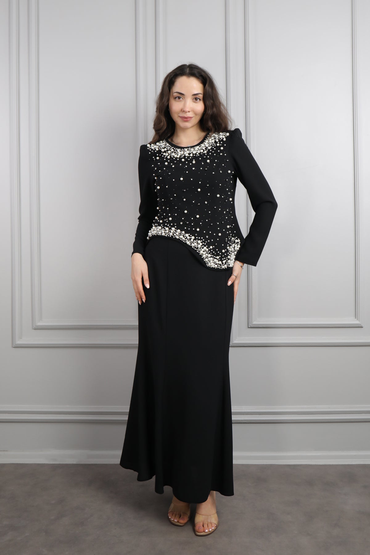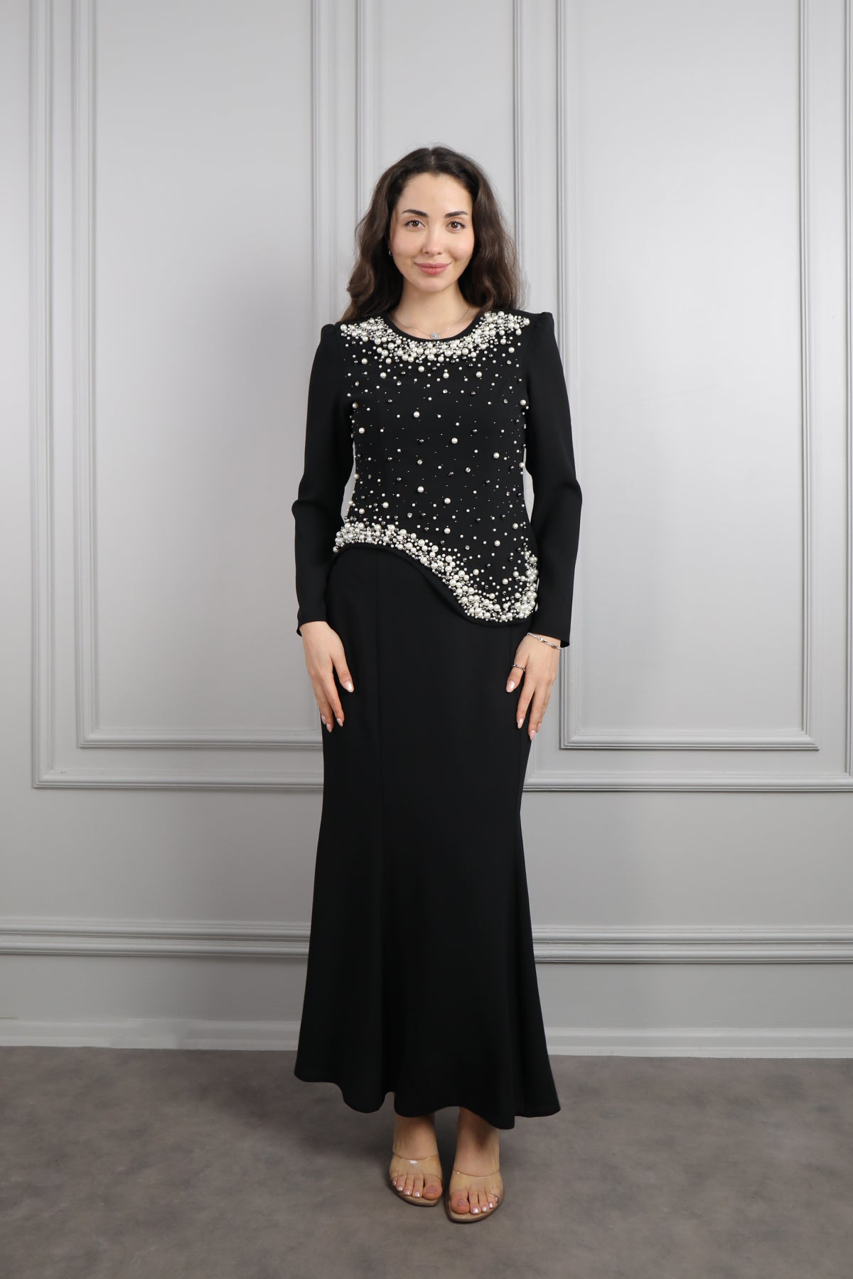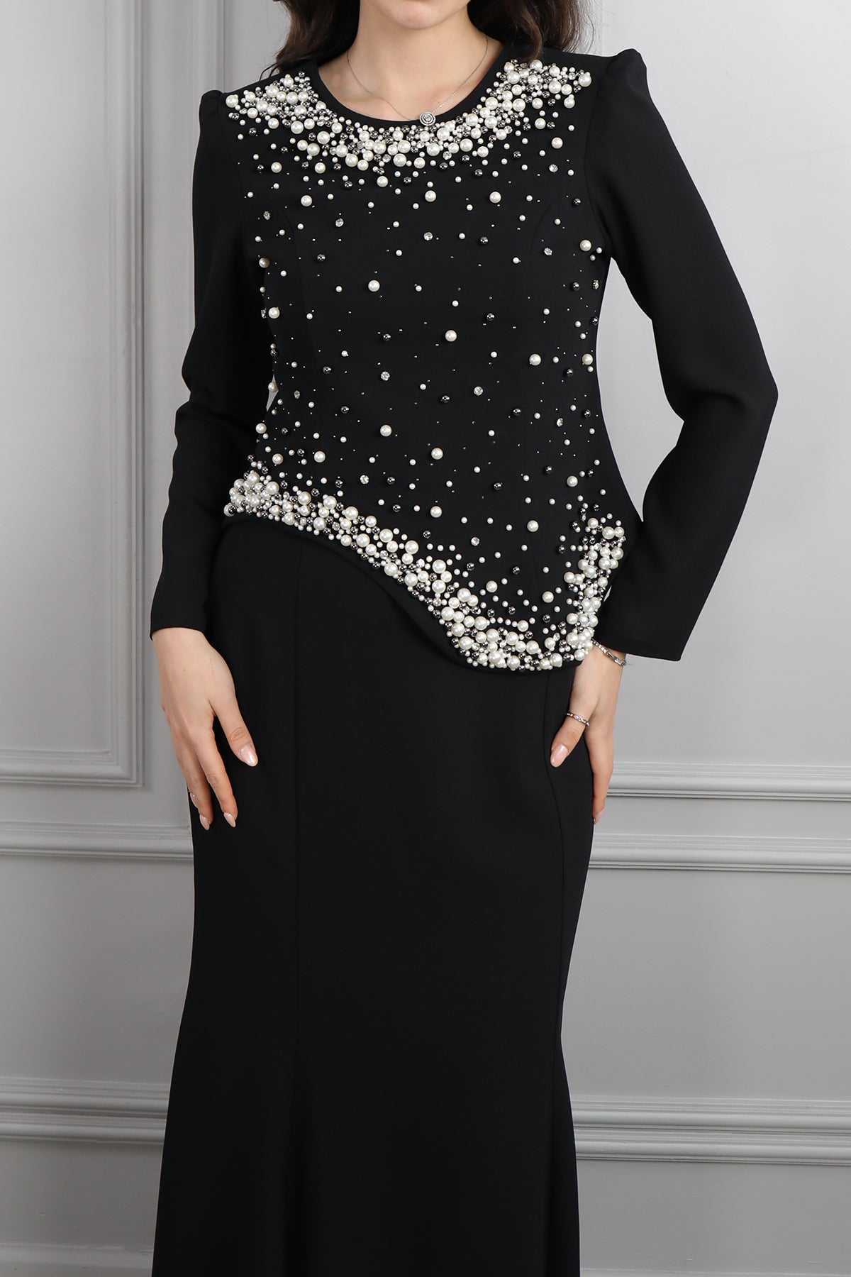 Oval Yaka İnci İşlemeli Büyük Beden Etek Takım Siyah Özellikleri