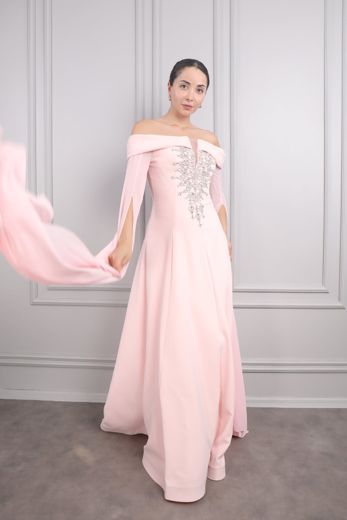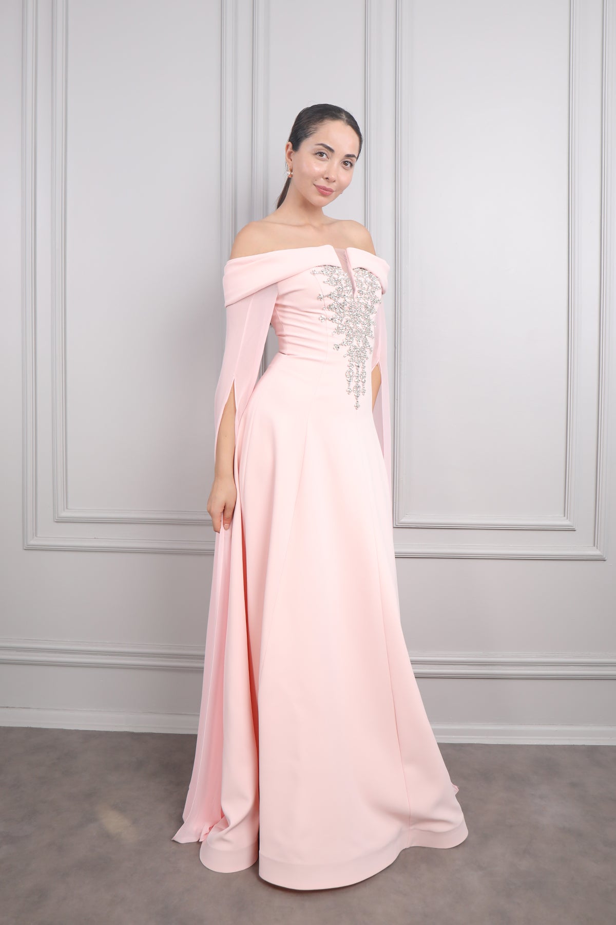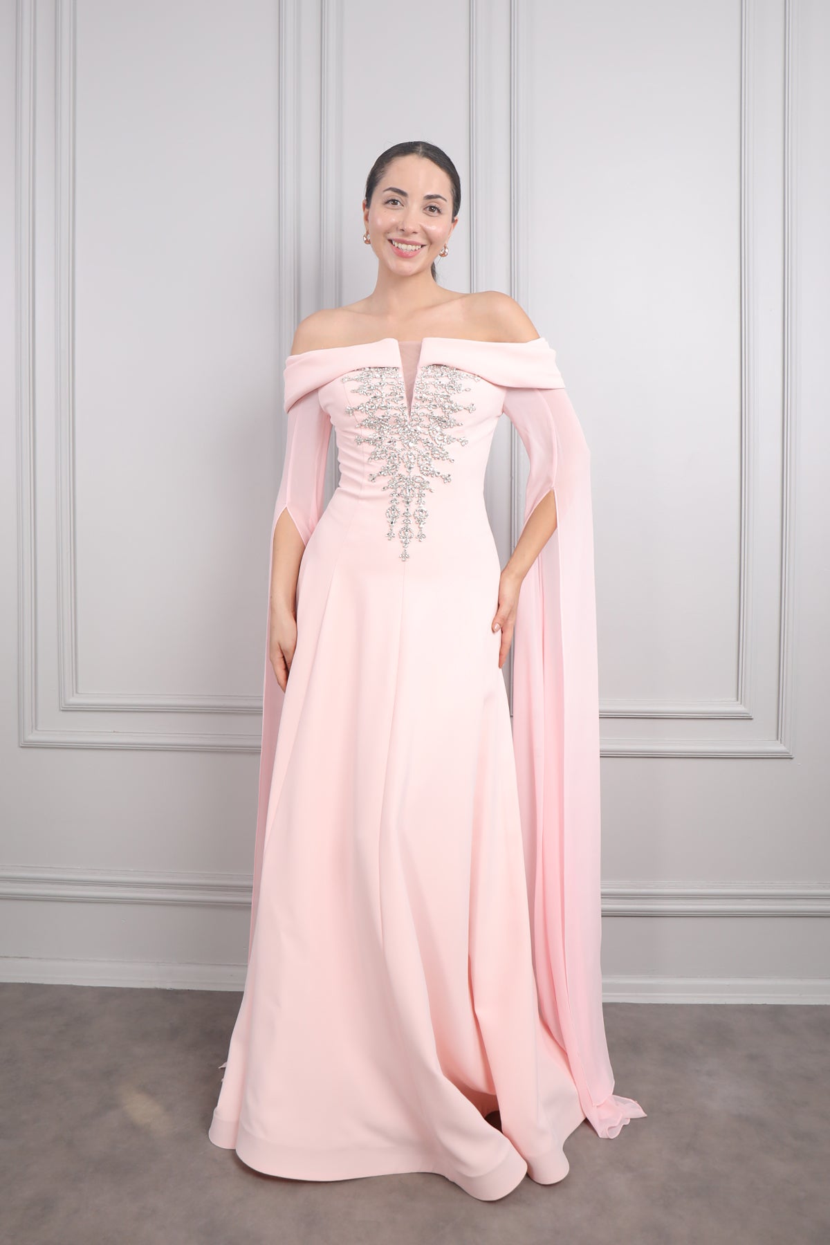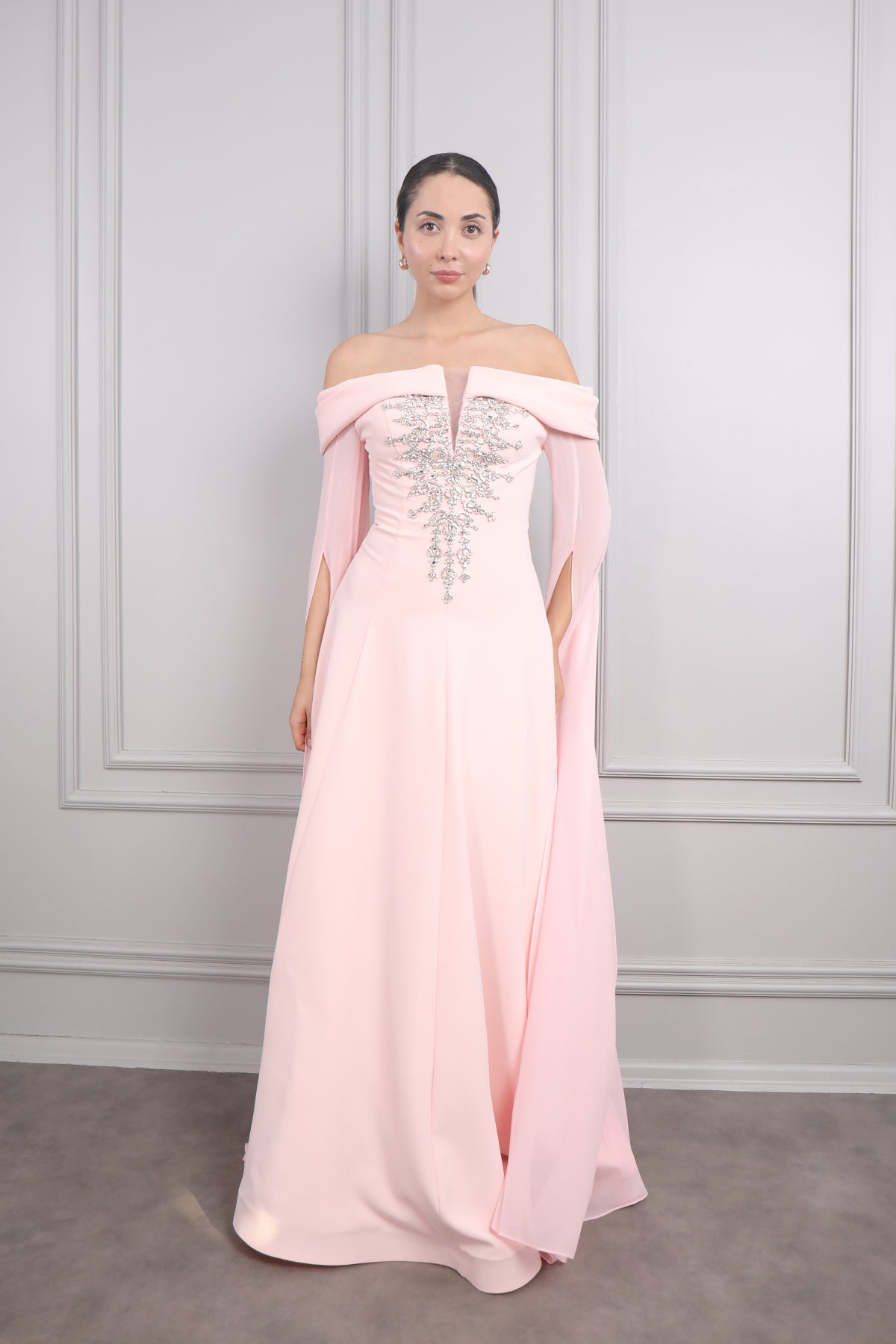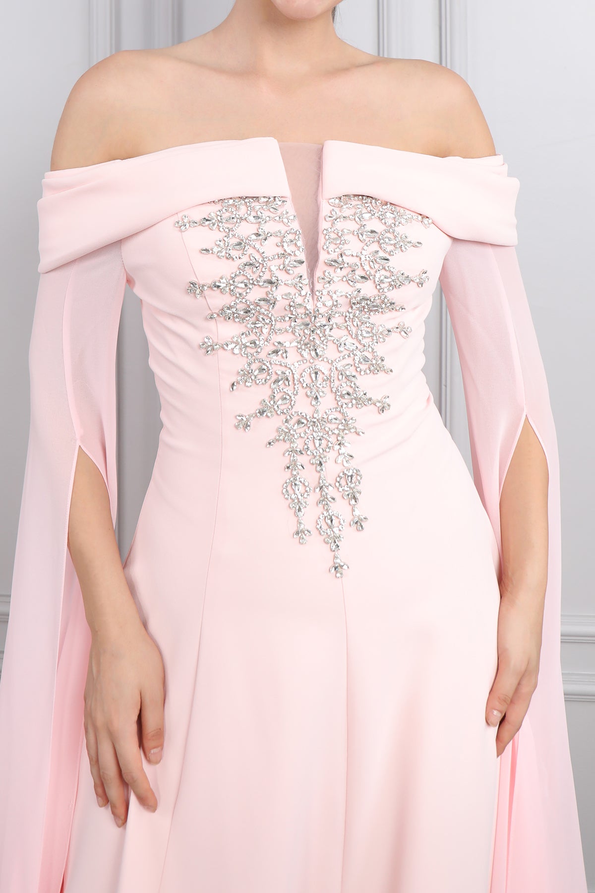 Kayık Yaka Önü Taş Detaylı Kolları Pelerinli Abiye Pembe