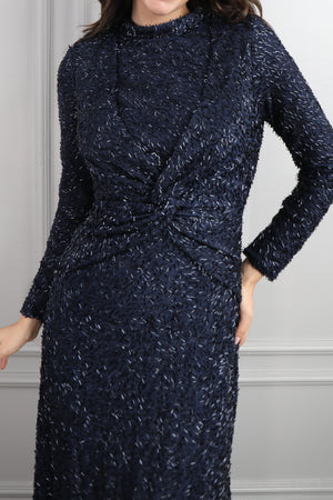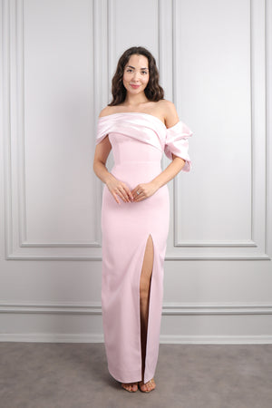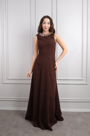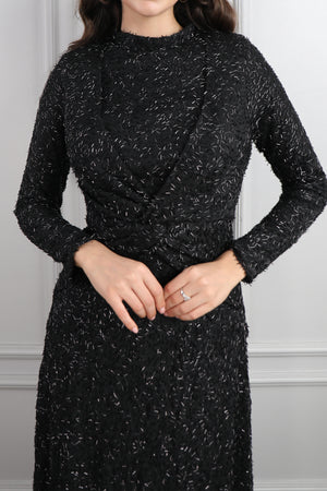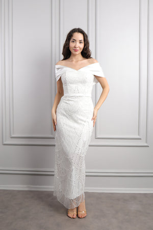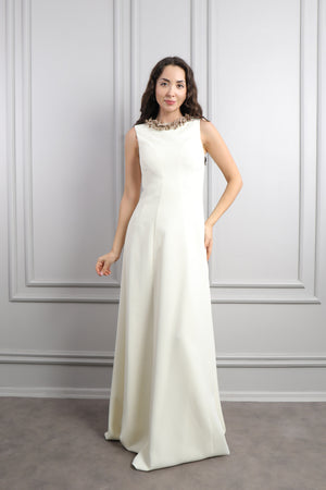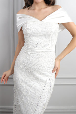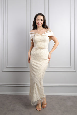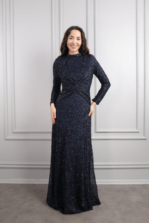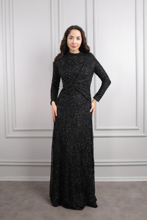 Hakim yaka elbisemizin üst kısmı dantel kumaş eklenerek tasarlanırken drapelerle desteklenerek hareketlendirilmiştir. Ön kısmı pencere görünümünde incilerle süslenirken üst kısmının etek ucuna incilerle pile görünümü verilerek bütünlük oluşturulmuştur. Bol bir şekilde inen eteğiyle göz alıcı bir tasarıma sahip modern elbisemizi özel günlerinizde tercih etmeniz sizler için ideal bir seçim olacaktır.