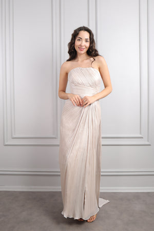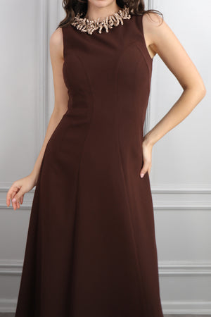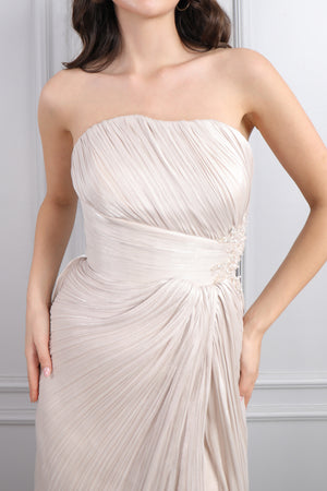 Hakim Yaka İnci İşlemeli Eteği Pileli Elbise Pudra