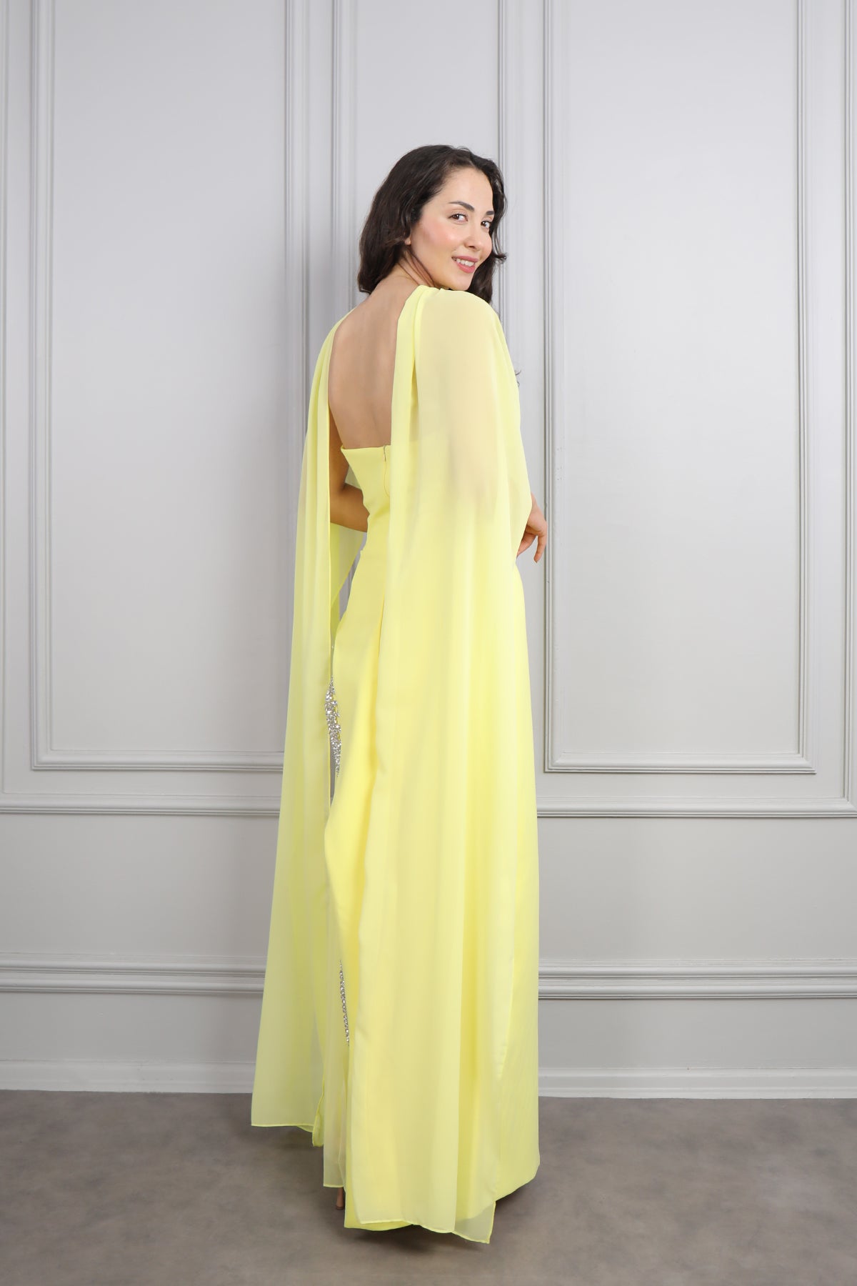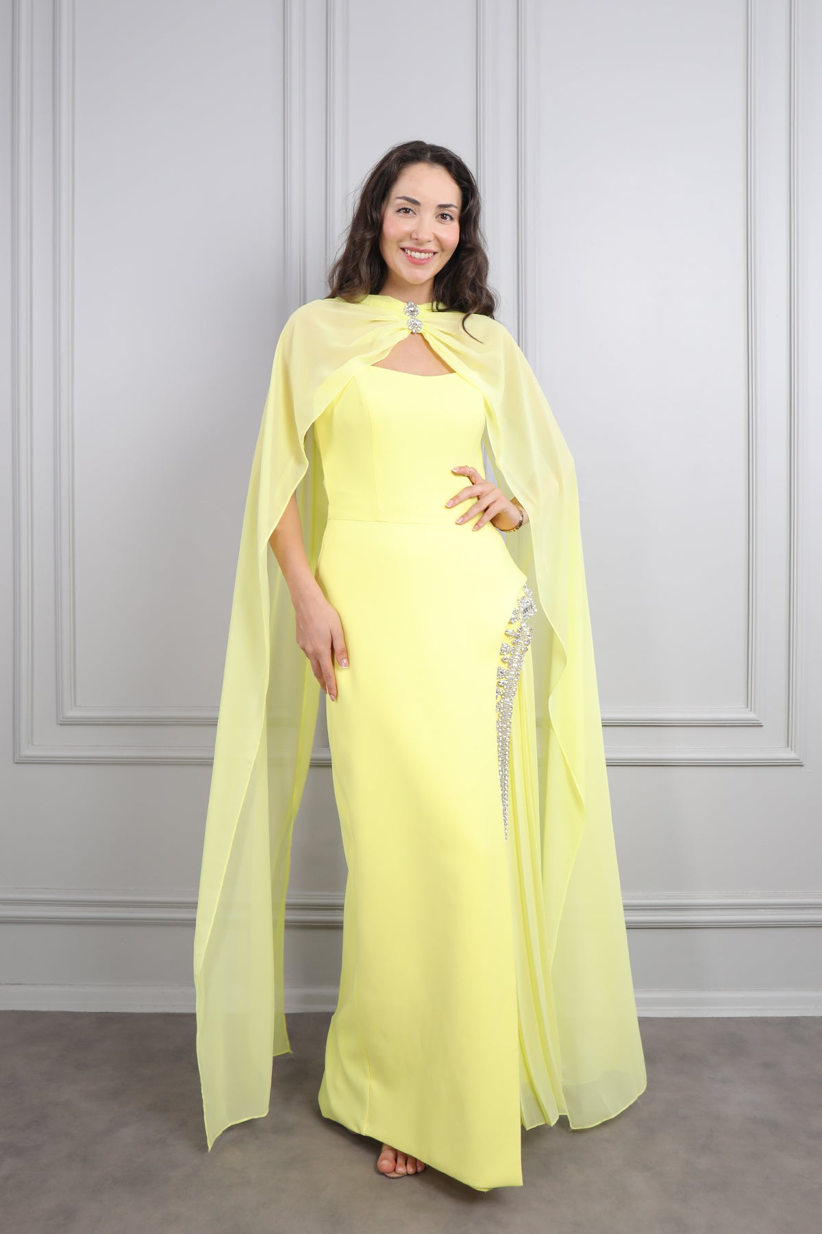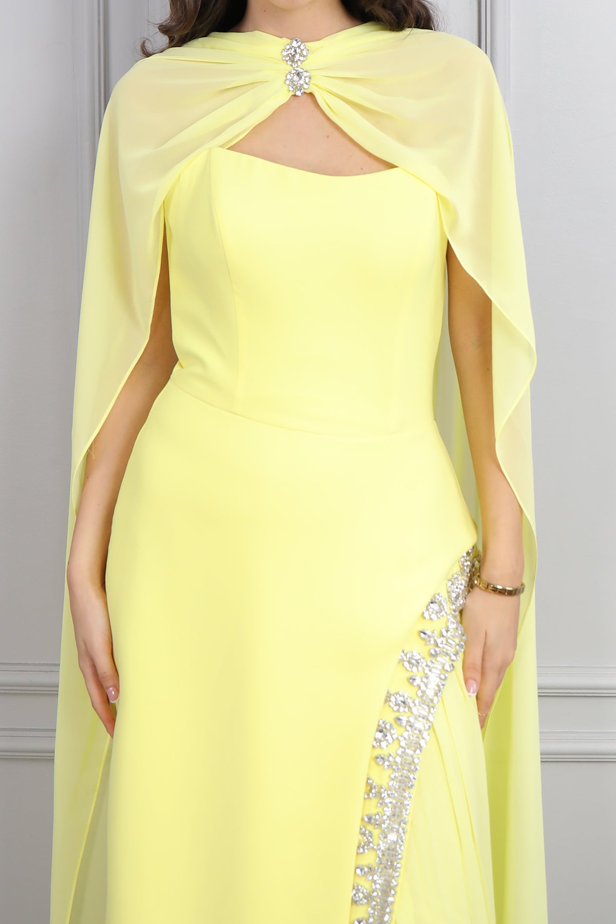 Straplez Eteği Taş İşlemeli Fular Detaylı Abiye Sarı Özellikleri