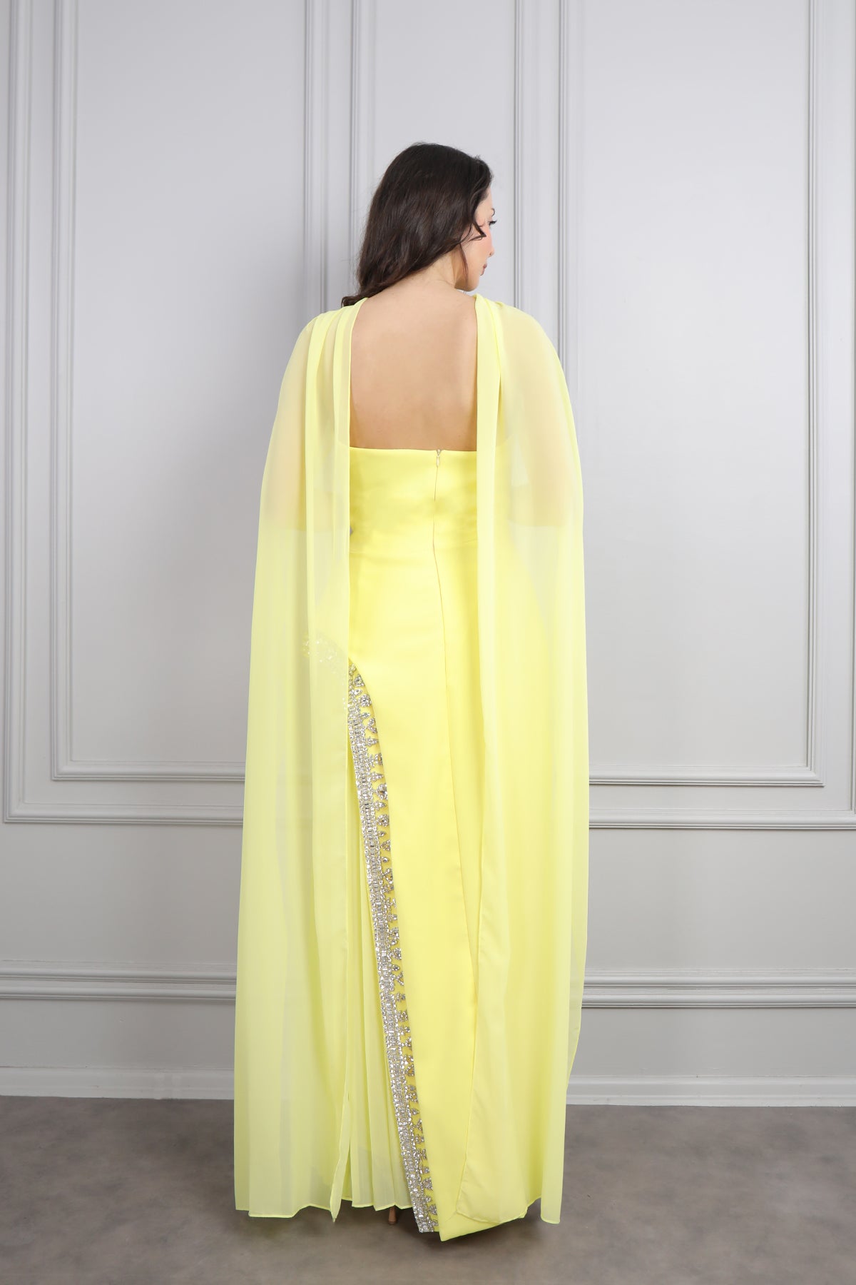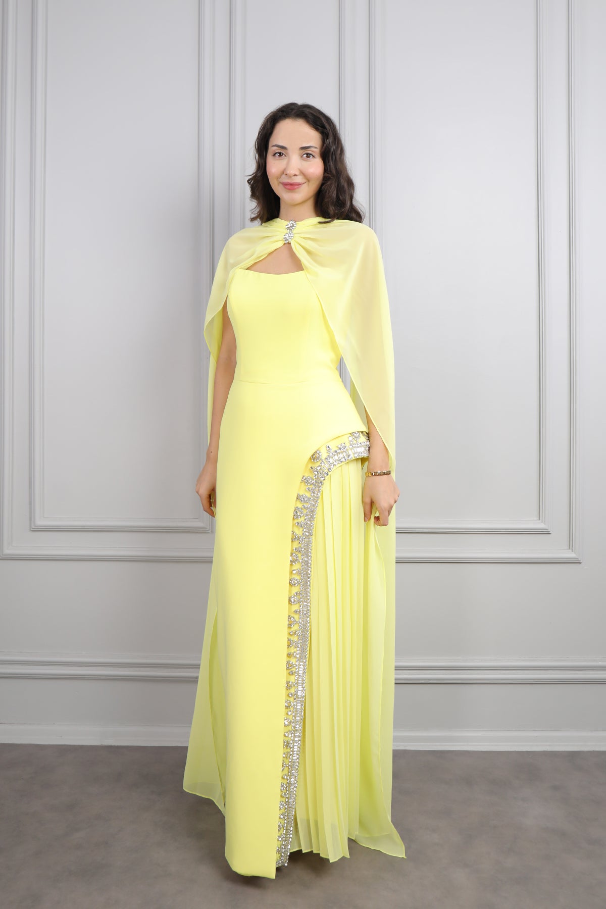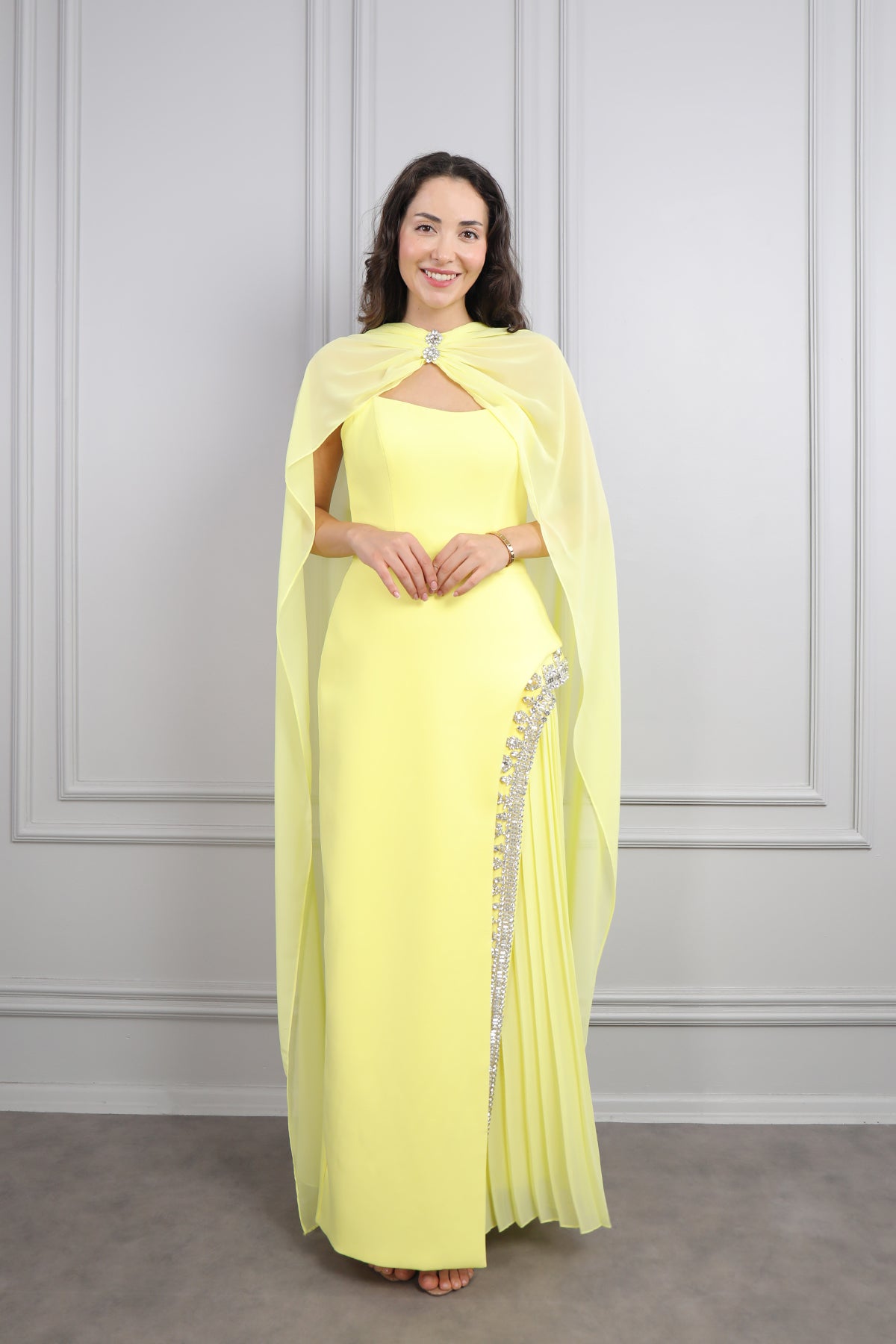 Straplez Eteği Taş İşlemeli Fular Detaylı Abiye Sarı Özellikleri