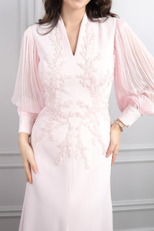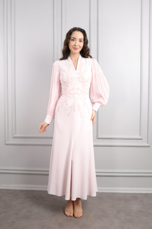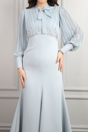 Hakim yaka elbise hafif balon kolları ve belindeki kuşak detayıyla ön kısmı katlanarak kapanmaktadır. İçerisinde bulunan lacivert ince astar elbiseyle bütünleştirilirken özel günlerinizde tercih etmeniz ideal bir tercih olacaktır.