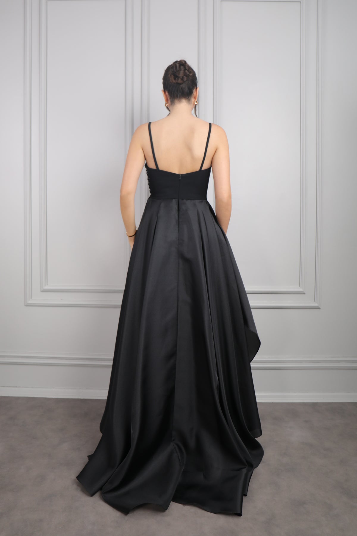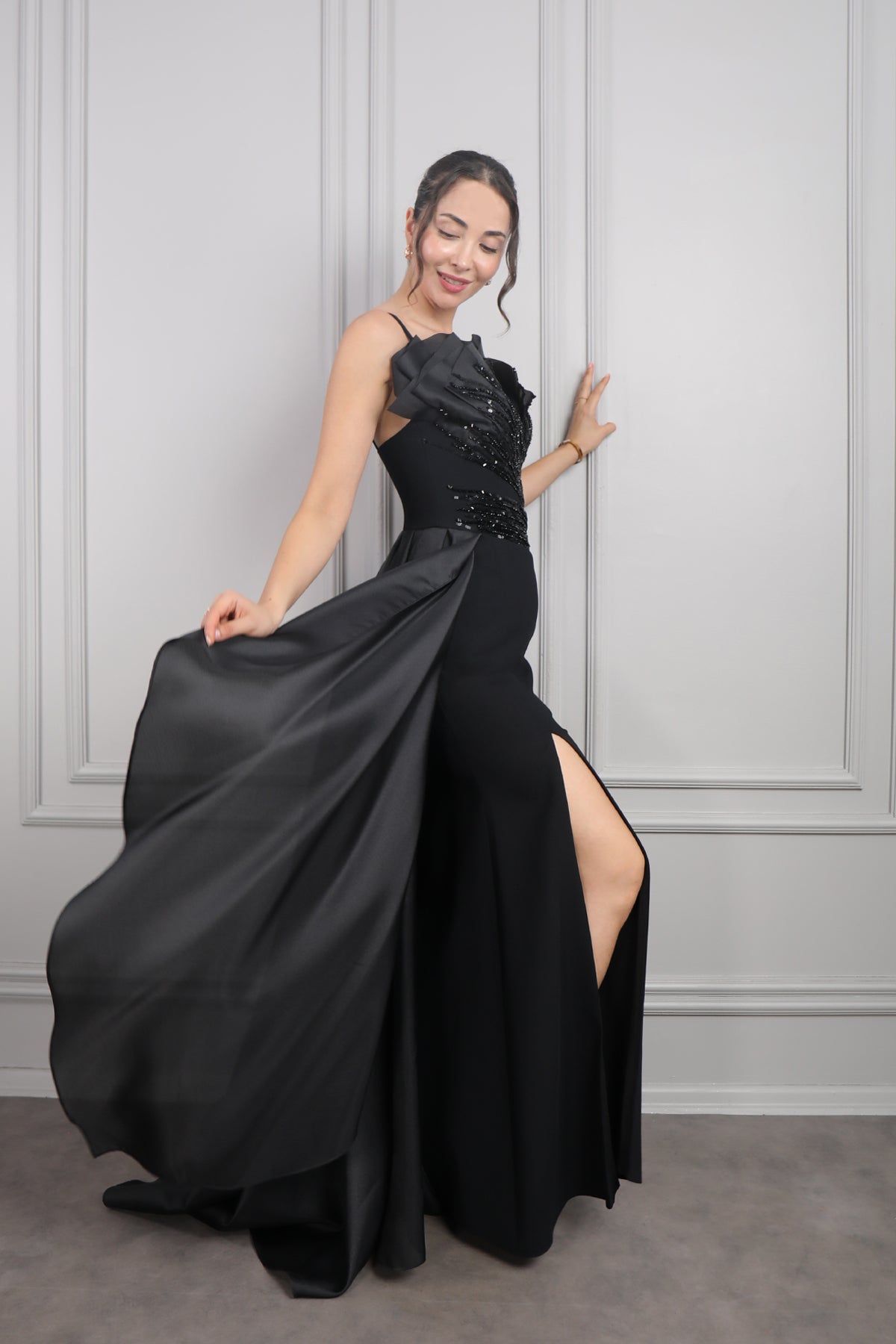 Boncuk İşlemeli Fırfır Detaylı Belden Pelerinli Büyük Beden Abiye Siyah Özellikleri