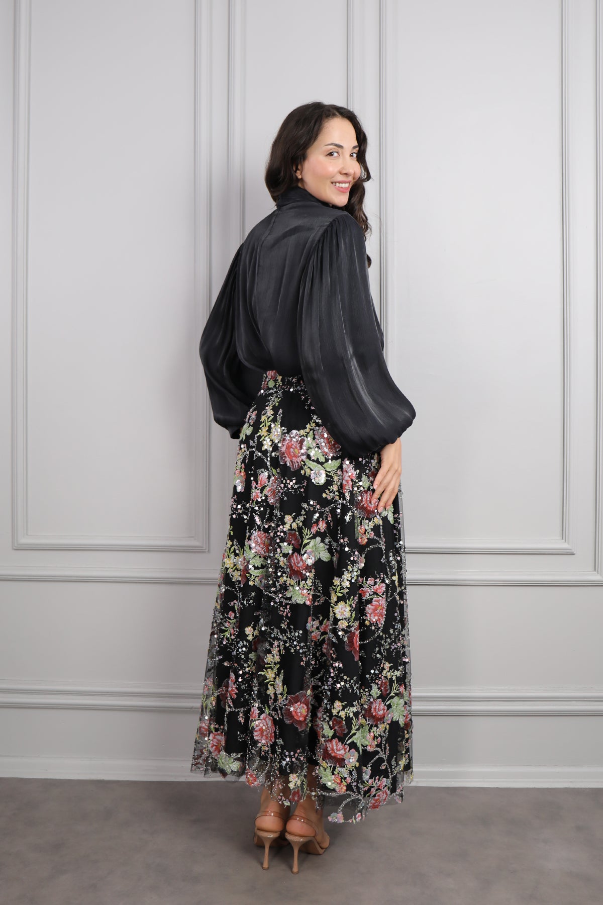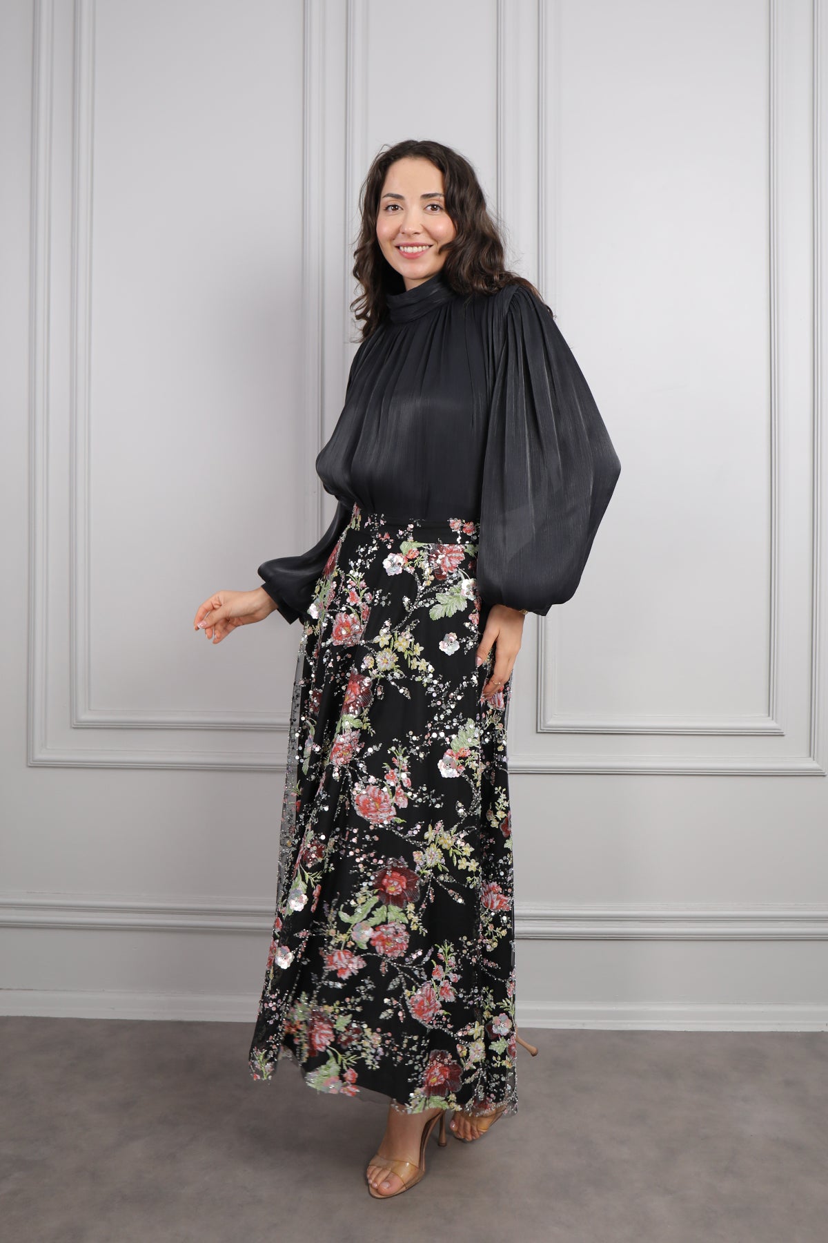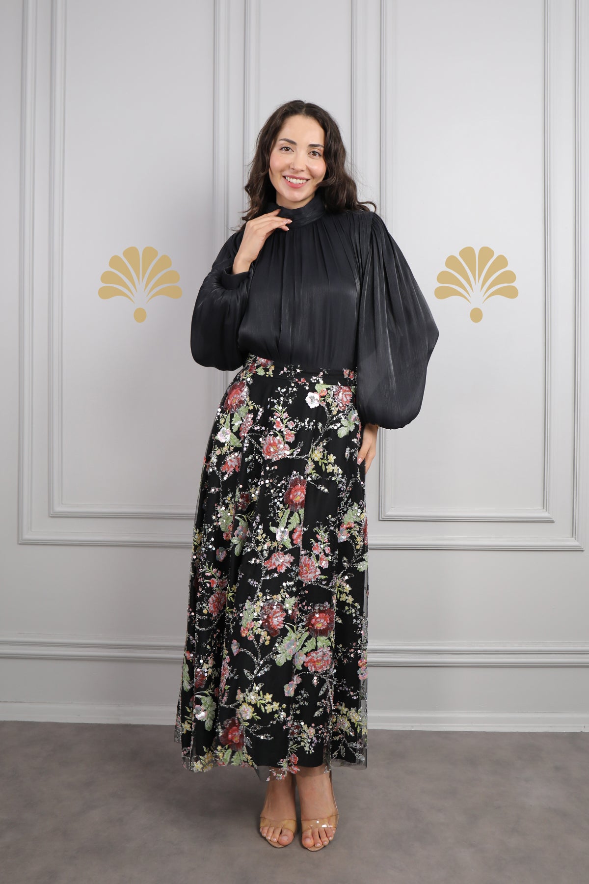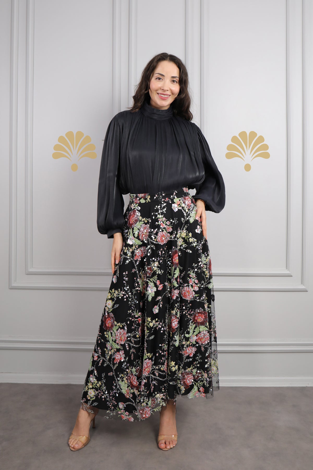 Romantik ve zarif bir tarzın en etkileyici yansımalarından biri olan bu Hakim Yaka Balon Kol Eteği Boncuk İşlemeli Etek Takımı, hem günlük şıklıkta hem de özel davetlerde kullanıma uygun modern bir seçkidir. Siyah saten dokulu hakim yaka bluz, dökümlü yapısı ve balon kollarıyla asil bir görünüm sunarken, eteği tamamlayan çiçek desenli ve boncuk işlemeli detaylar ise feminen bir şıklık kazandırıyor. Desenli tül etek, uçuşan yapısı ve göz alıcı renk geçişleriyle adeta çiçek bahçesinden ilham alıyor. Bel hizasında oturan kalıbı sayesinde vücut formunu dengelerken, ince ve zarif boncuk işlemeleriyle her adımda ışıltı saçıyor. Özellikle ilkbahar ve yaz aylarında davet, iftar yemeği ya da özel buluşmalarda tercih edilebilecek bu etek takımı; hem konfor hem de estetik arayan kadınlar için ideal bir tercihtir.
