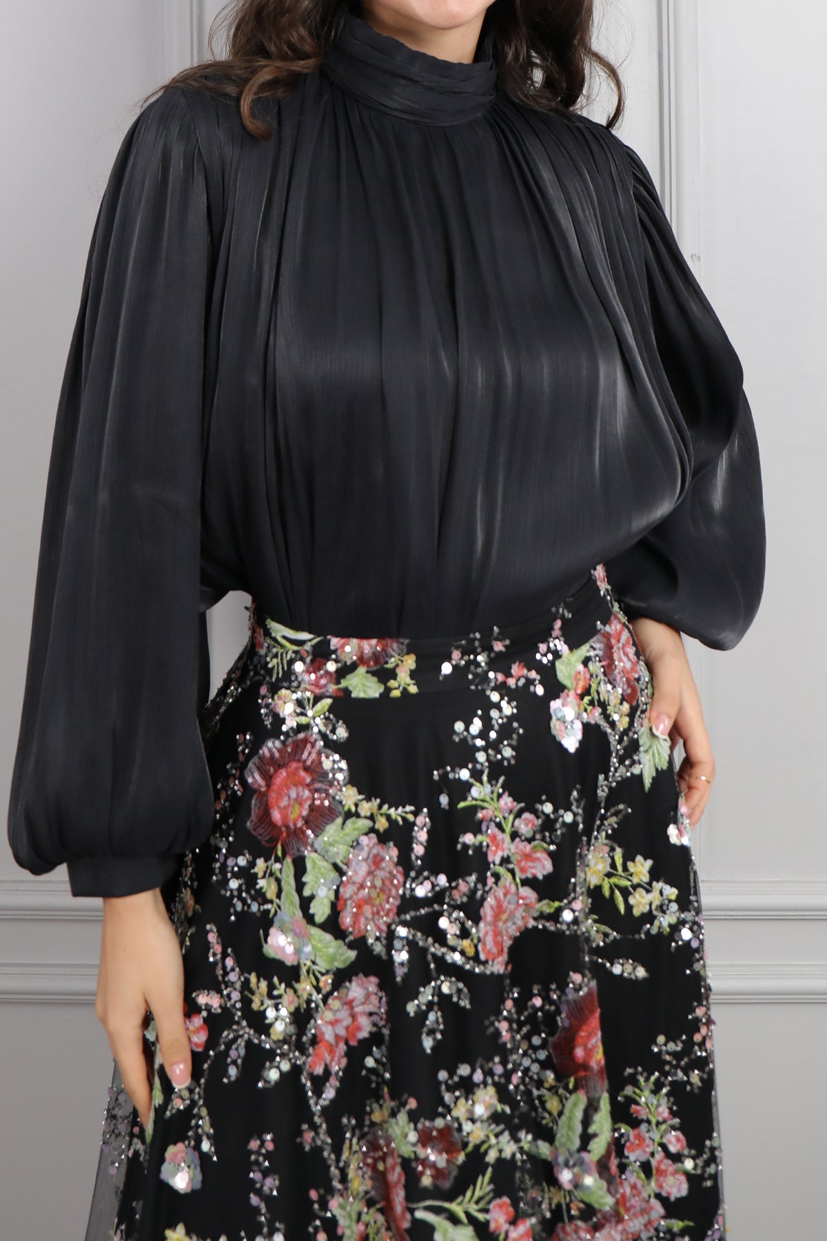 Hakim Yaka Balon Kol Eteği Boncuk İşlemeli Etek Takım Siyah Özellikleri