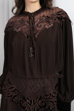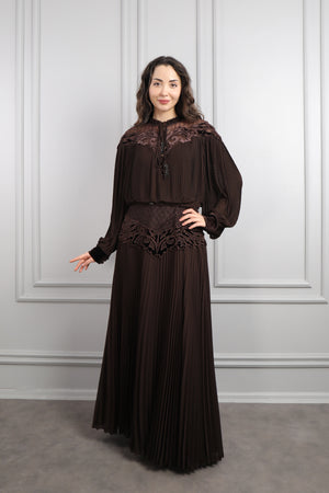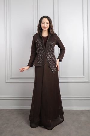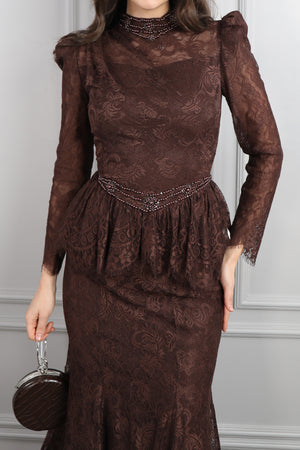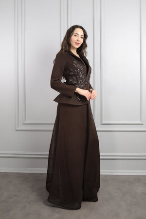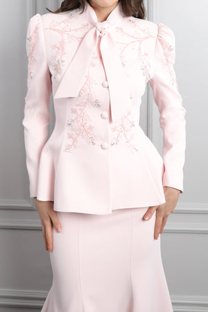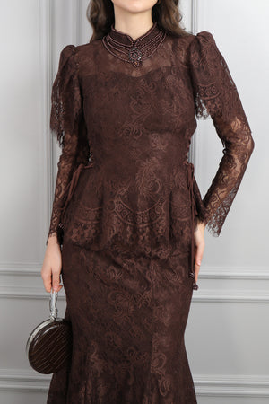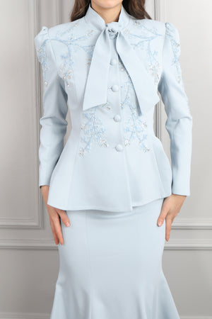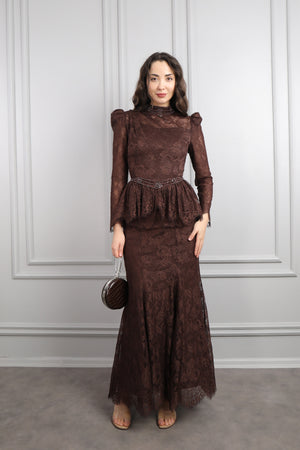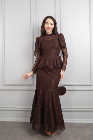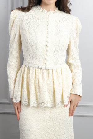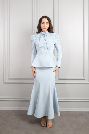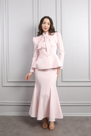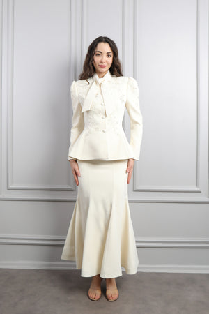 Kare yaka ceketimizin ön kısmındaki kalp detaylı düğmeleriyle dikkat çekerken yan kısımlarına eklenen fiyonklarla süslenerek hareketlendirilmiştir. Takımın parçası olan dantel kumaş eteğiyle bütünlük sunarken tam boy olarak tasarlanmıştır. Özel gün veya davetlerinizde tercihe debileceğiniz etek takımımızı seçmeniz sizler için ideal bir tercih olacaktır.
