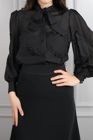 Kare Yaka Düğmesi Kalp Görünümlü Fiyonk Detaylı Etek Takım Siyah