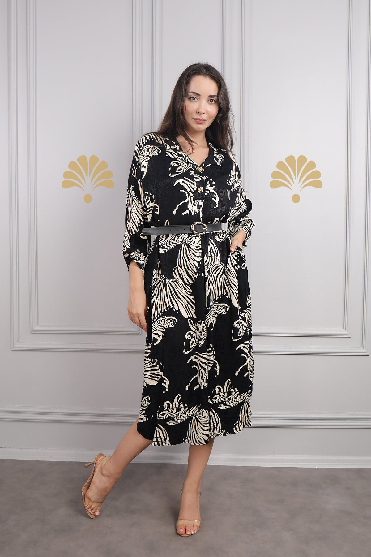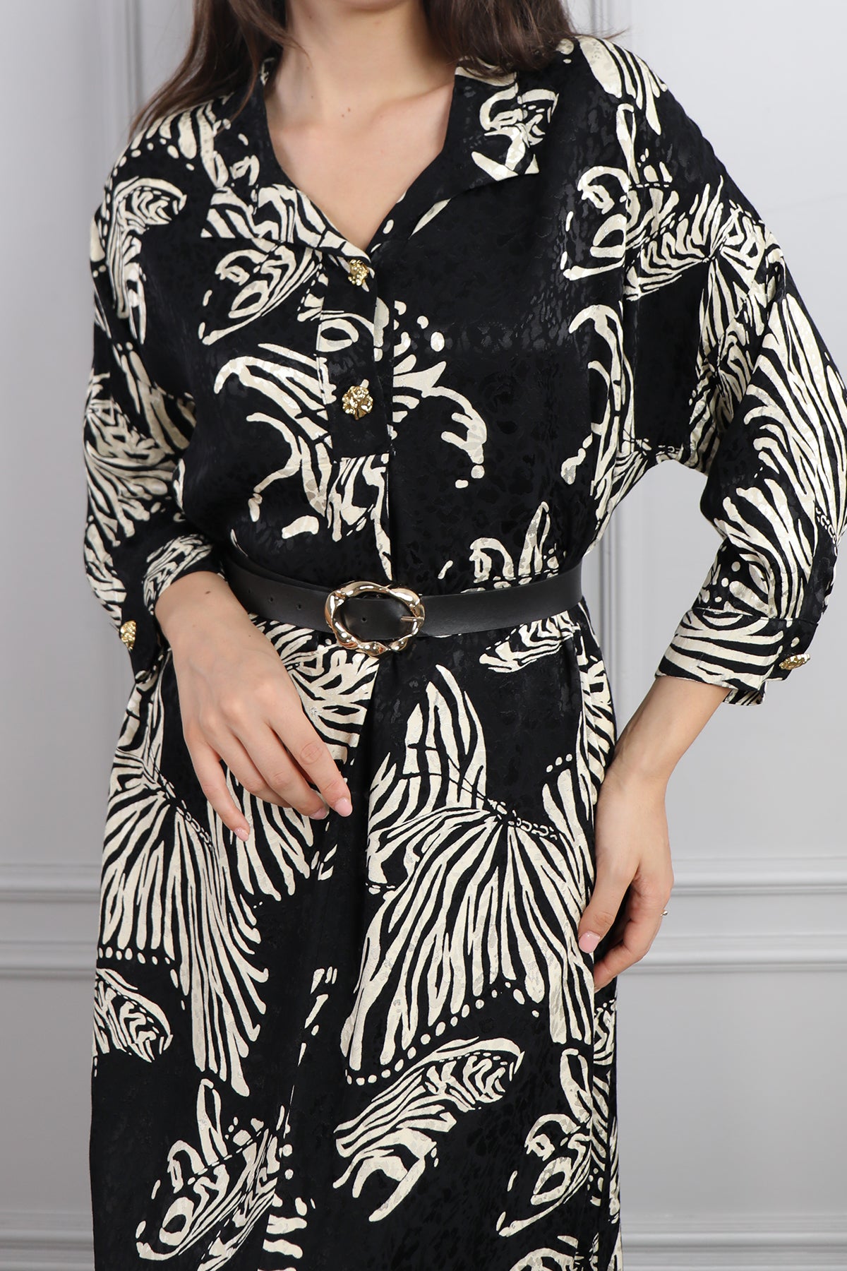 Önü Düğmeli Beli Kemerli Desenli Büyük Beden Elbise Siyah