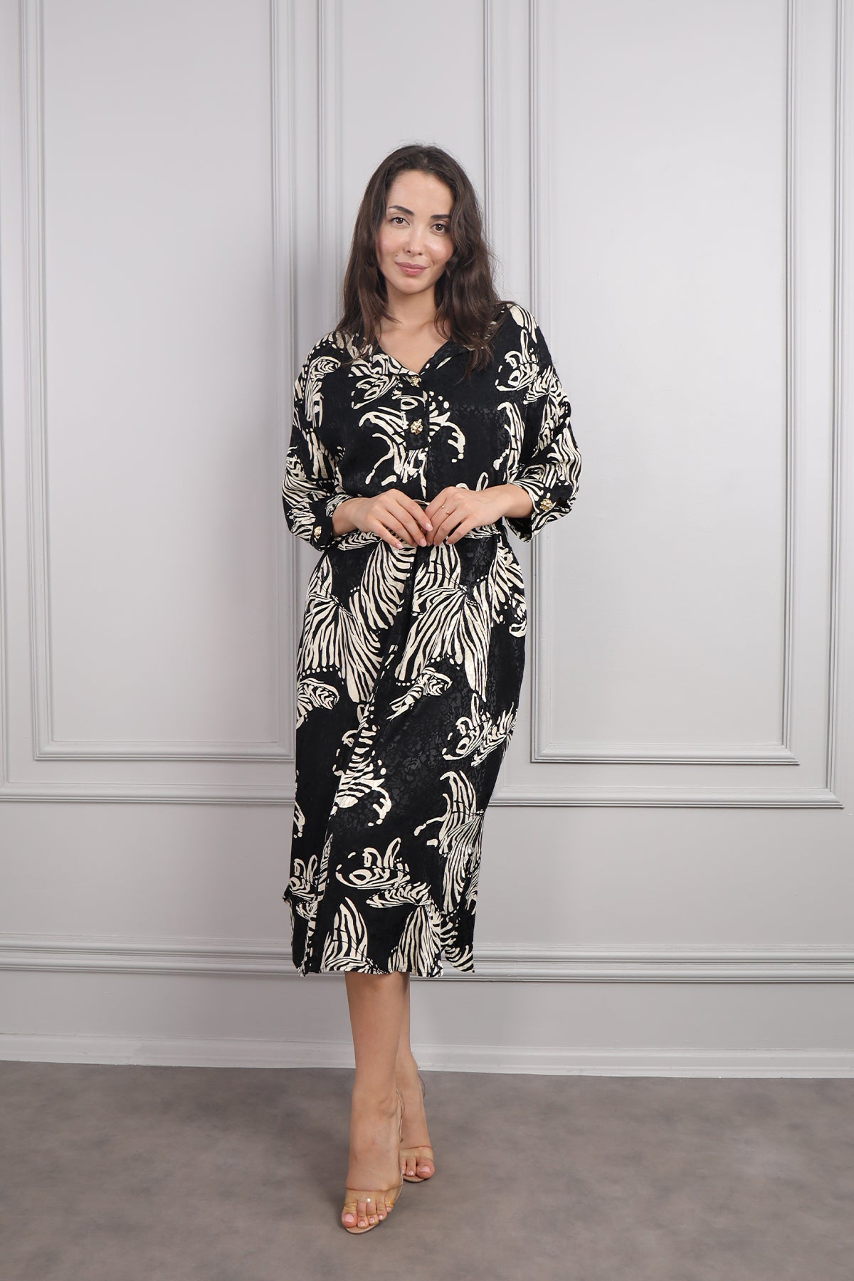 Önü Düğmeli Beli Kemerli Desenli Büyük Beden Elbise Siyah Özellikleri