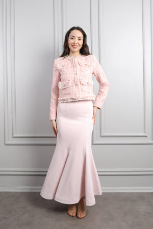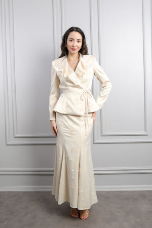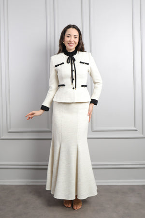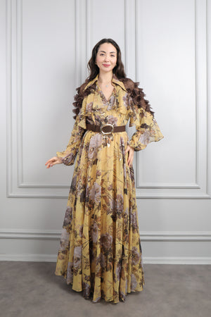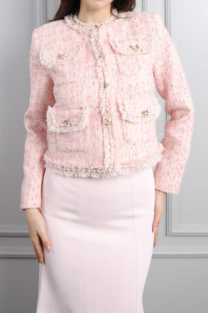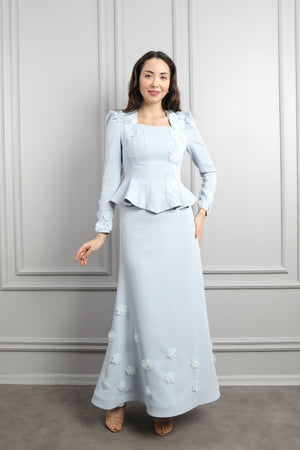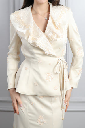 Derin v yakalı ceket transparan kumaşı ve yere kadar uzanarak kabaran tasarımıyla dikkat çekmektedir. Üzerine işlenen taşlarla zarif bir görüntü oluşturan ceketimiz kombinlerinizin yıldız parçası olacaktır.