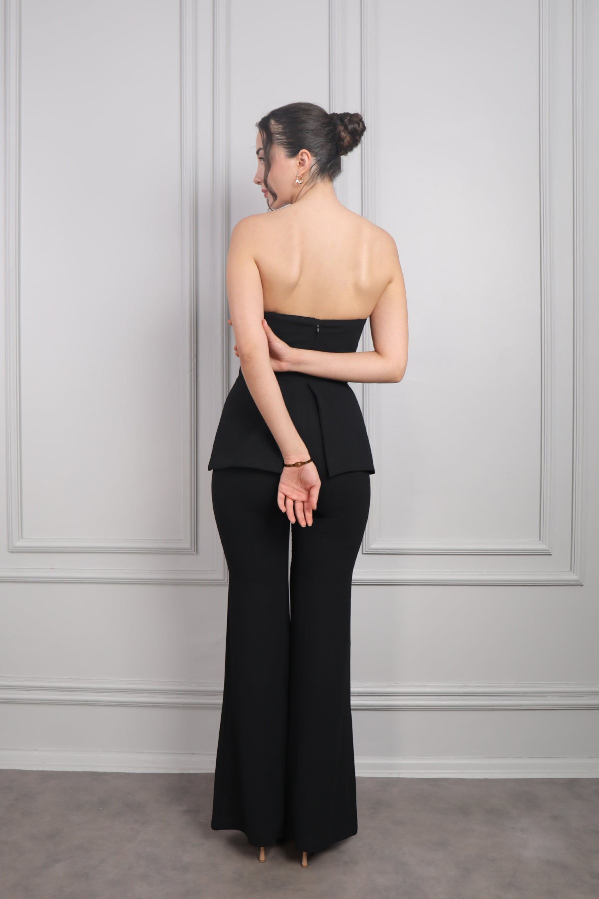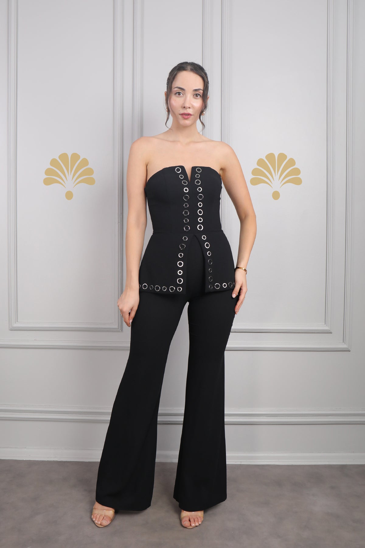 Straplez Metal Detaylı Korse Görünümlü Tulum Siyah
