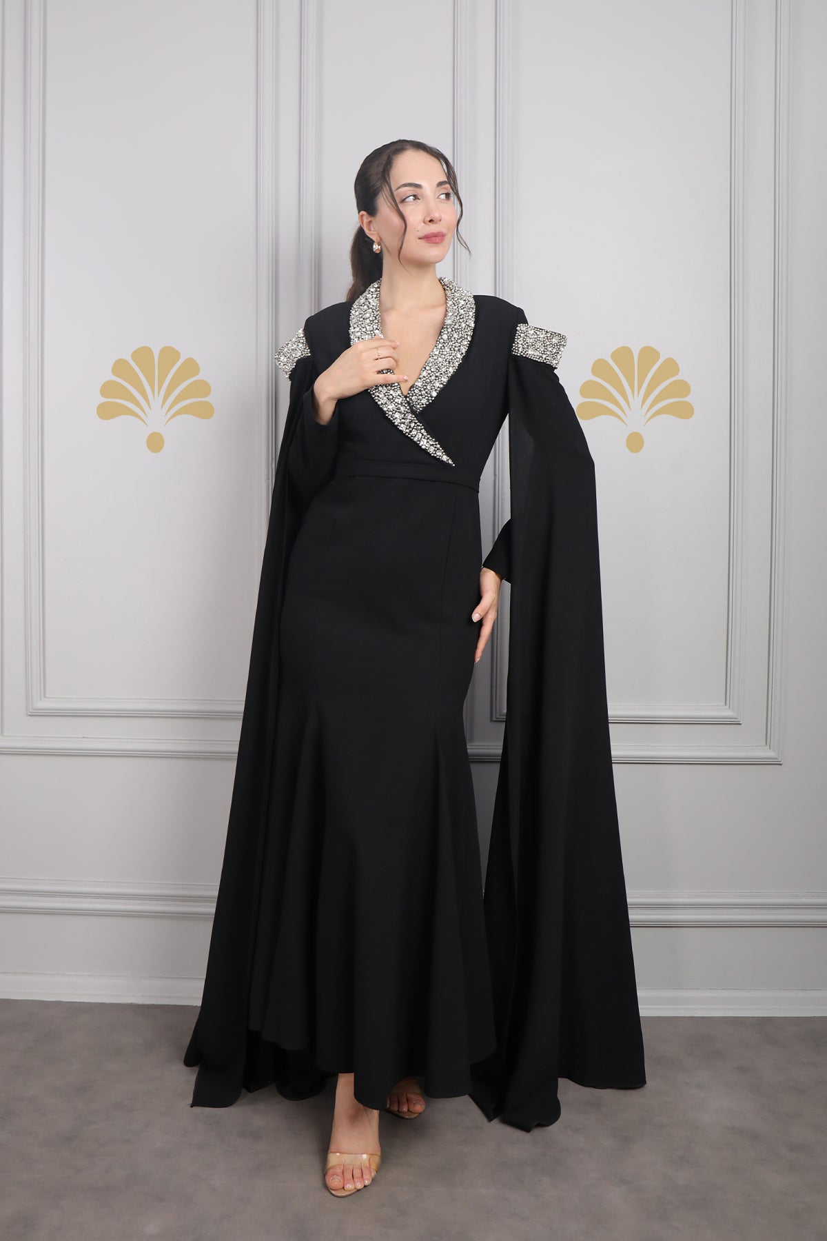 Taş Detaylı Pelerinli Abiye Siyah Özellikleri