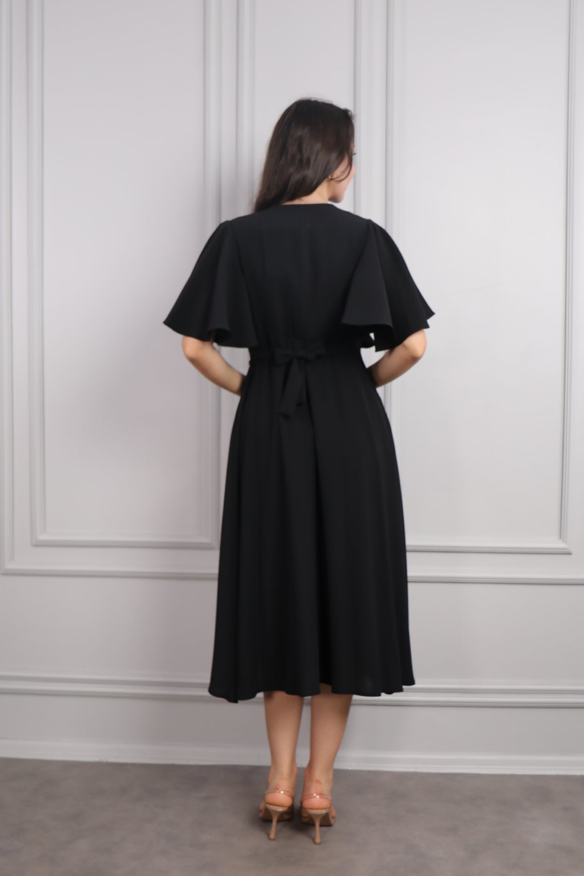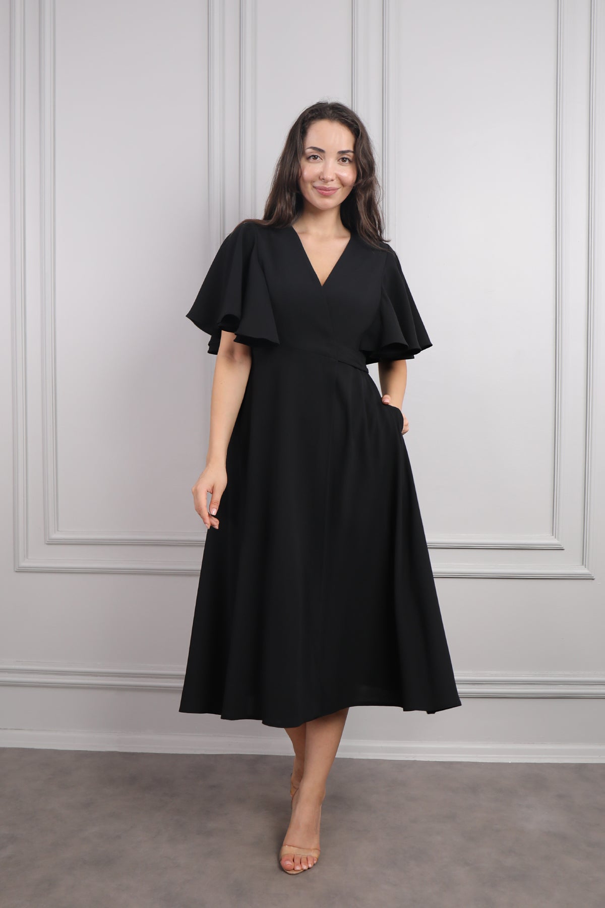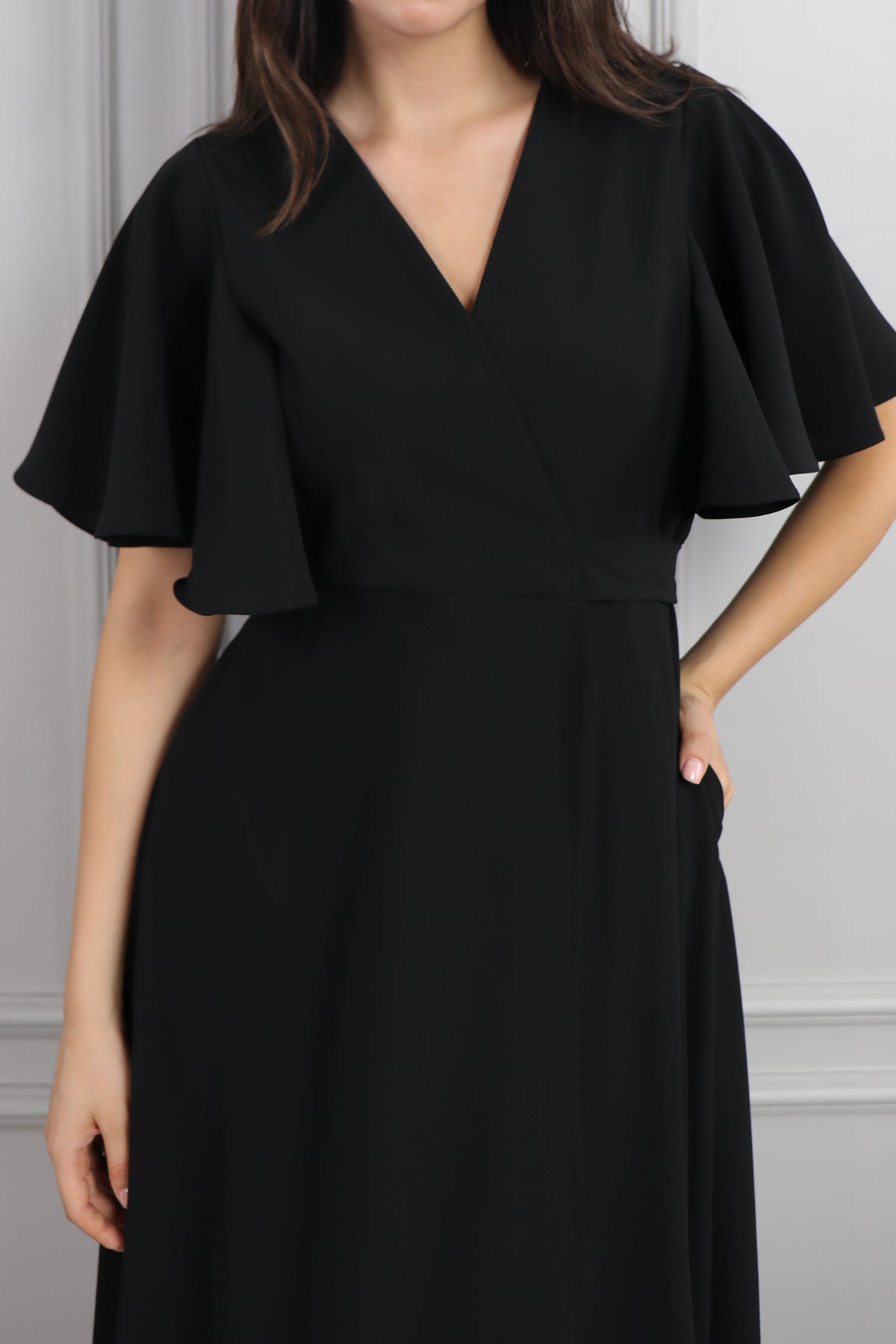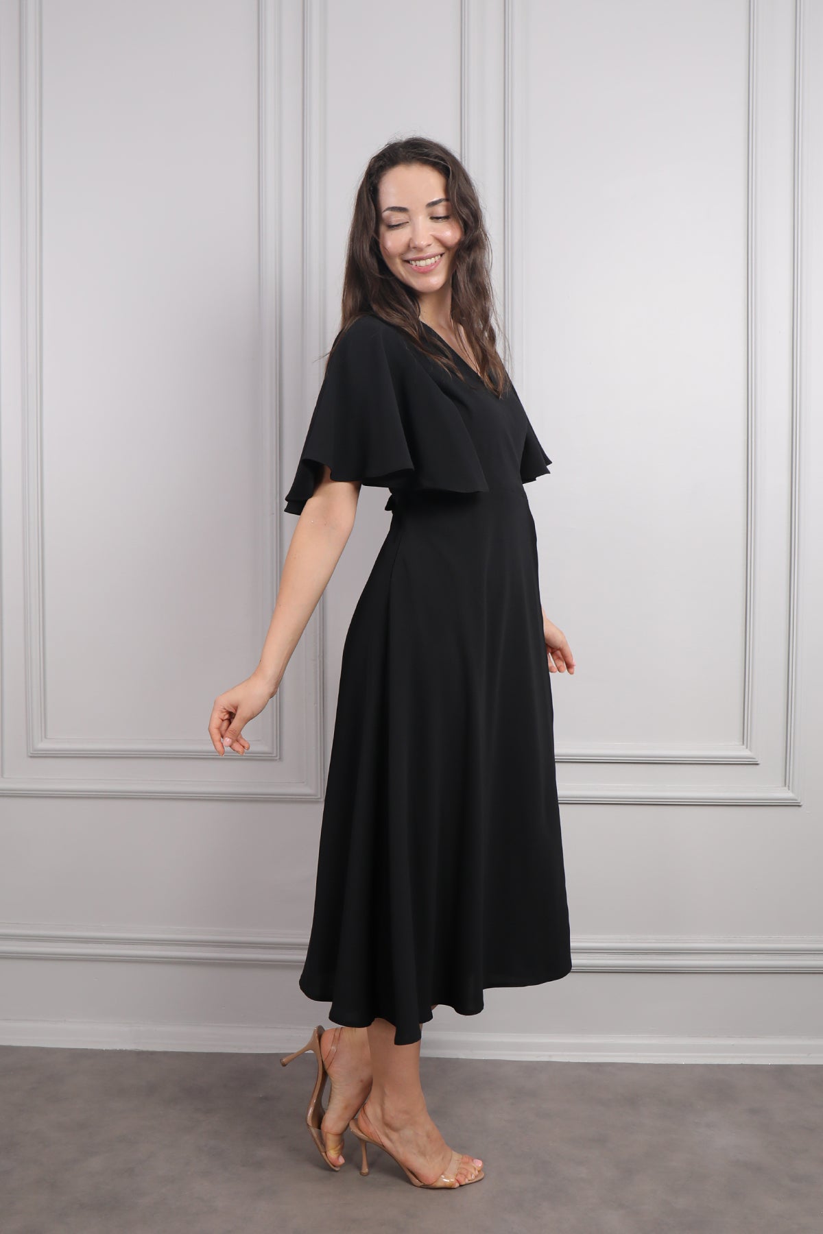 V Yaka Yarasa Kol Midi Boy Elbise Siyah