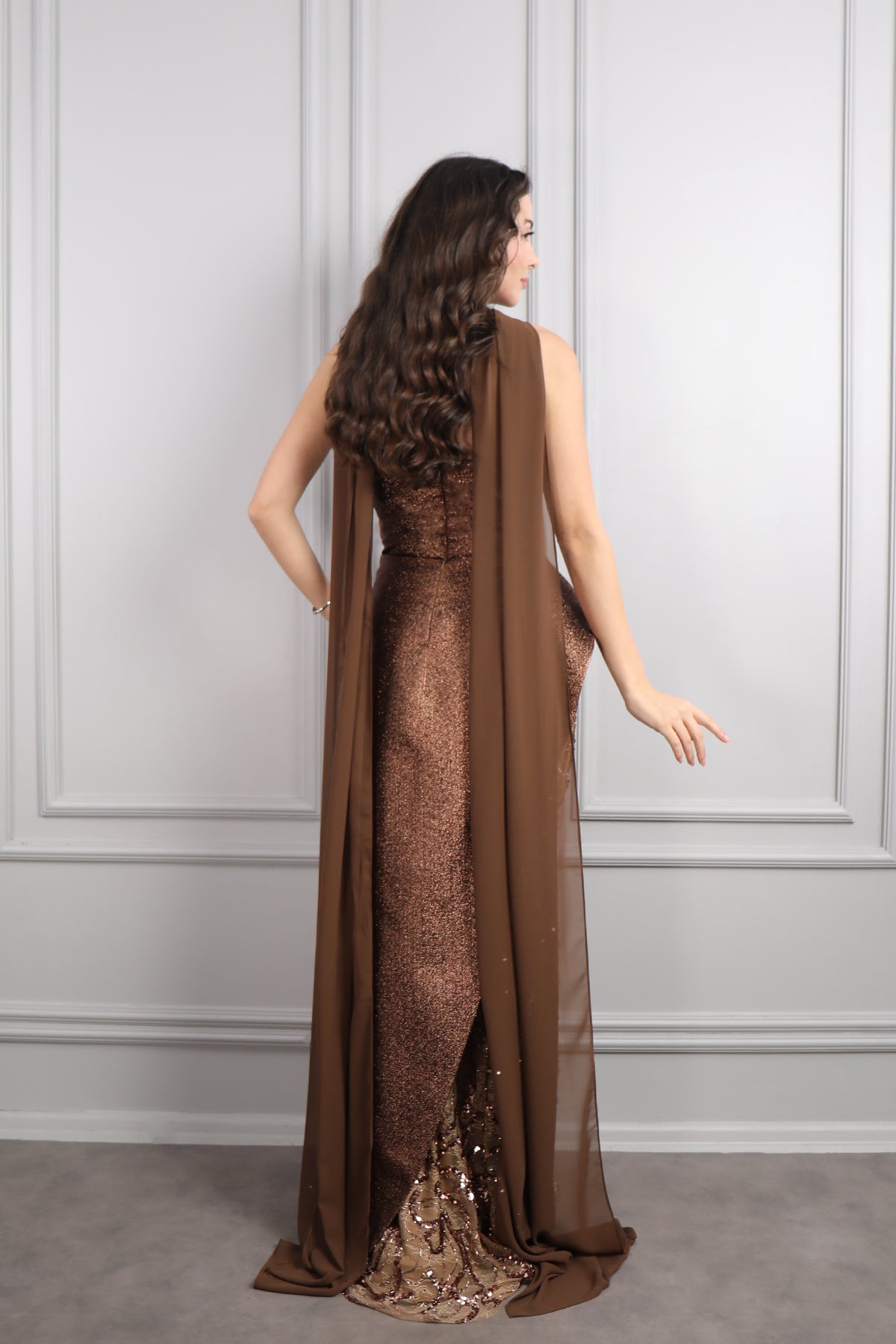 Straplez Asimetrik Gold İşlemeli Fular Detaylı Kuyruklu Abiye Kahve Özellikleri